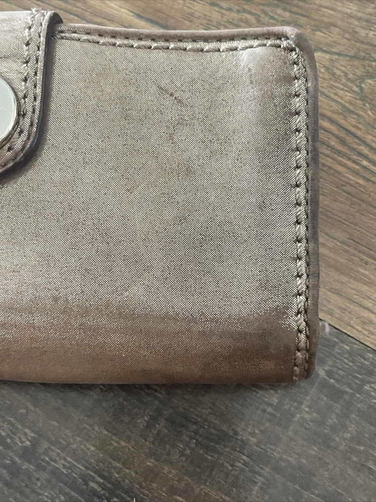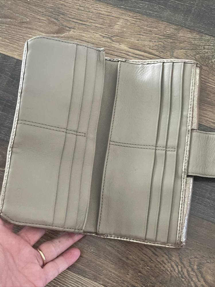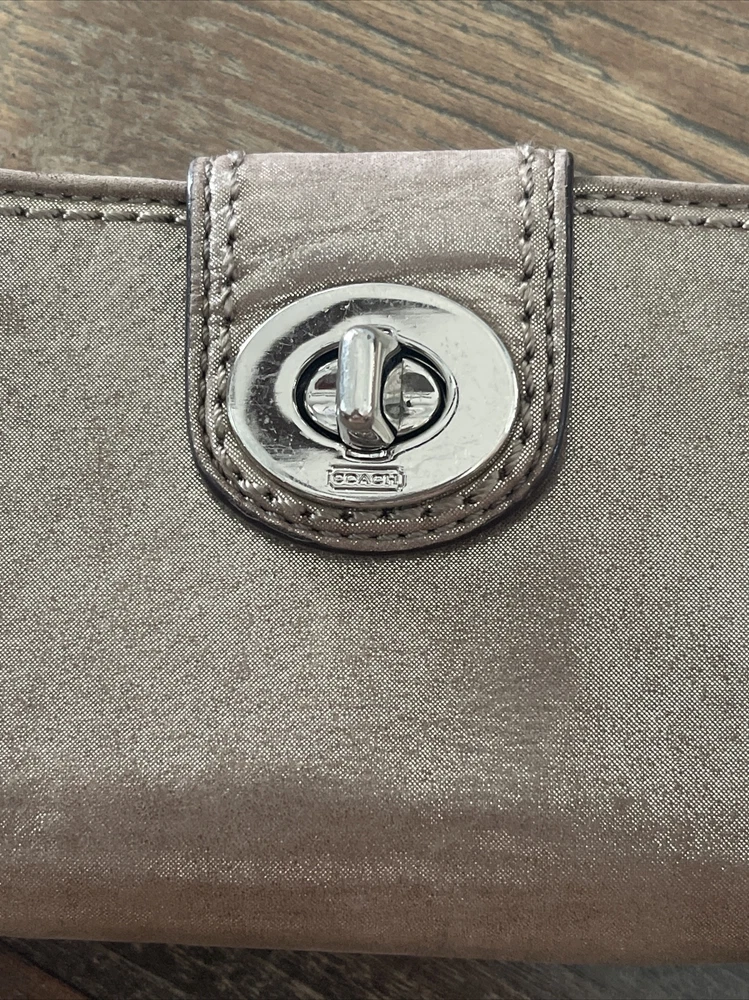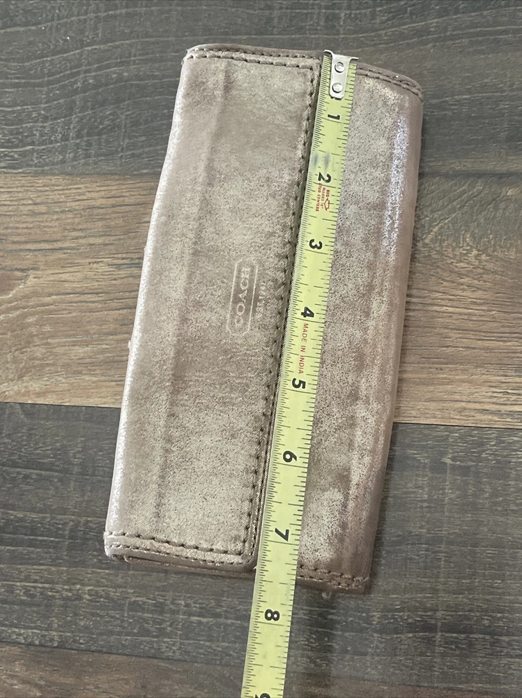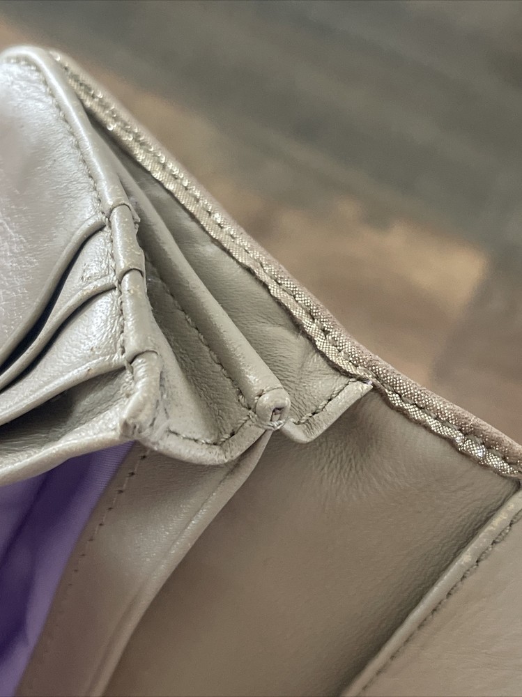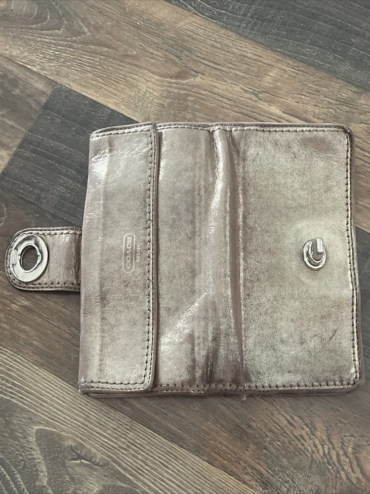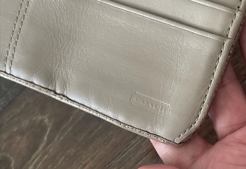 Small area with repair See close up Large and nice lightweight Coach wallet outer pockets -12 credit card slots- inner slots