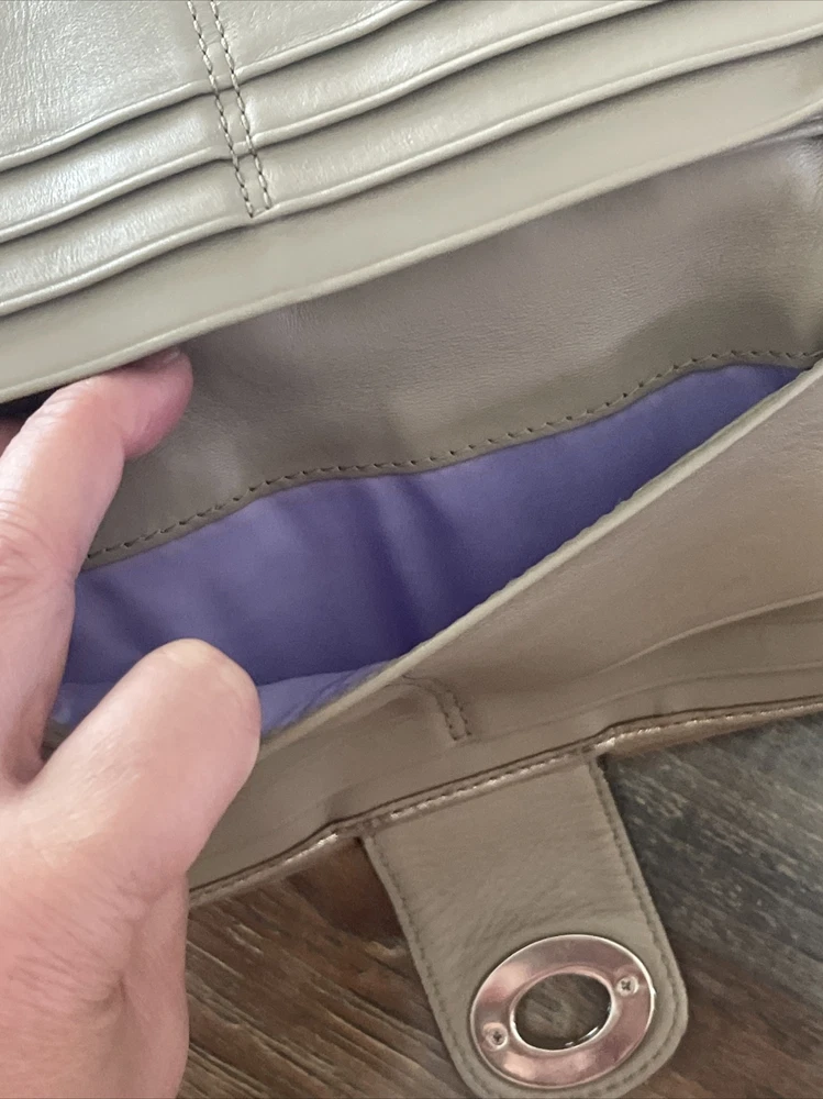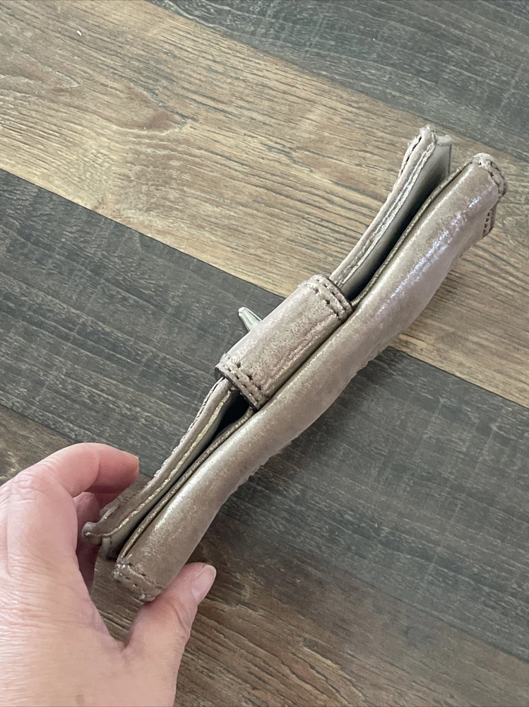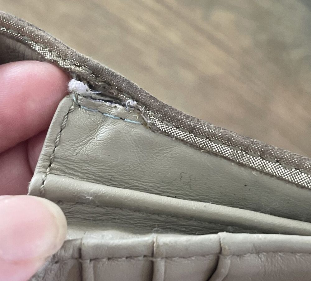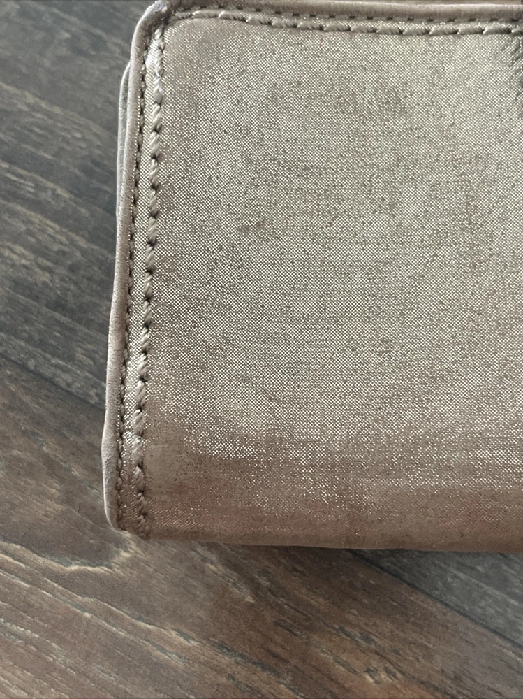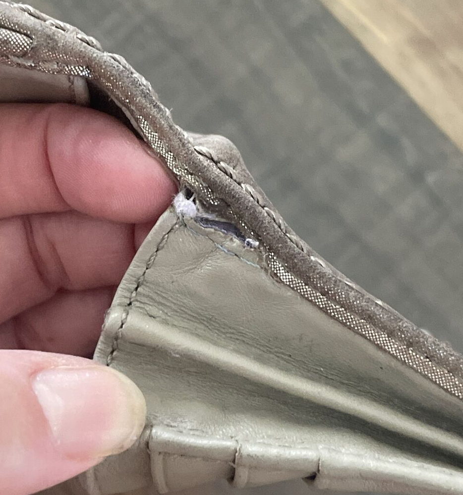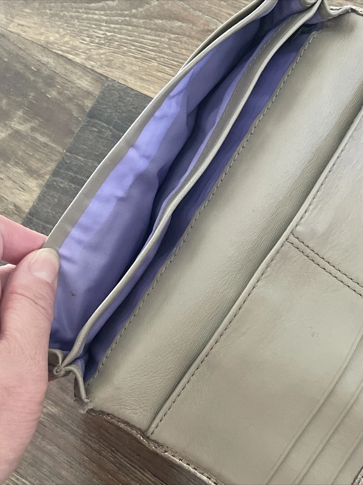 Small area with repair See close up Large and nice lightweight Coach wallet outer pockets -12 credit card slots- inner slots