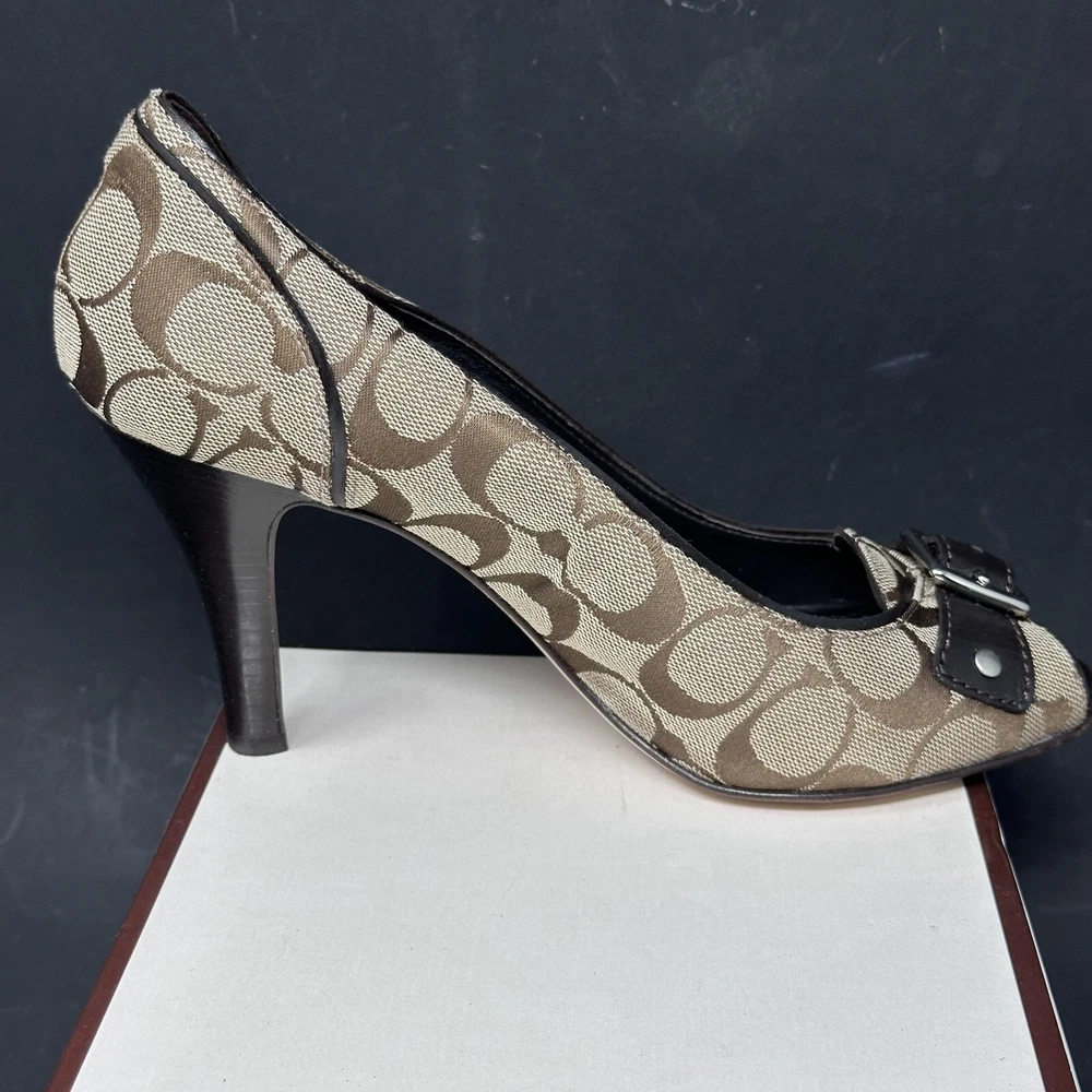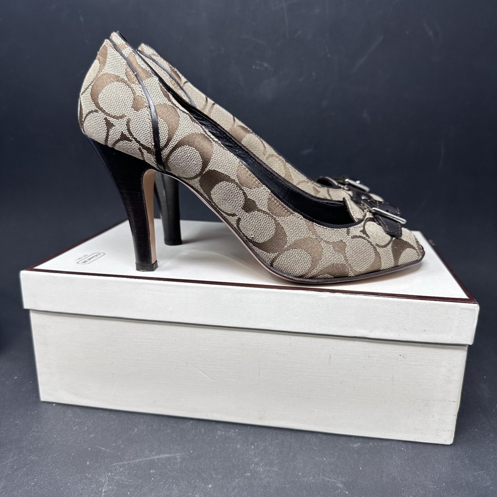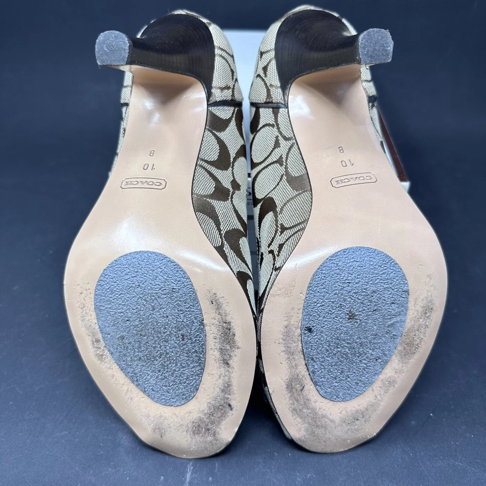 Product Line:Coach SignatureUPC:Does not applyOutsole Material:LeatherTheme:SignatureCountry/Region of Manufacture:ItalyStyle:PumpClosure:Slip OnPattern:SignatureSeller Notes:“Good Condition - See Pictures for Best Description”Vintage:NoShoe Width:BFeatures:LogoAccents:LogoBrand:CoachHeel Style:StilettoDepartment:WomenPersonalize:NoCustomized:NoUS Shoe Size:10gtin13:Does not applyToe Shape:Open ToeColor:BrownInsole Material:LeatherHeel Height:High (3-3.9 in)Type:HeelUpper Material:Fabric