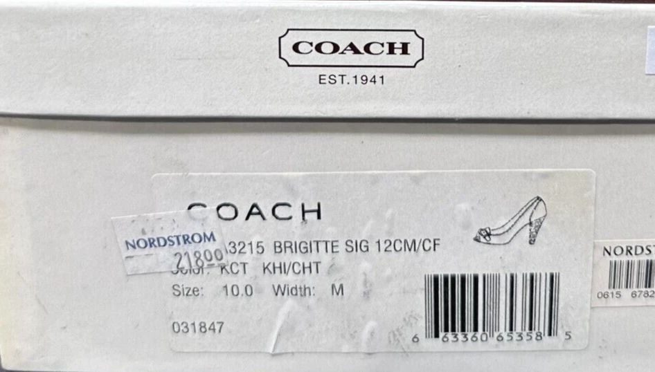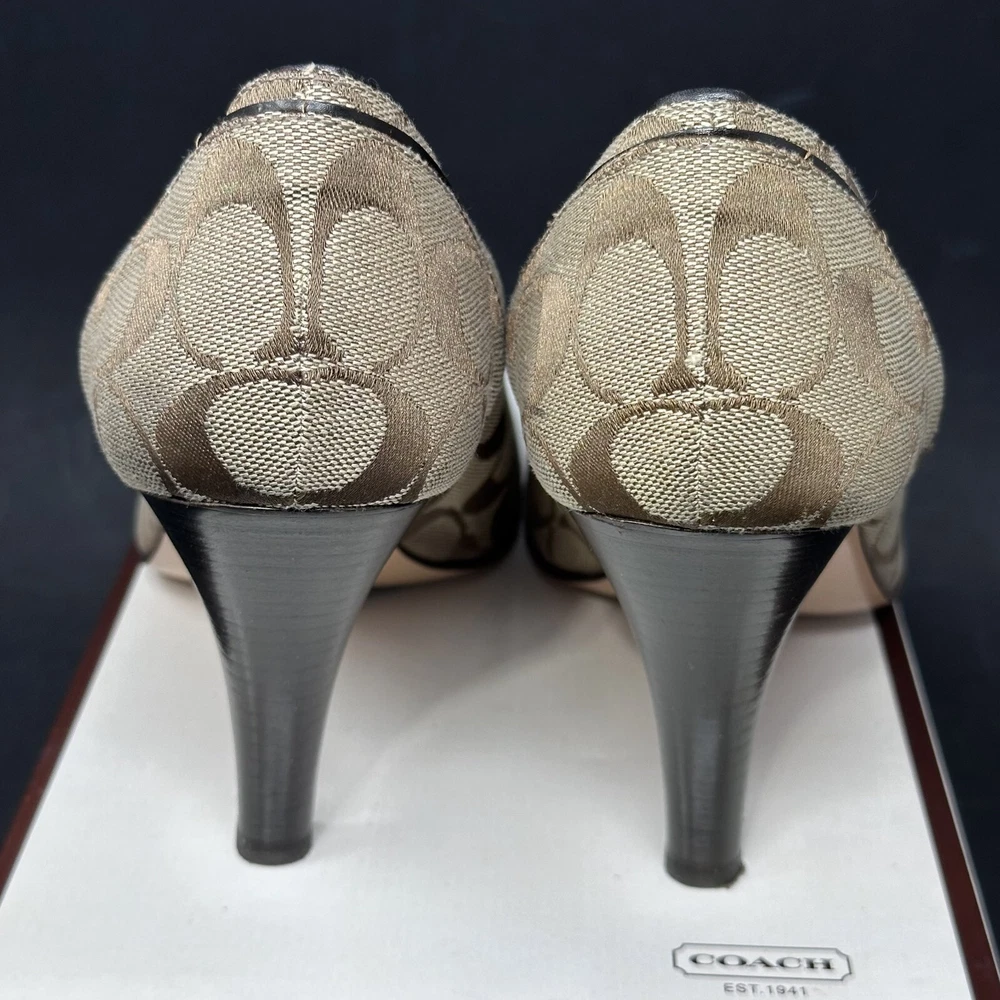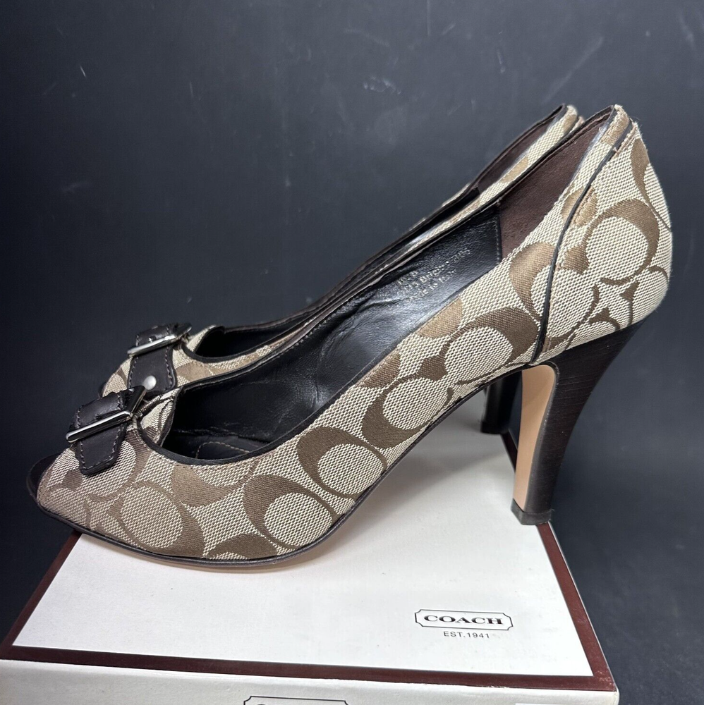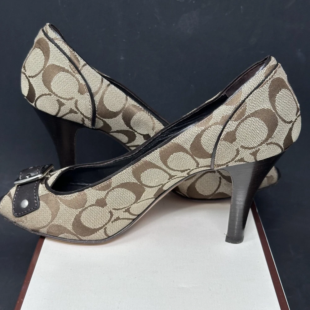 Product Line:Coach SignatureUPC:Does not applyOutsole Material:LeatherTheme:SignatureCountry/Region of Manufacture:ItalyStyle:PumpClosure:Slip OnPattern:SignatureSeller Notes:“Good Condition - See Pictures for Best Description”Vintage:NoShoe Width:BFeatures:LogoAccents:LogoBrand:CoachHeel Style:StilettoDepartment:WomenPersonalize:NoCustomized:NoUS Shoe Size:10gtin13:Does not applyToe Shape:Open ToeColor:BrownInsole Material:LeatherHeel Height:High (3-3.9 in)Type:HeelUpper Material:Fabric