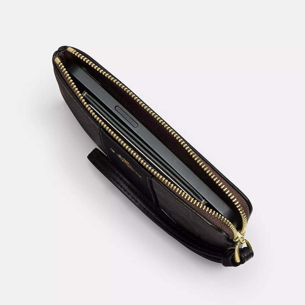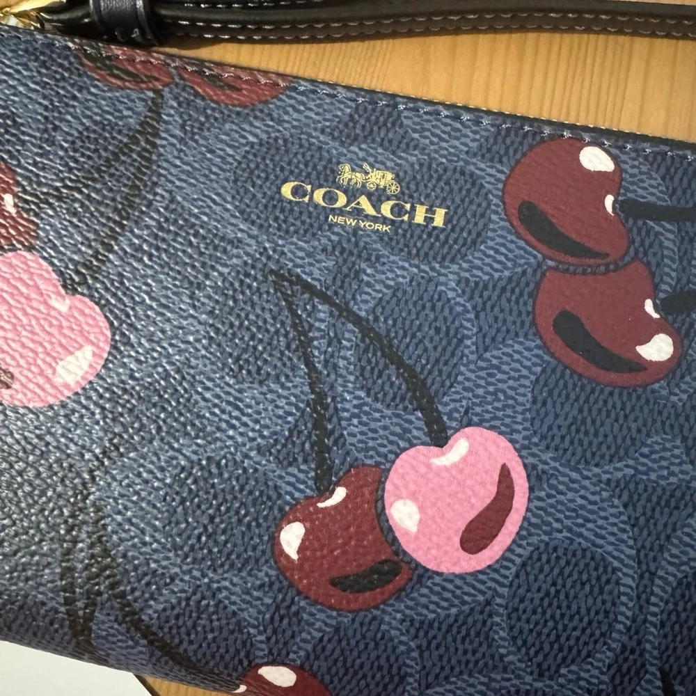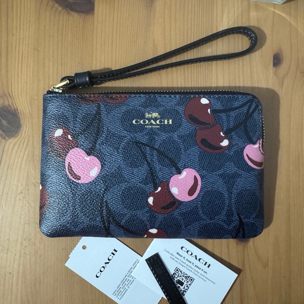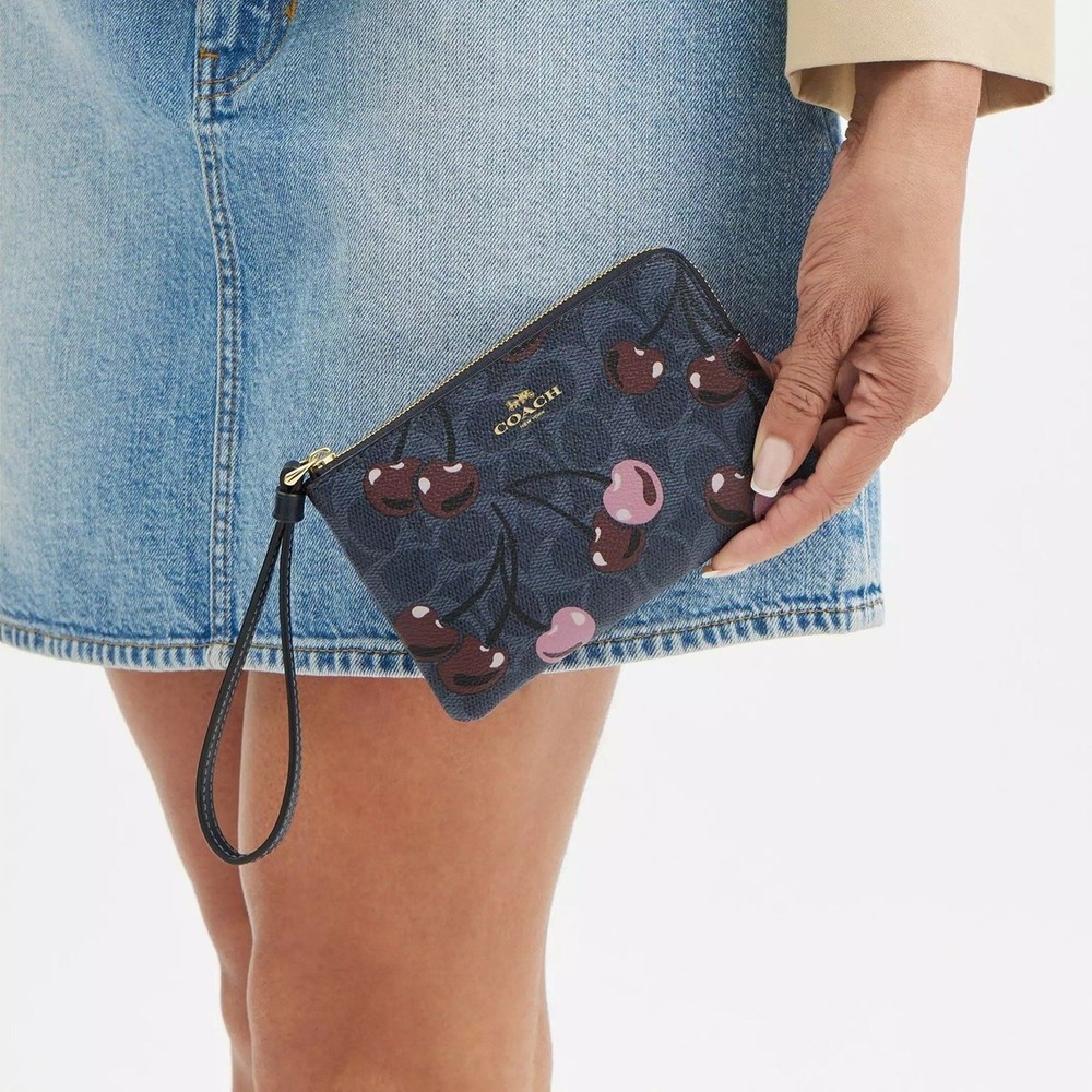 signature canvas/Gold/Denim Multi Product Details Style Number CZ450 Measurements Length: 6.25" Height: 4.0" Width: 0.5" Materials Signature coated canvas Fabric lining Features Two credit card slots Zip-top closure Wrist strap attached the placement of the cherry print may vary