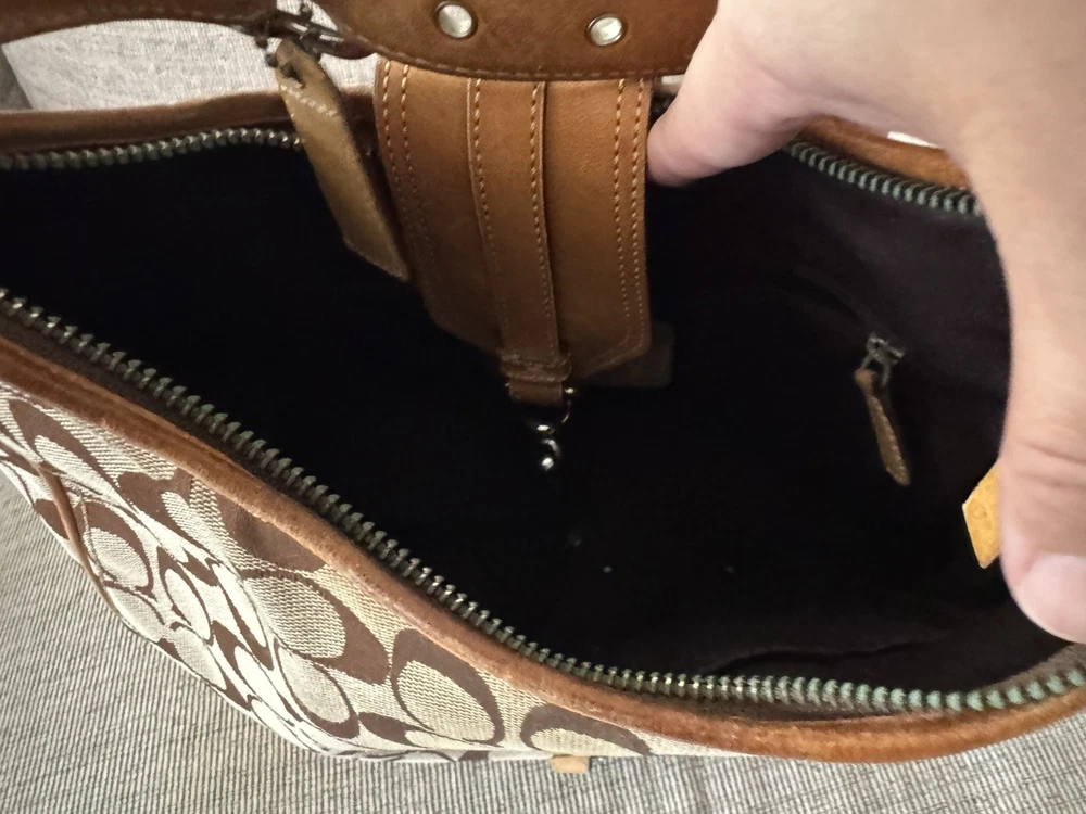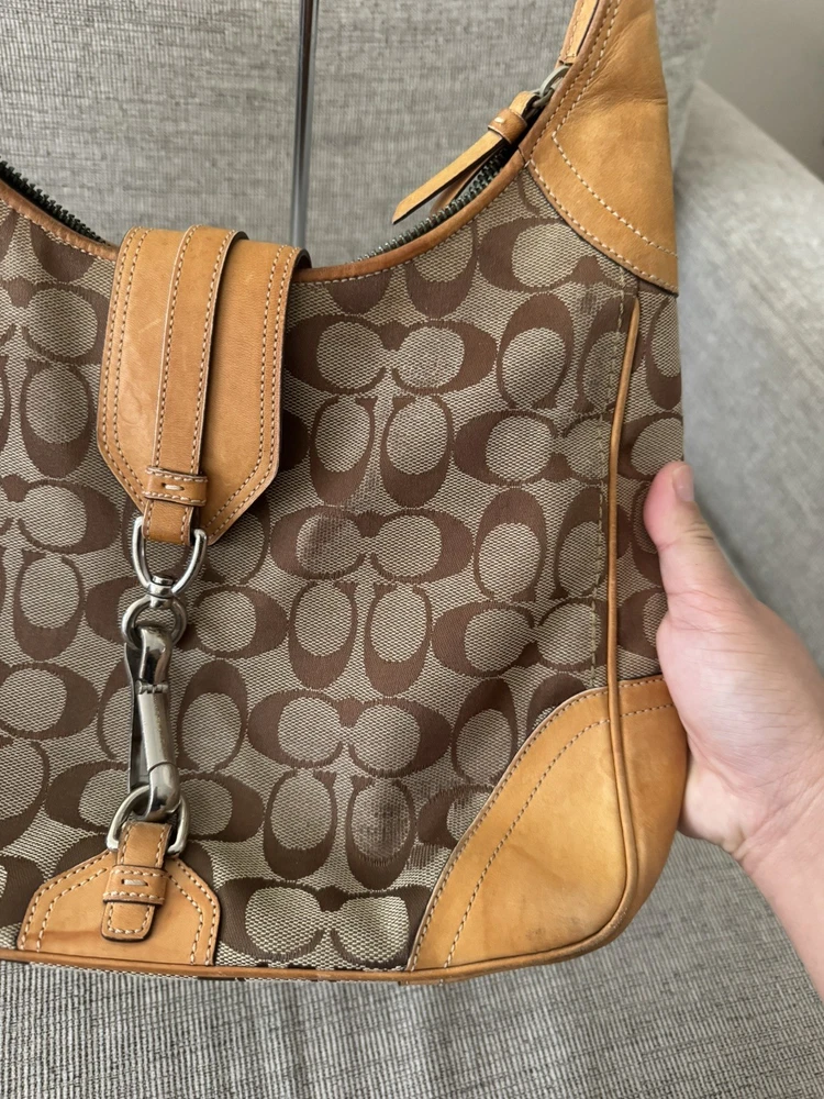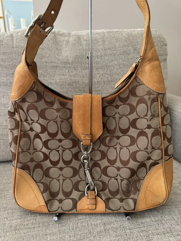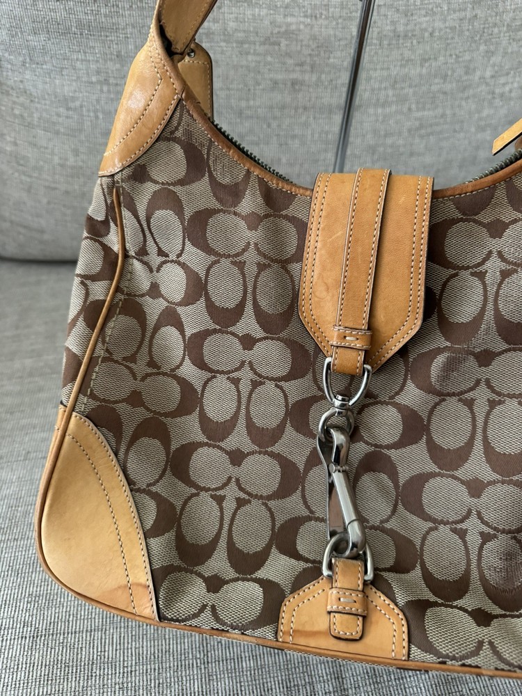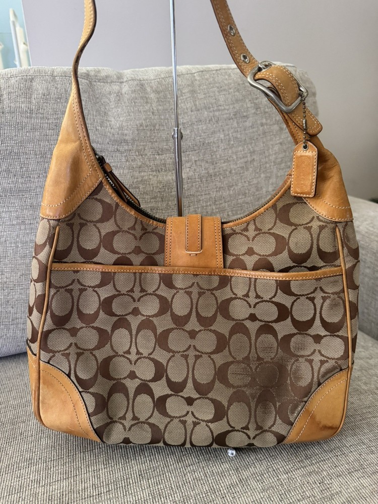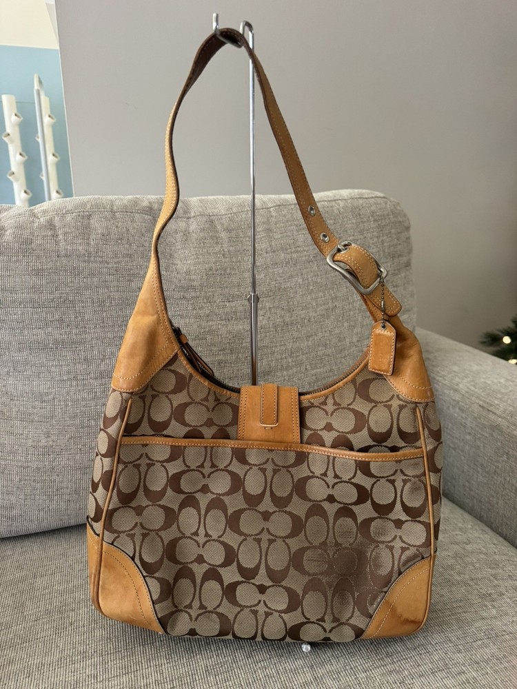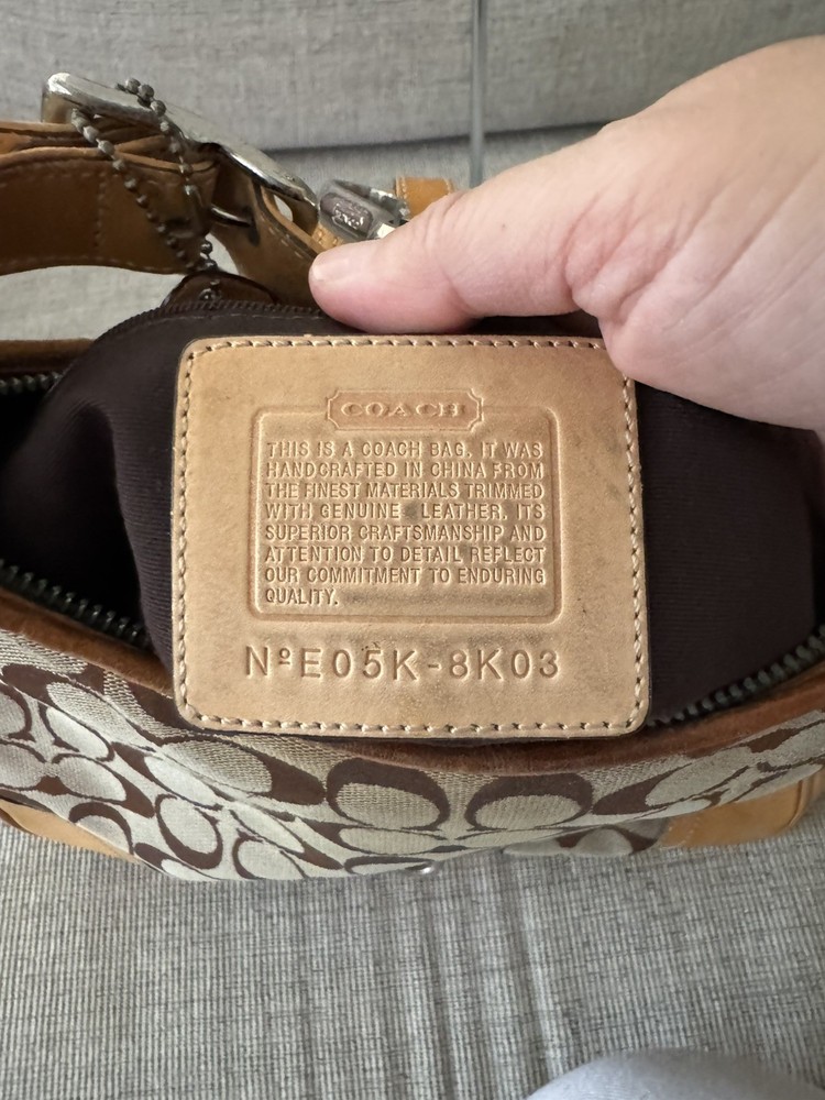 Occasion: Business, Casual, Travel, Workwear Personalize: No Features: Inner Pockets, Lined, Packable, Pockets Strap Drop: 11 in. Size: Medium Bag Width: 11 in Lining Material: Fabric Product Line: Coach Signature Hobo Bag Depth: 3 in Department: Women Theme: City, Classic, Designer Lining Color: Brown Country of Origin: China Style: Hobo Bag Handle Style: Shoulder Strap Character: N/A Exterior Material: Leather Exterior Color: Brown Hardware Material: Silver MPN: E05K8K03 Handle/Strap Material: Leather Handle/Strap Color: Brown Customized: NA Pattern: Geometric Brand: Coach Hardware Color: Silver Bag Height: 9 in Handmade: No Vintage: Yes Closure: Snap, Zip Accents: Zipper