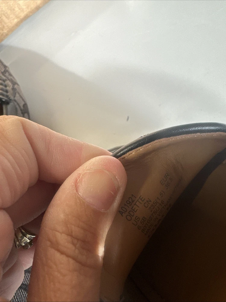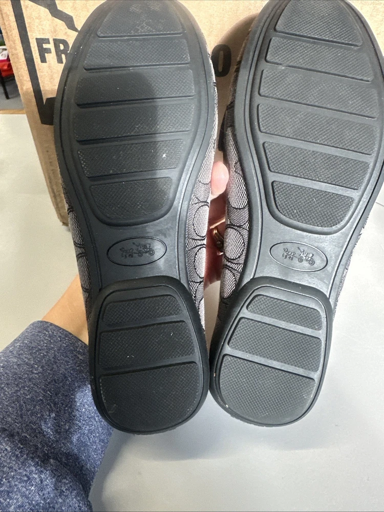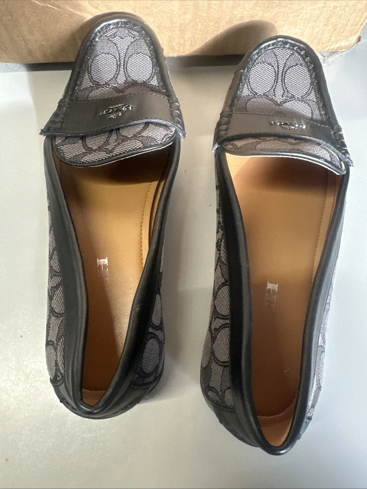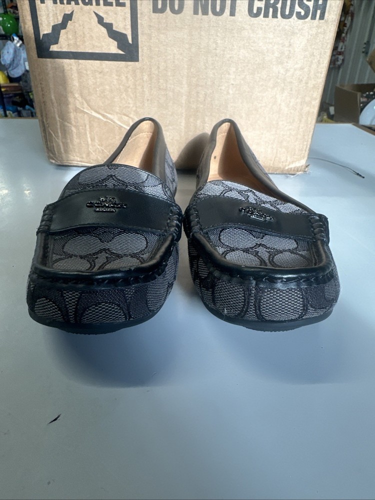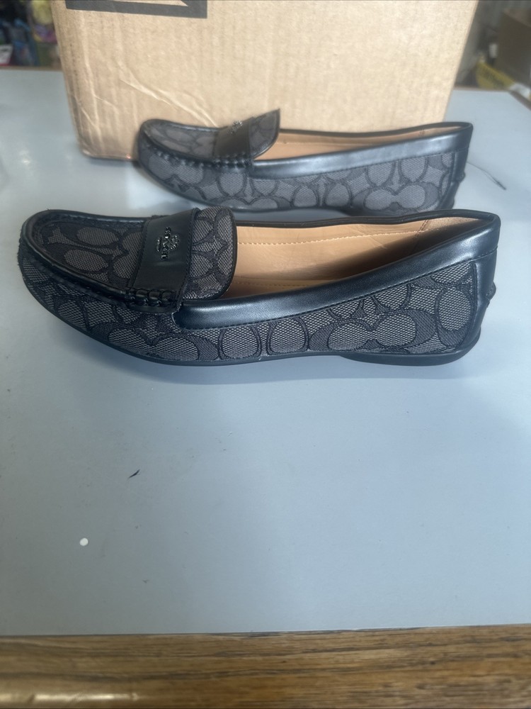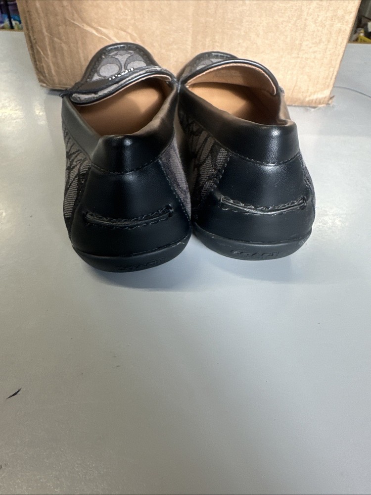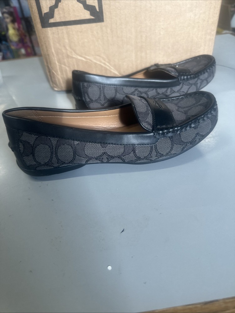The Coach Women's Odette Loafer Slip On Flats in black and gray signature monogram are a stylish and comfortable choice for women who value both fashion and practicality. With a slip-on design and lightweight leather construction, these flats are perfect for travel and casual occasions. The classic loafer style adds a touch of sophistication to any outfit, while the leather outsole and upper materials ensure durability and quality. Perfect for a size 6.5B foot, these Coach shoes are a versatile addition to any woman's wardrobe. Wore 1 time
