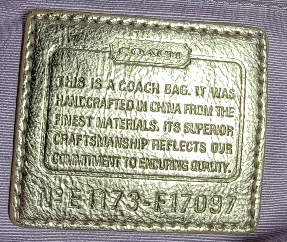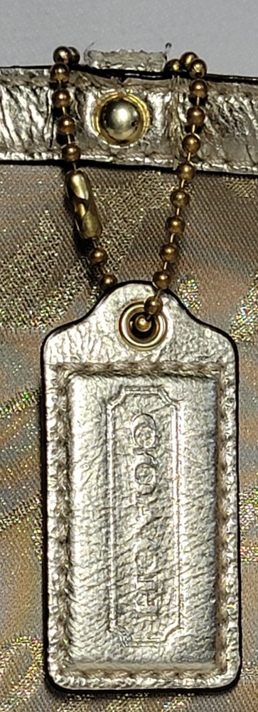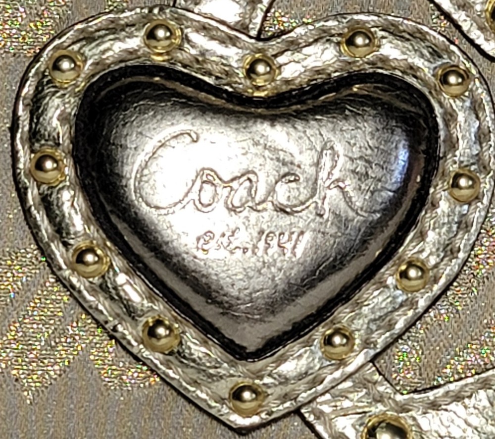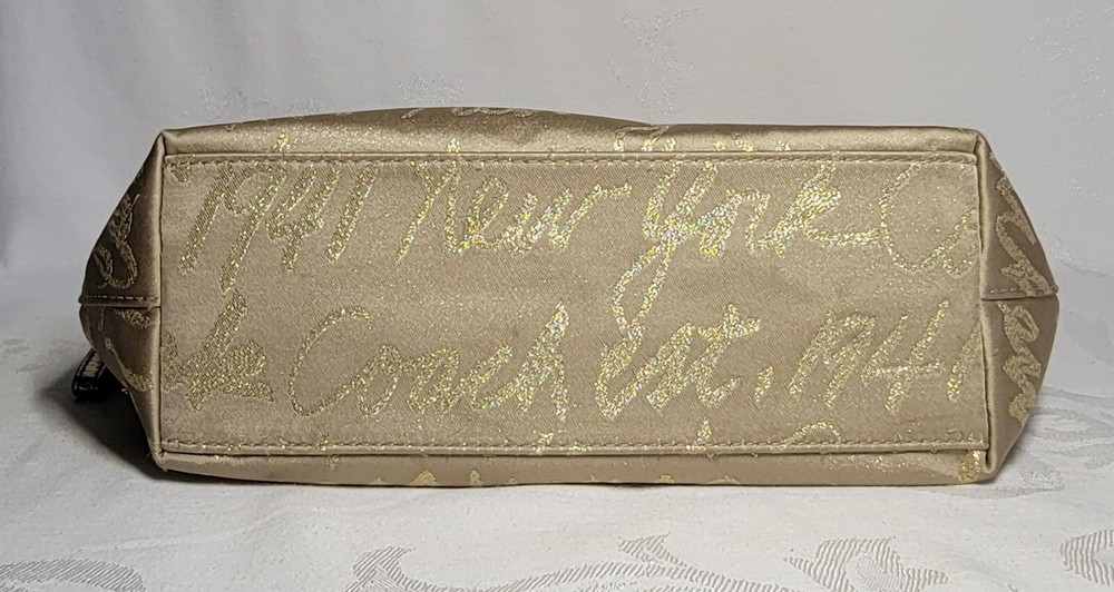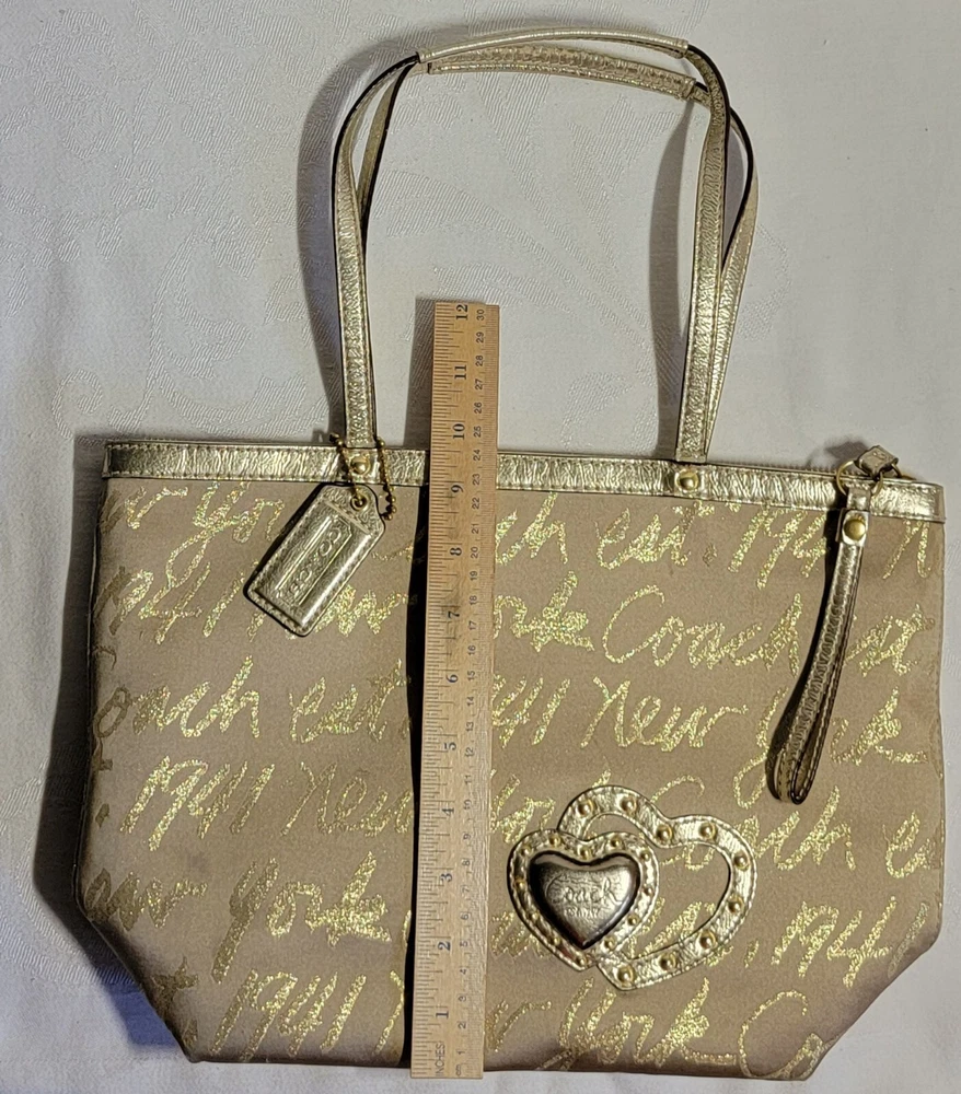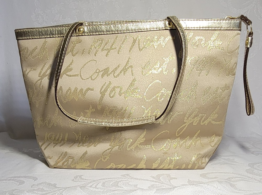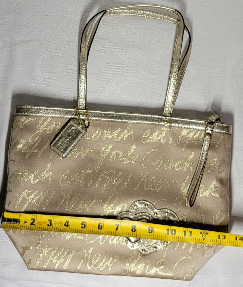 This Coach Tote Bag is perfect for any occasion, whether it's a wedding, party, or business meeting. It features a rectangular shape with a gold lurex fabric exterior and studded accents, along with a double handle strap made of leather. The bag comes with a bag charm, and the iconic New York Script Logo is displayed on the front. Inside, the bag has multiple inner pockets and pockets for organizing your belongings. The lining is made of purple fabric, adding a pop of color to the design. The gold-plated hardware and strap accent complete the look. This bag is a must-have for any designer or city-themed outfit.