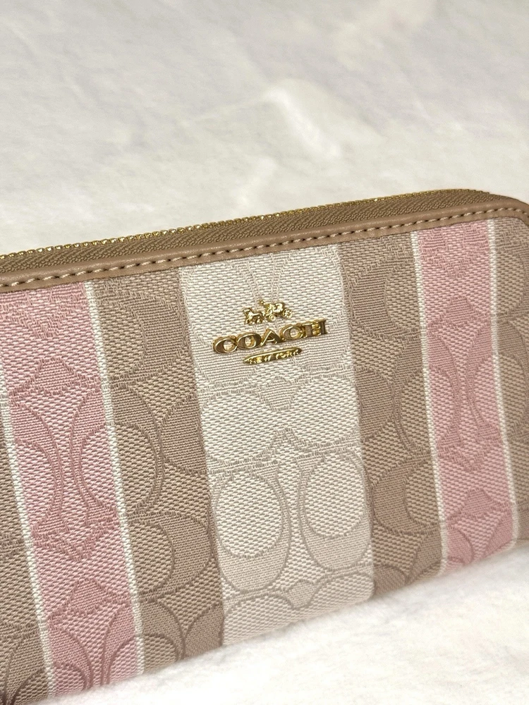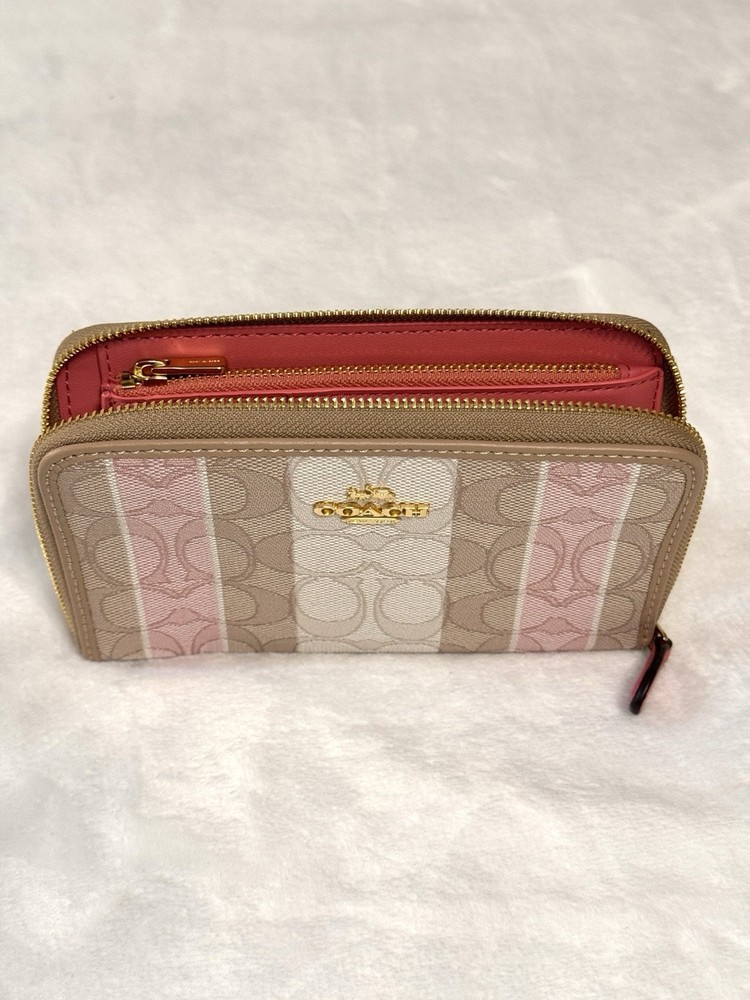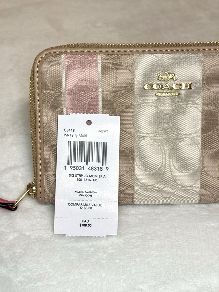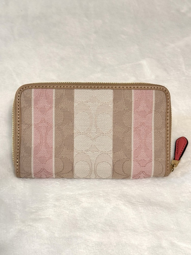 Coach Signature Stripe Jacquard Medium Zip Wallet Taffy Multi Beige Brown Pink Asking Price: $99 Original Price: $188 Condition: New Materials: Jacquard / Leather Exterior Color: Beige / Brown / Pink Interior Color: Pink Hardware Color: Gold Style Number: C8419 Closure: Zipper Zipper Pockets: 1 Card Slots: 9 Cash Slots: 4 Length: 6.75” Height: 4” Width: 0.8” —————————————————— Wallet, Purse, Hand Bag, Shoulder Bag, Crossbody, Designer, Luxury, Fashion, Authentic, In Hand, Rare, Limited Edition, Exclusive, Merch, Streetwear, Hypebeast, Deadstock