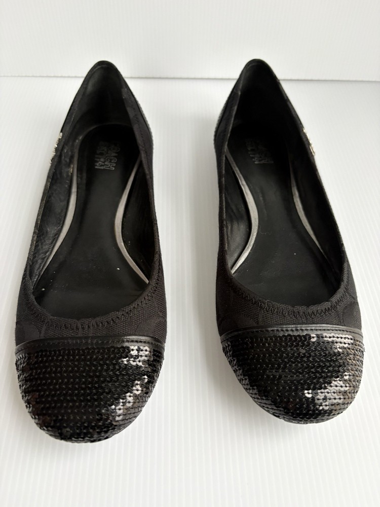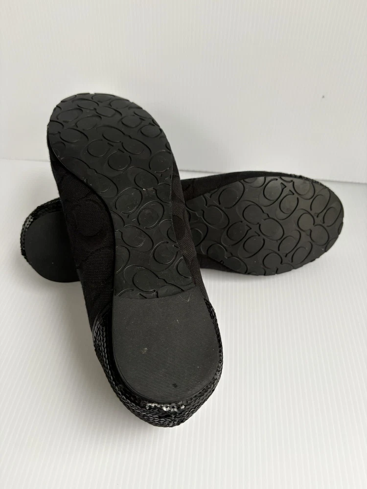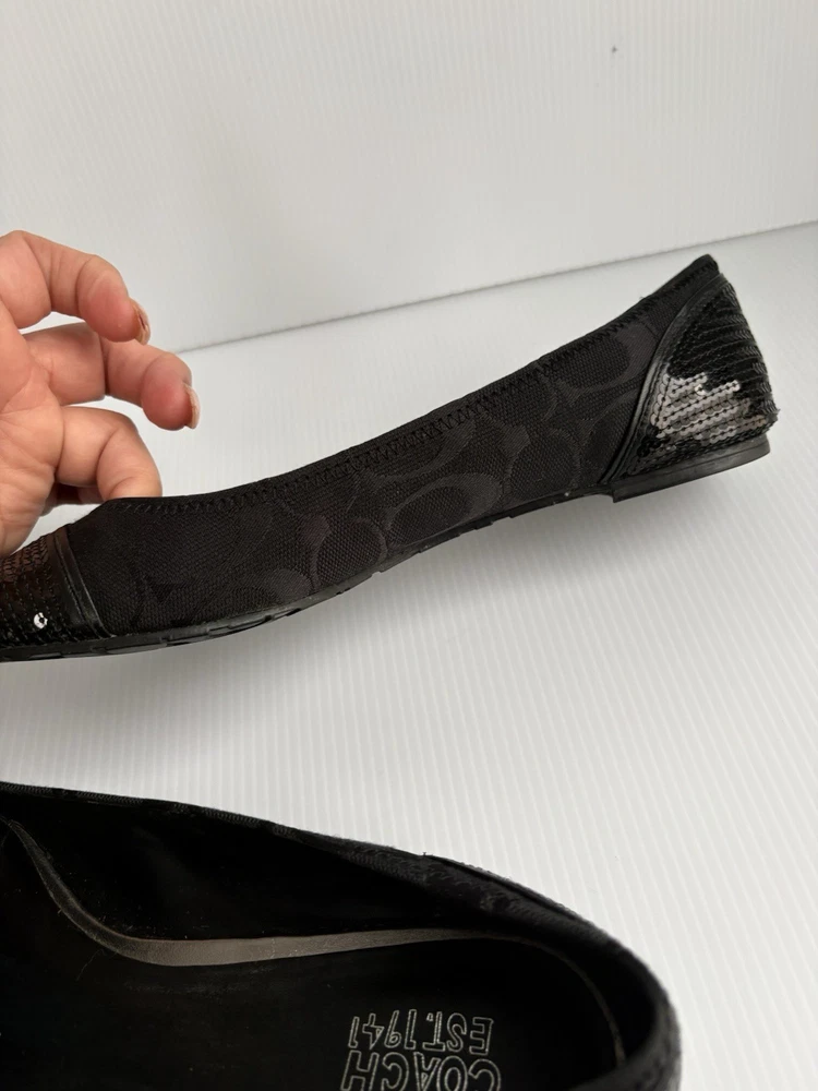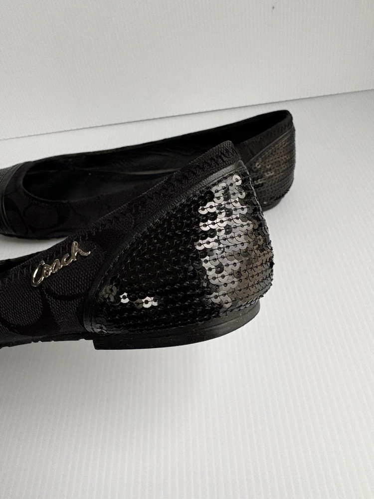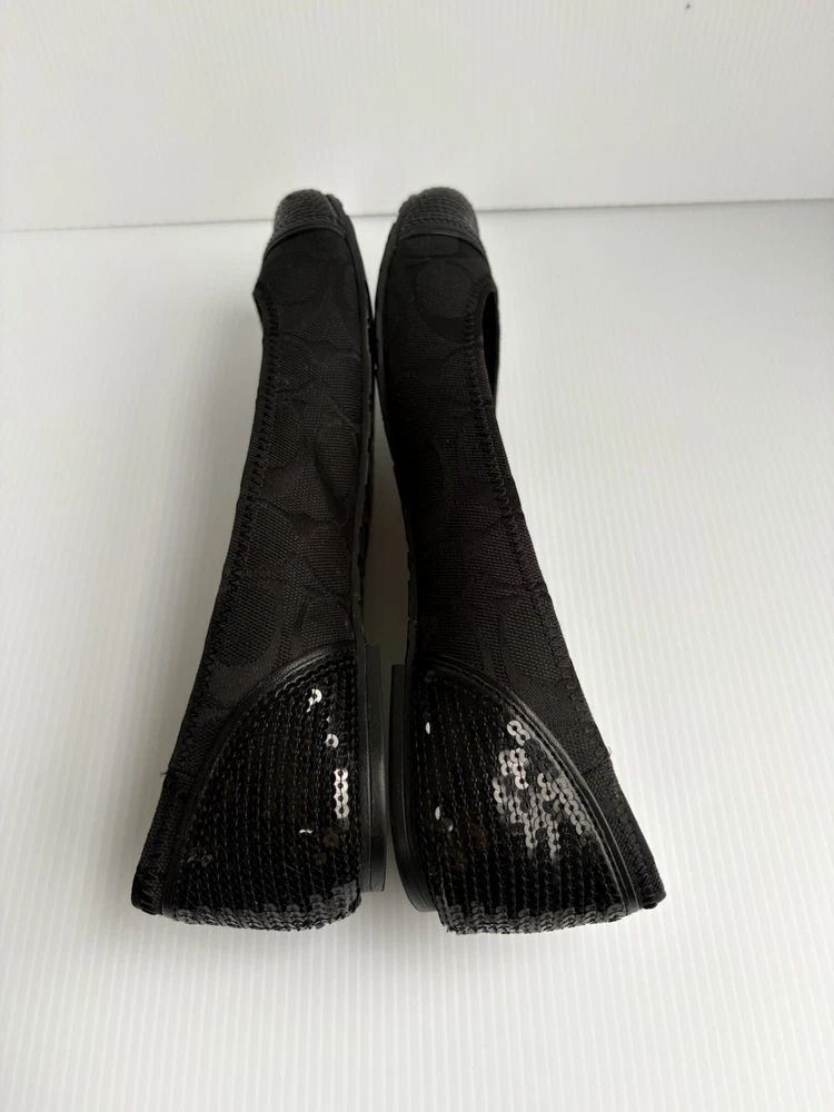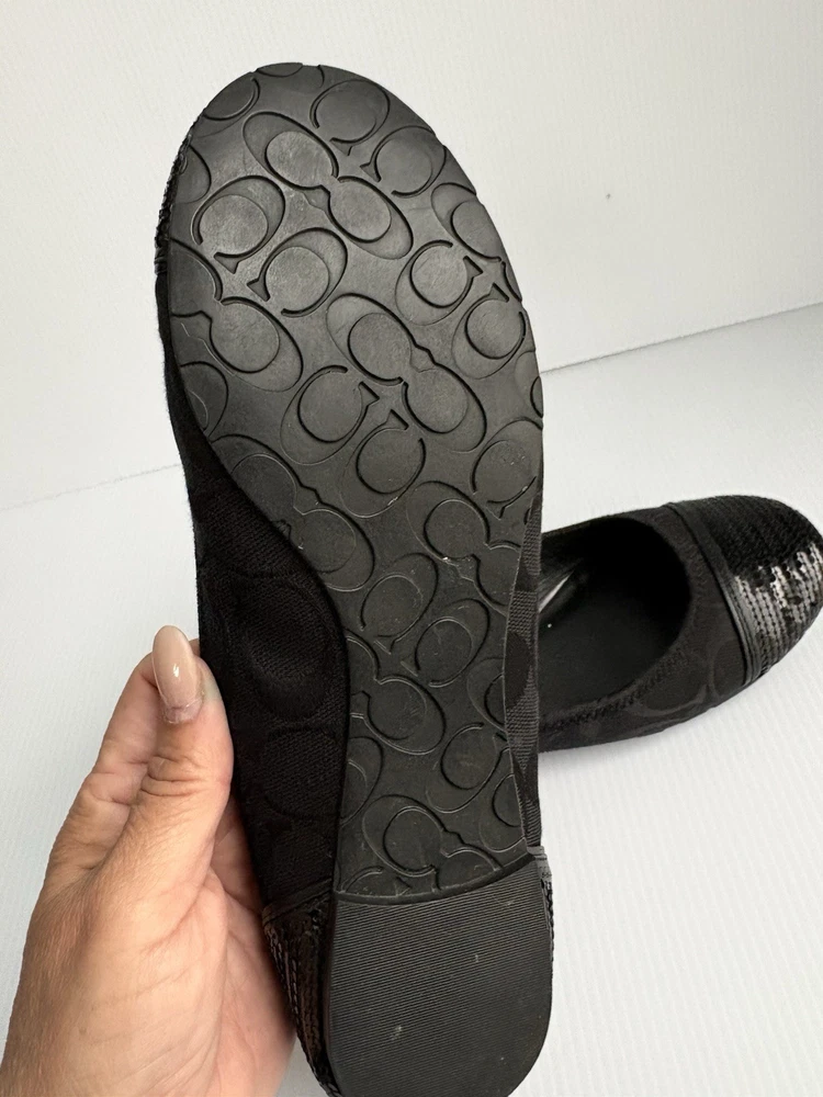 Coach Signature C Shine Ballet Flats. These shoes feature a black jacquard upper with the iconic Coach "C" signature pattern and a round sequin-detailed cap toe. Key Features Design: Round toe ballet flat with a shimmering sequined toe cap. Material: Jacquard fabric upper featuring the signature Coach "C" motif. Details: Gold-tone Coach signature branding is typically found on the side of the shoe. Sole: Built with a durable rubber outsole for traction. Excellent condition Size 9