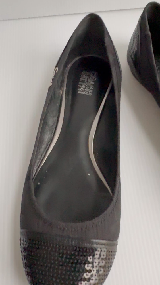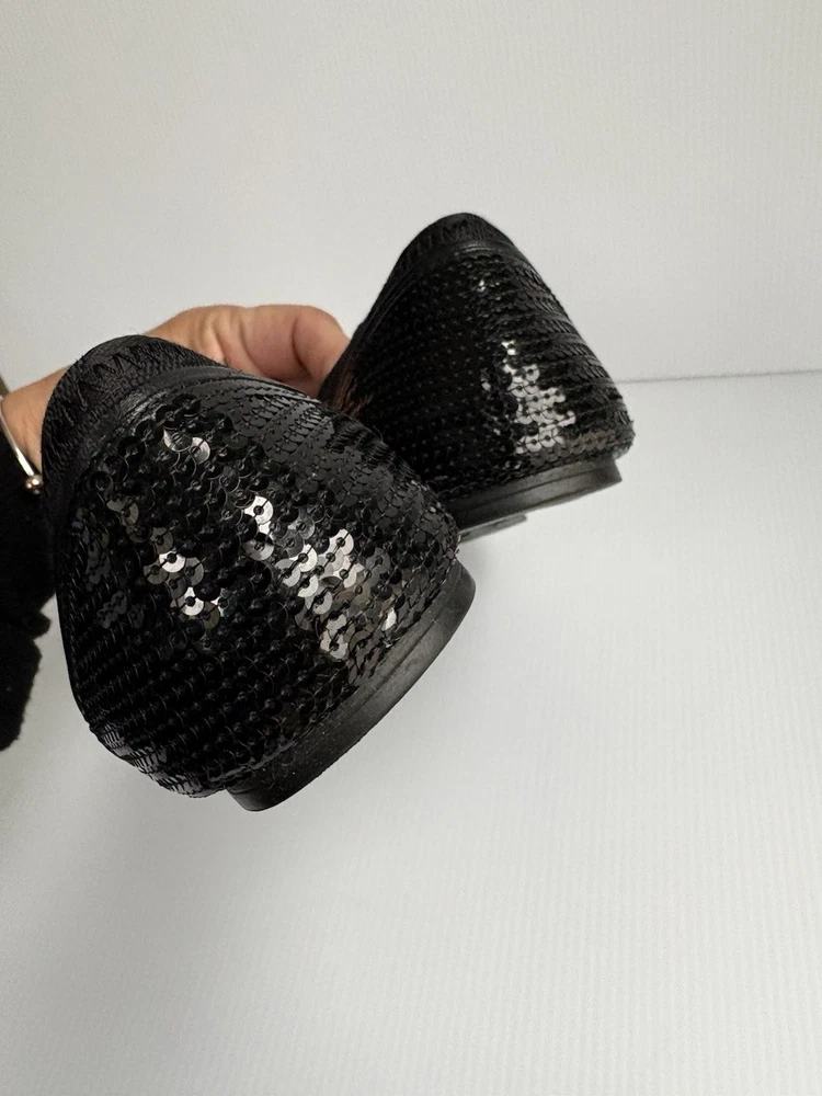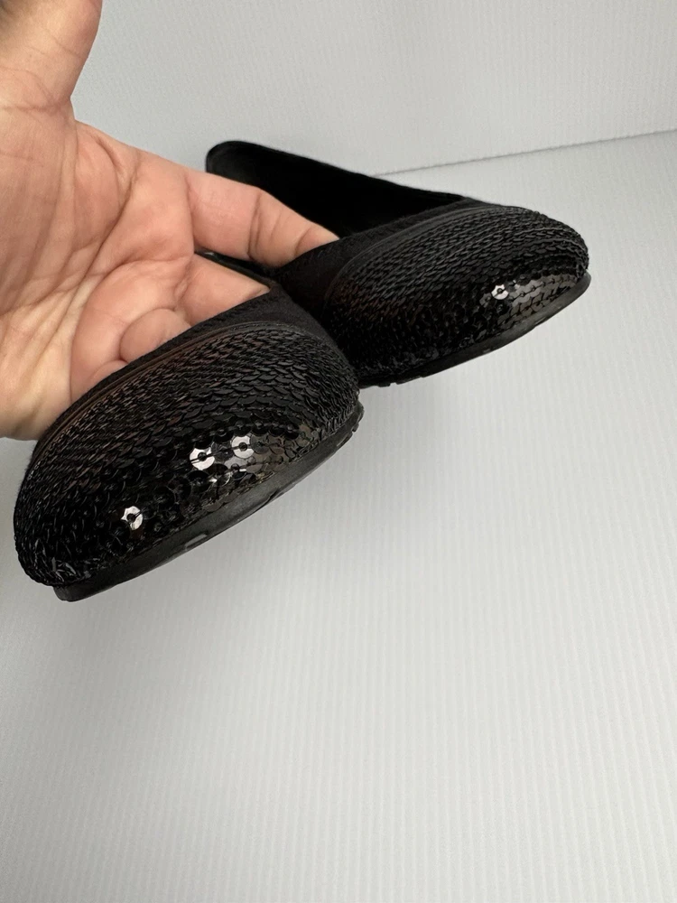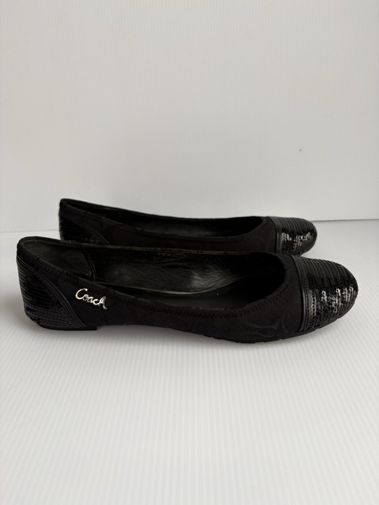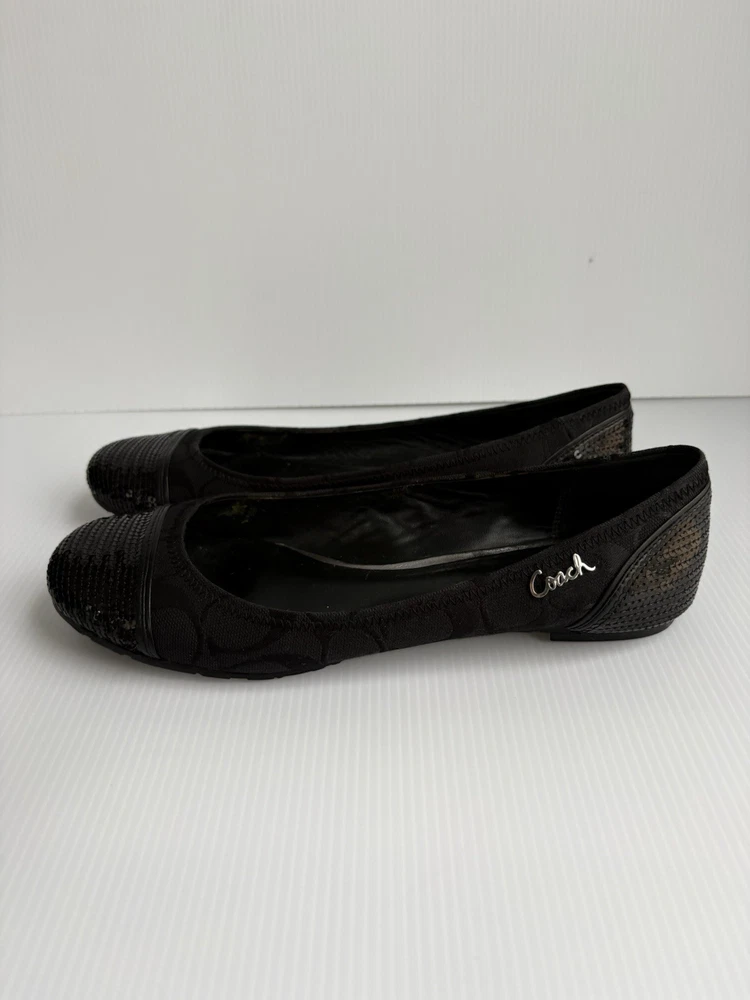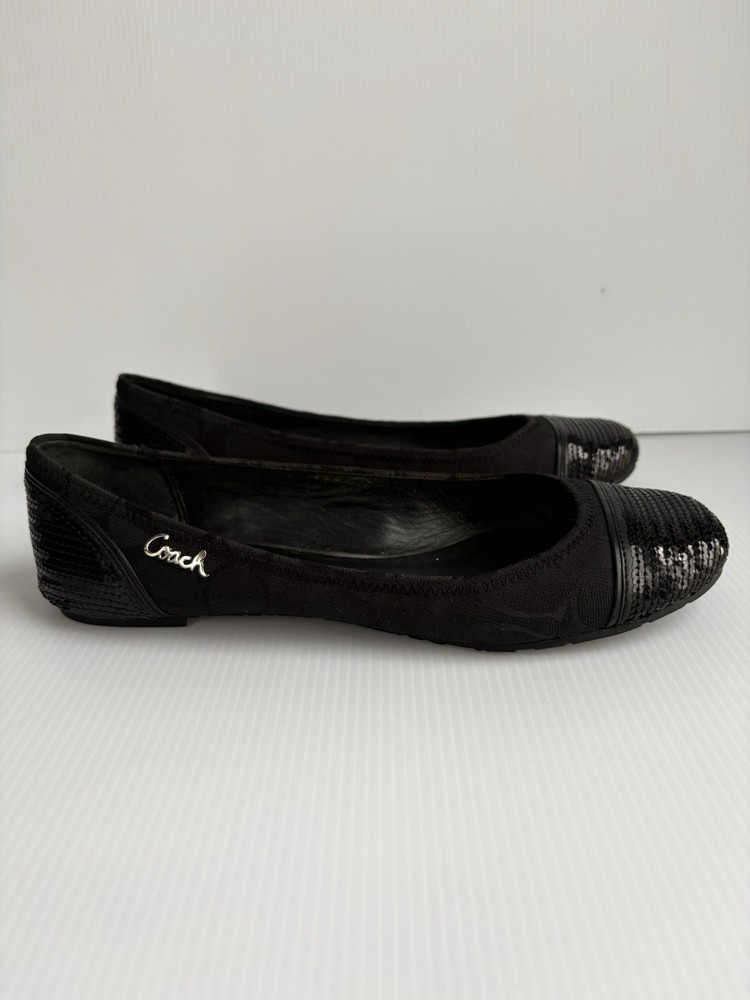 Coach Signature C Shine Ballet Flats. These shoes feature a black jacquard upper with the iconic Coach "C" signature pattern and a round sequin-detailed cap toe. Key Features Design: Round toe ballet flat with a shimmering sequined toe cap. Material: Jacquard fabric upper featuring the signature Coach "C" motif. Details: Gold-tone Coach signature branding is typically found on the side of the shoe. Sole: Built with a durable rubber outsole for traction. Excellent condition Size 9