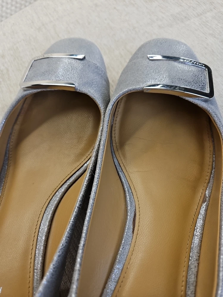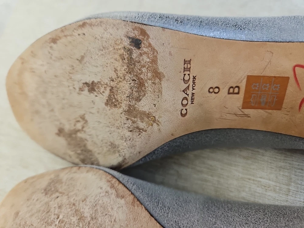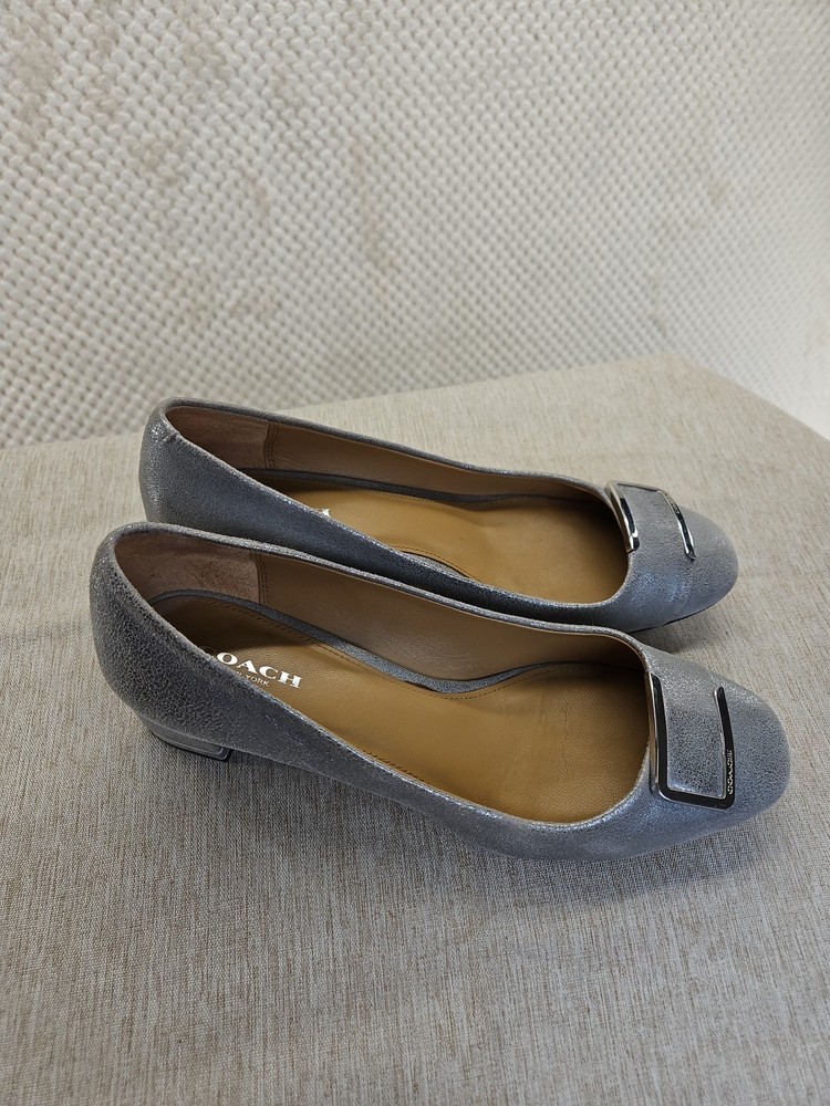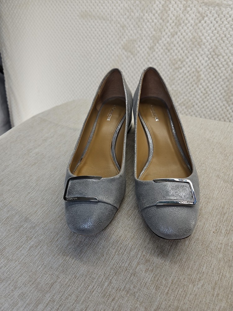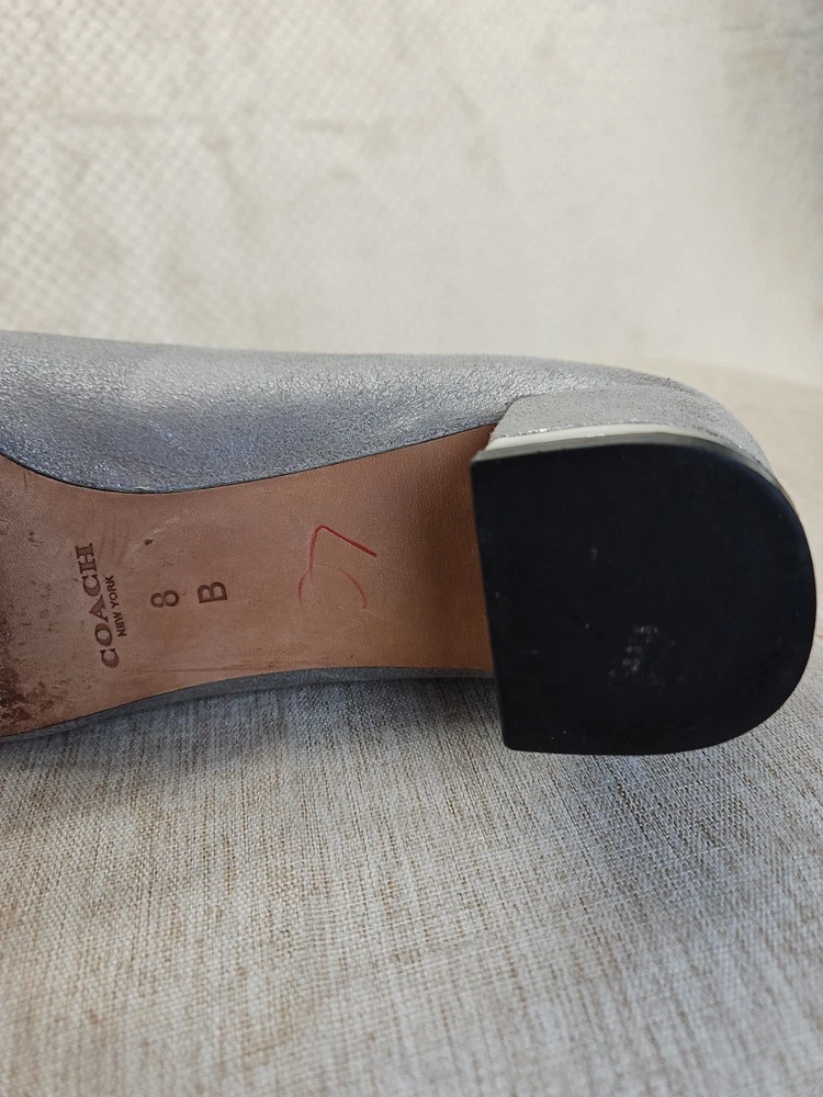 The Coach Silver/Gray Leather 1.5" Block Heel Pumps in size 8B are stylish and versatile heels perfect for both party occasions and casual wear. Featuring a round toe and slip-on closure, these pumps are crafted with leather outsole and lining, offering comfort for all-day wear. The silver logo buckle adds a touch of sophistication to these classic pumps, making them a must-have addition to any woman's shoe collection. With a low block heel, these stylish pumps are perfect for the summer, fall, and spring seasons, adding a touch of elegance to any outfit....#1259