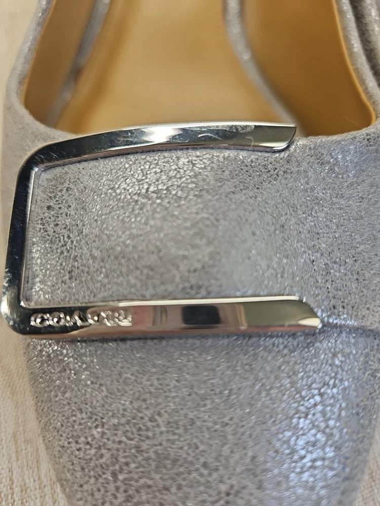 Coach Silver Gray Leather Block Heel Pumps Size 8B with Logo Buckle
