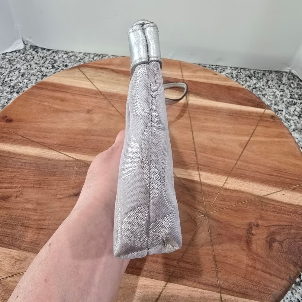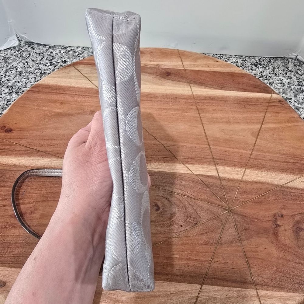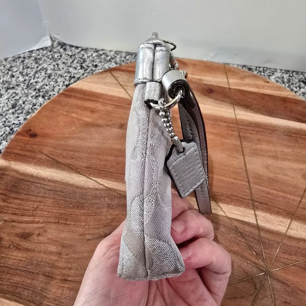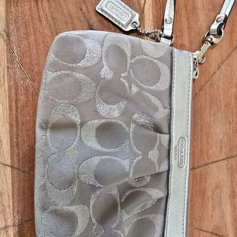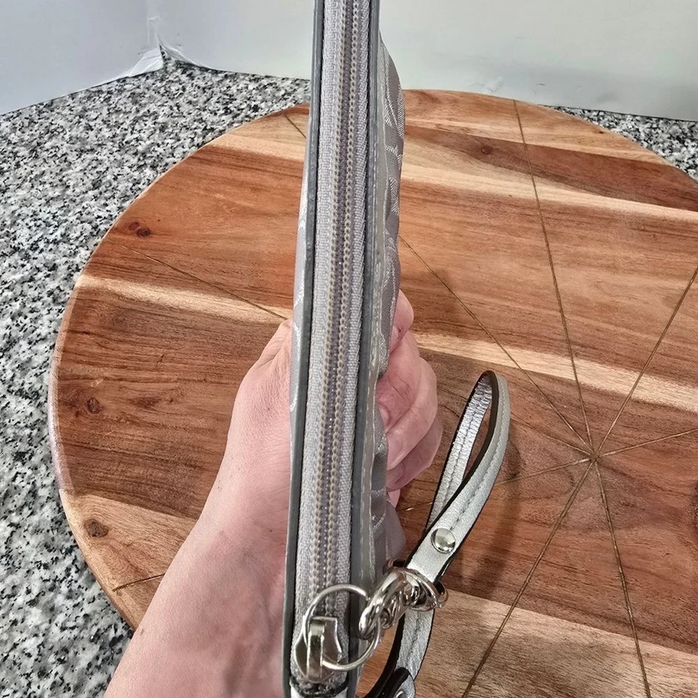 Coach Signature Pleated Silver Gray Wristlet It features a shimmering silver signature leather & fabric exterior with pleated accents and a zip closure to keep your essentials secure. Approximate Size: 6" L X 4.5" H X 1" W Fits an iPhone or similar smartphones Color: Silver/Light Grey