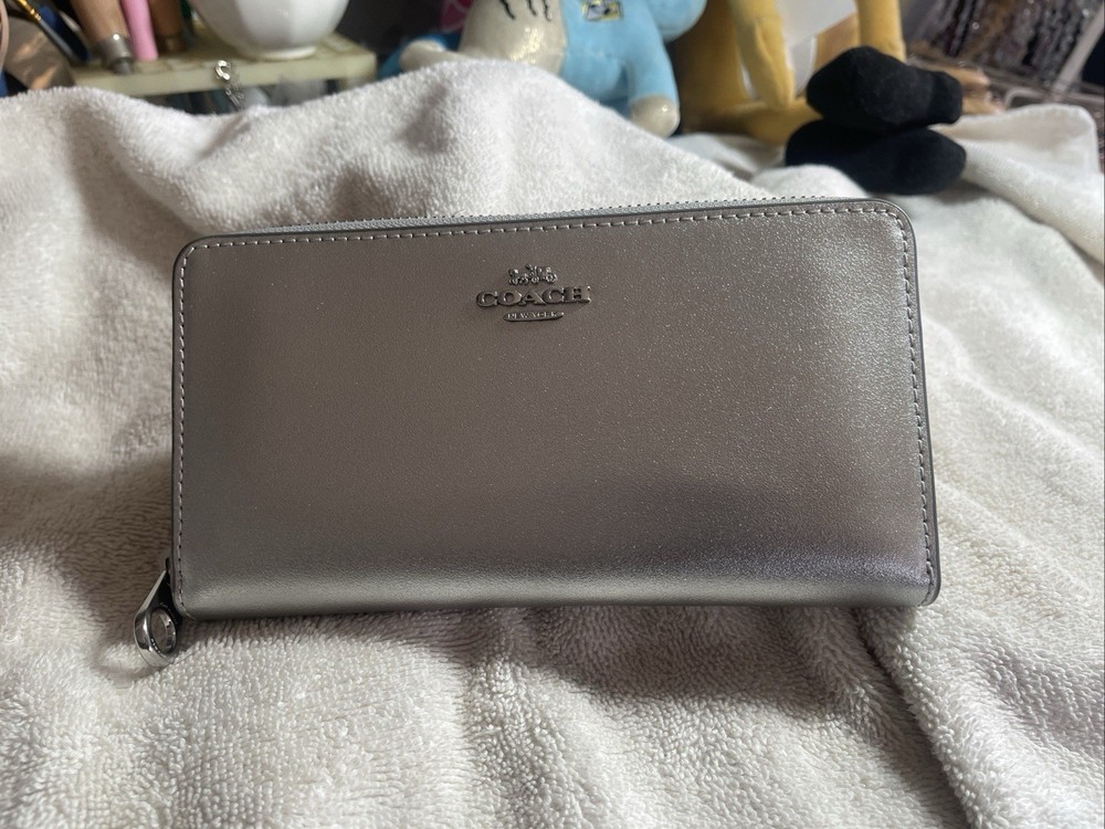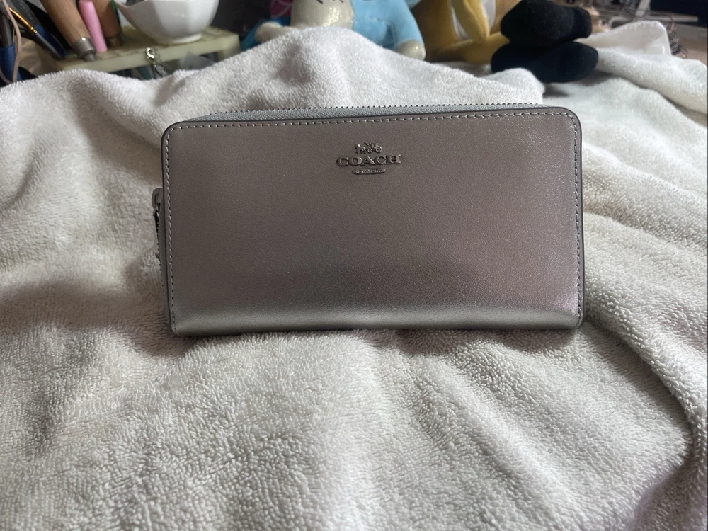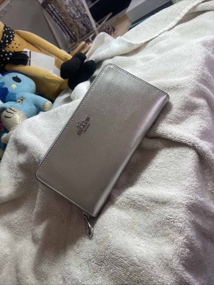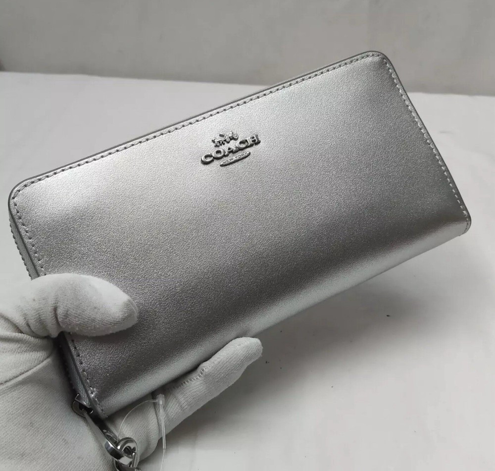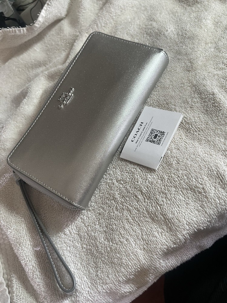 This Coach Light Silver Leather Zip Around Credit Card Wallet is a must-have for any fashion-conscious woman. Made with high-quality canvas and leather materials, this wallet boasts a sleek and stylish design that is perfect for everyday use. The wallet features a zip-around style and is accented with the Coach logo and zipper details. With enough space for credit cards and cash, this wallet is both functional and fashionable. The wallet is brand new with tags and originally priced at $290. Don't miss your chance to add this beautiful wallet to your collection.