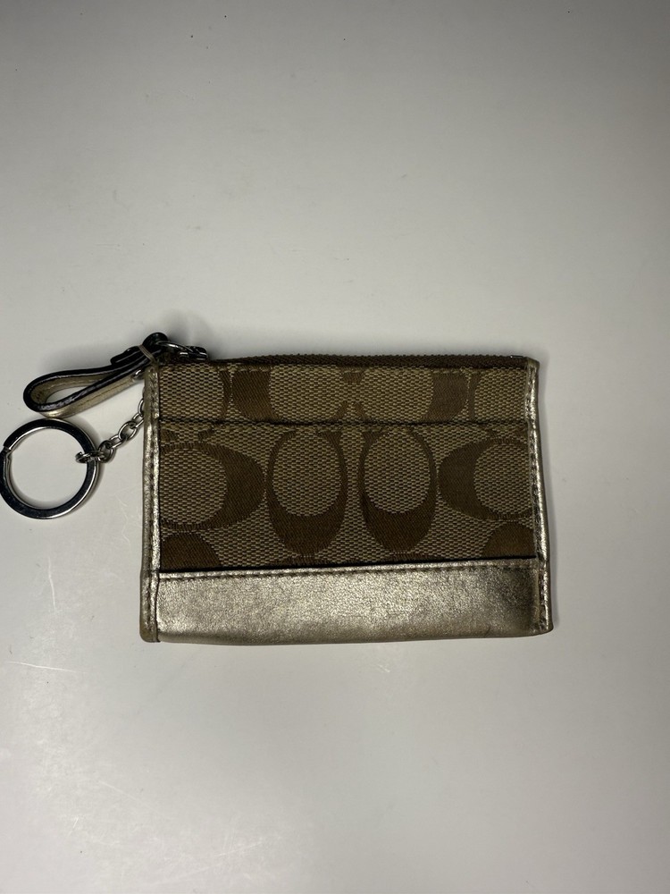 The Coach Silver Metallic Leather Wallet Coin Purse is a stylish and compact accessory designed for women. Made of luxurious leather and signature jacquard fabric, this mini skinny zip case features the iconic Signature C logo as accents. With a sleek gold color and convenient features such as key ring, zipper closure, and credit card slots, this designer wallet is both practical and fashionable. The product is an official Coach creation from China, ensuring high quality and authenticity. Ideal for adding a touch of luxury to any outfit, this wallet is a must-have for those who appreciate designer accessories.