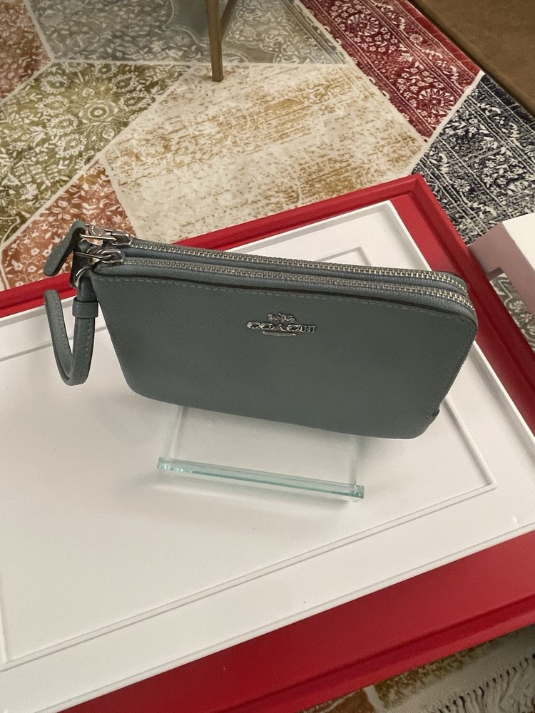 Crafted with the modern woman in mind, this Coach small double zip wristlet marries sophistication with practicality. The elegant green hue complements the sleek leather design, offering a chic accessory to accentuate any ensemble. The wristlet's compact silhouette is ideal for securing essentials without the bulk of a traditional wallet. With its well-thought-out layout and durable construction, it's a timeless addition to any accessories collection, embodying the perfect blend of style and function for the busy, fashion-conscious individual.