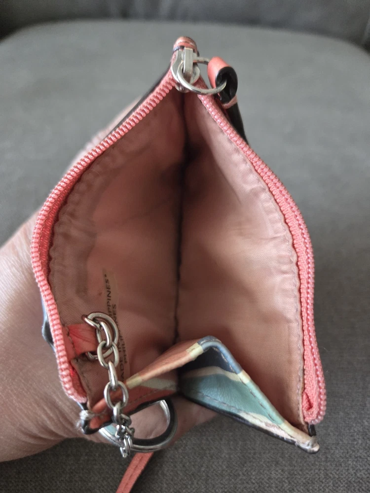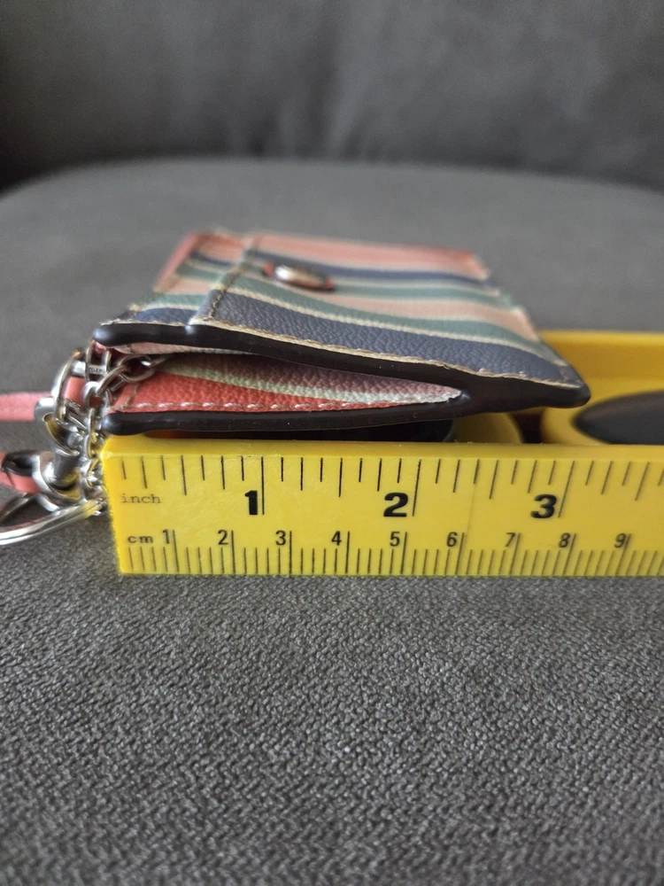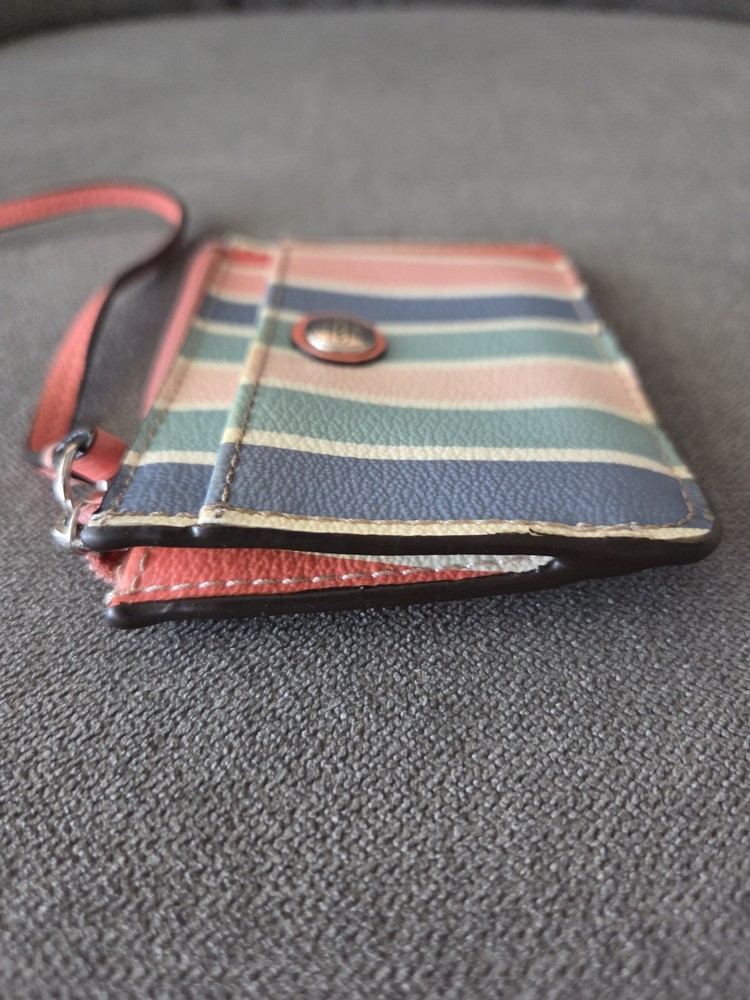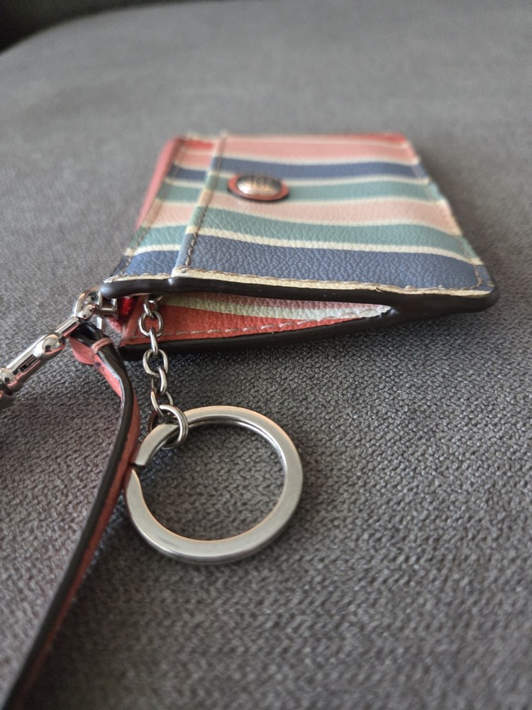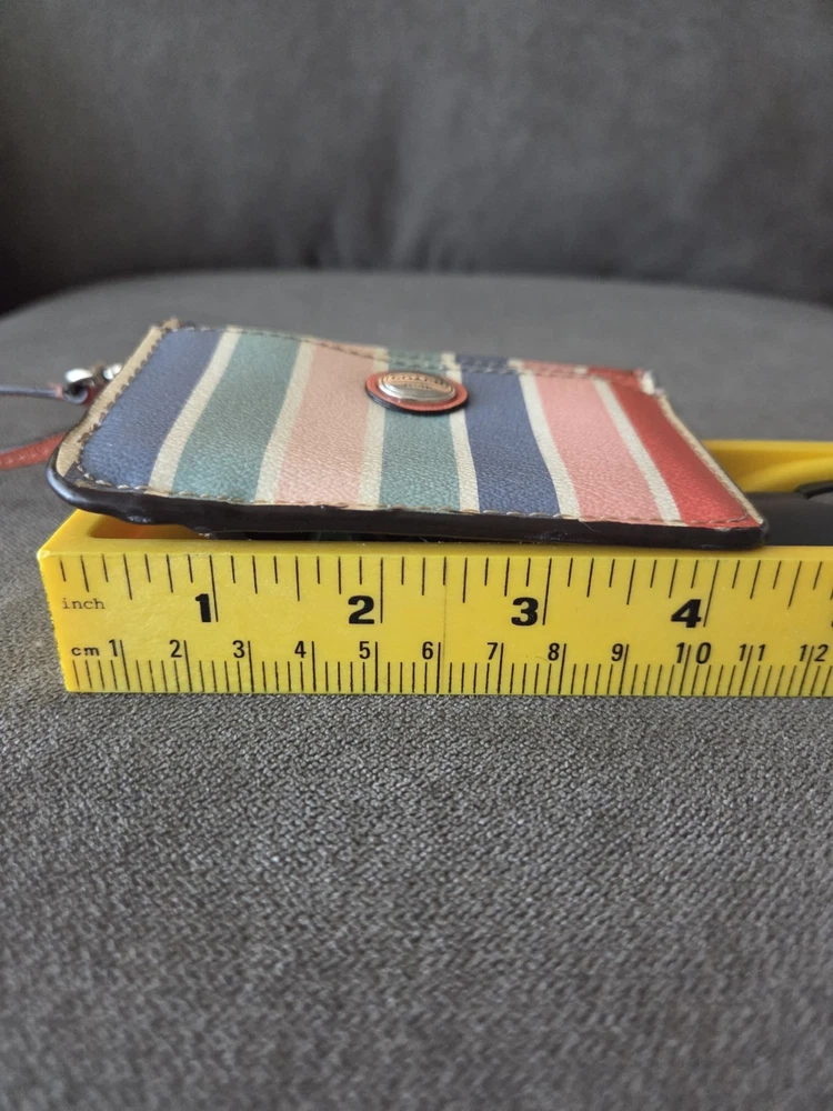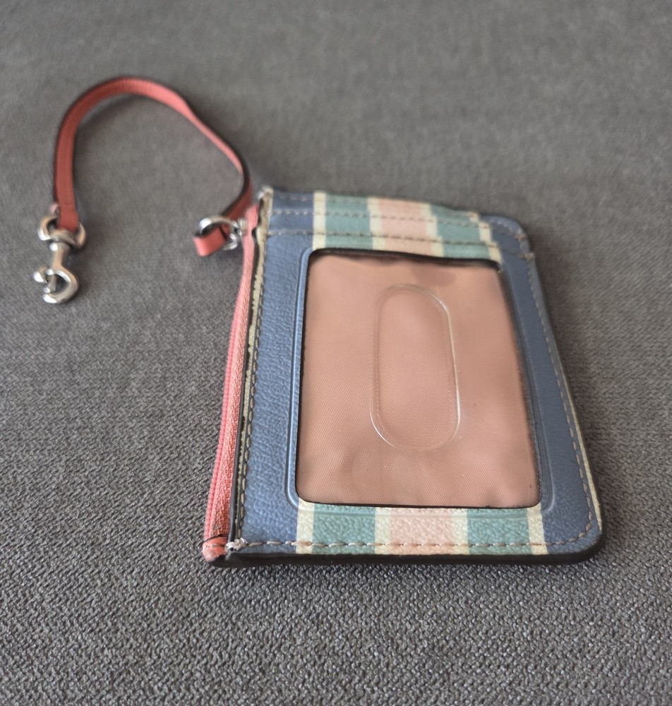 This Coach Small Wristlet Wallet Card Holder in pink, orange, and blue multicolor stripes is a stylish accessory for women. Made of leather with a zip closure and various accents like a strap, zipper, and logo, this wallet is both functional and fashionable. Perfect for on-the-go convenience, this wristlet wallet is a versatile addition to any outfit.