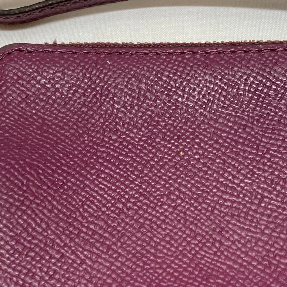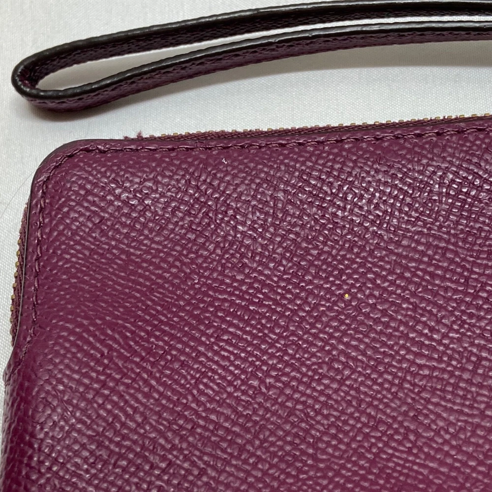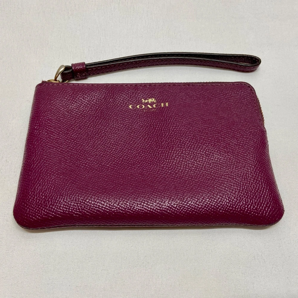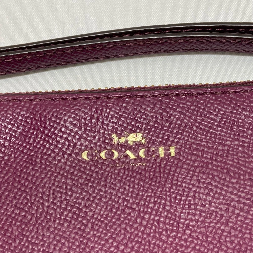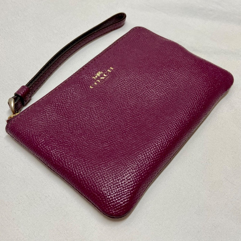 COACH Women's Small Corner Zip Wristlet Pouch Wallet Purse Purple Plum GUC This ladies wallet/Wristlet is in great pre-owned condition with minimal to no signs of wear. There are a few small blemishes as shown up close in the photos above. Please see all photos as this is the exact item you will receive. Zip top closure, inside liner is clean and features an internal slip pocket with 2 card slots. Dimensions are; 6.5" wide x 4" high. Thanks for looking!