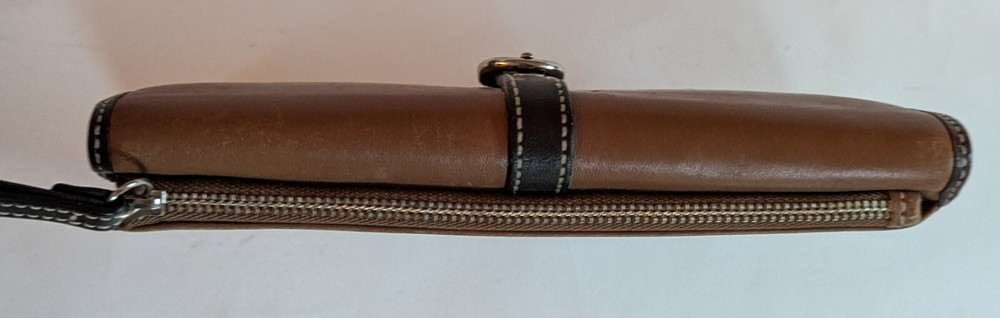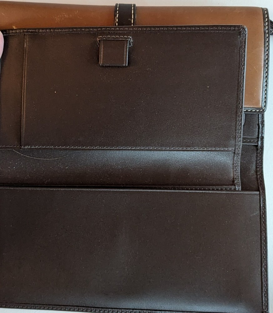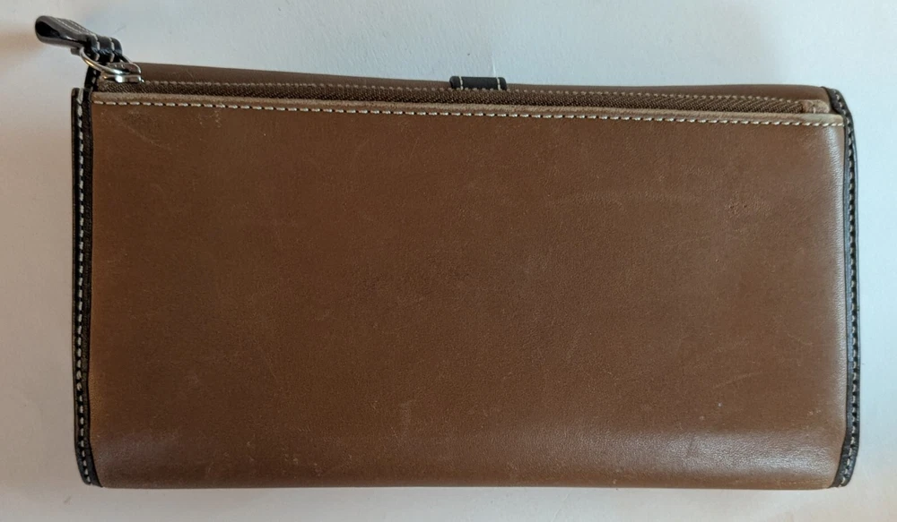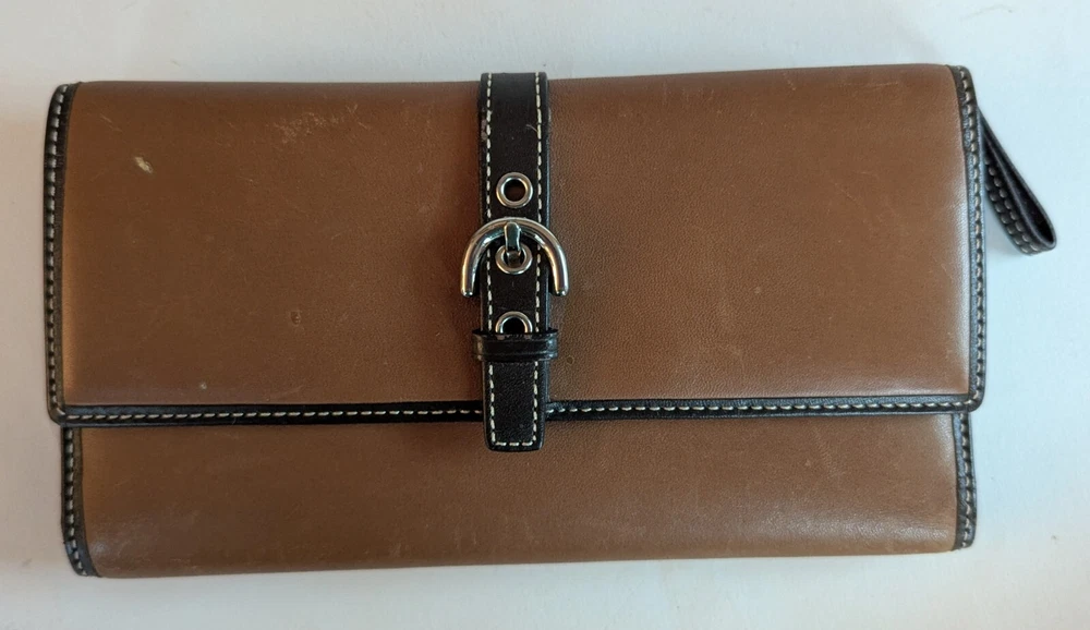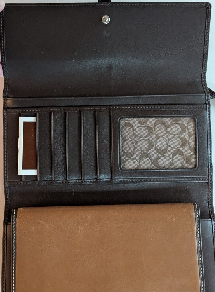 Coach Soho Trifold Brown Leather Wallet Vintage All Leather Y2k ne small scrap on the front, but otherwise this is a nice wallet in very good condition. No other rips tears or stains noted. Measures apx 4x7.5. Plenty of slots and spaces to hold your stuff, includes the original checkbook case. d2