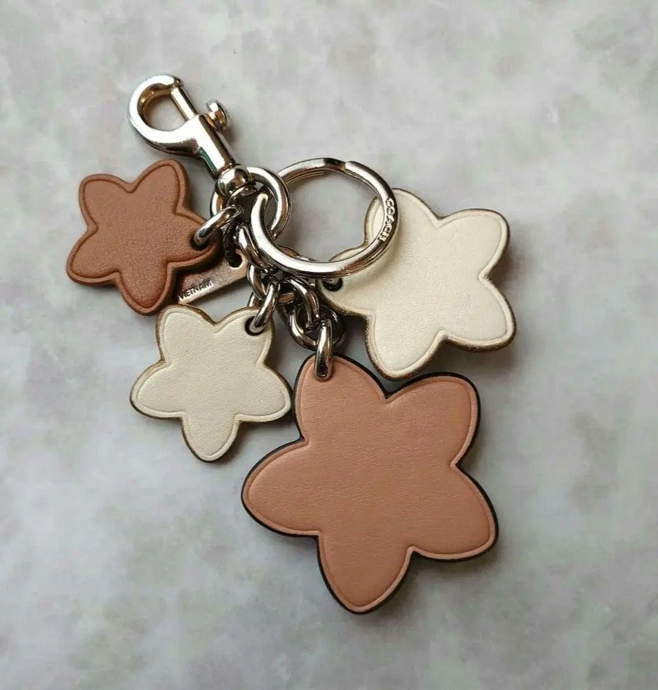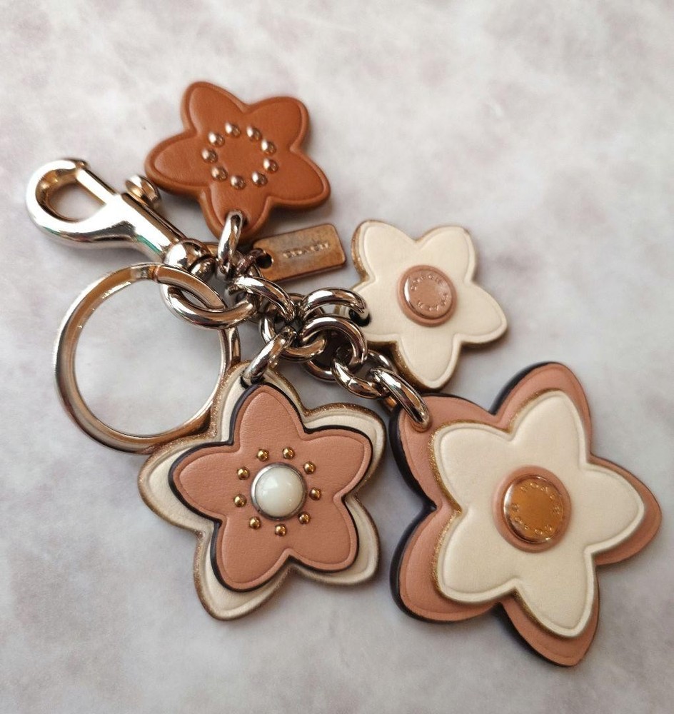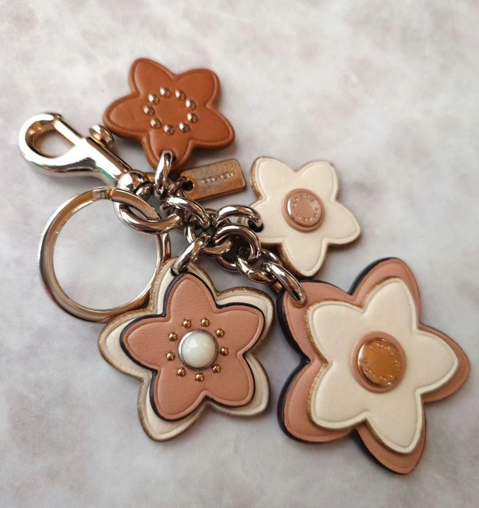 1. Absolutely love this adorable Coach keychain! The delicate cherry blossom flowers in soft pink with gold accents add such a feminine, elegant touch. It’s the perfect size—not too bulky, but still makes a statement on my keys or bag. The leather feels high quality, and the slight wear on the metal gives it a charming vintage vibe. Such a unique find from Japan—definitely a must-have for any Coach fan or anyone who loves dainty floral details!