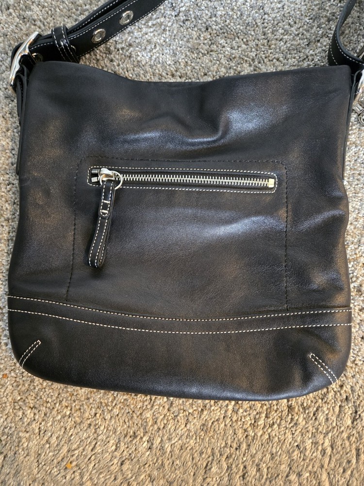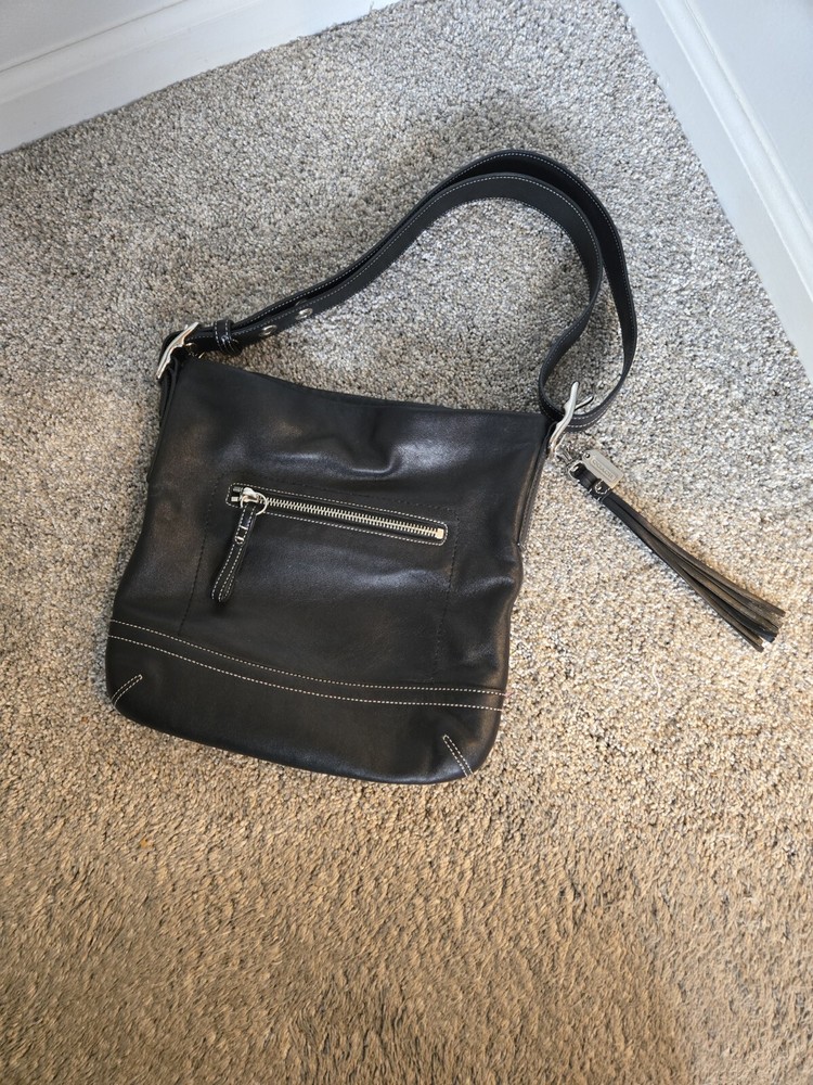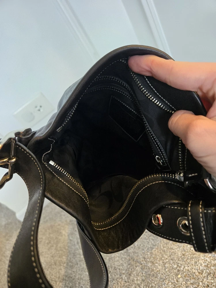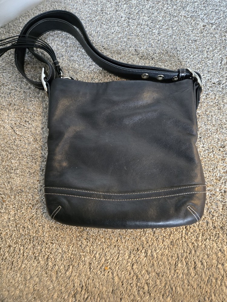 Gorgeous buttery soft Vintage Black Leather Coach Legacy 1415 Bag - silver hardware and detachable tassel keychain. Interior aligned with classic Coach C design, internal zipper pocket and two additional side compartments. Measurements: Depth – 2.5” Height –10” Width – 10” Condition: - Excellent interior exterior, no rips or stains or pen. Faint signs of wear such as faint scratches to exterior leather. All corners and edges are in excellent condition. - Clean Interior, no pen, odor or gunk. Smoke free and pet free home.