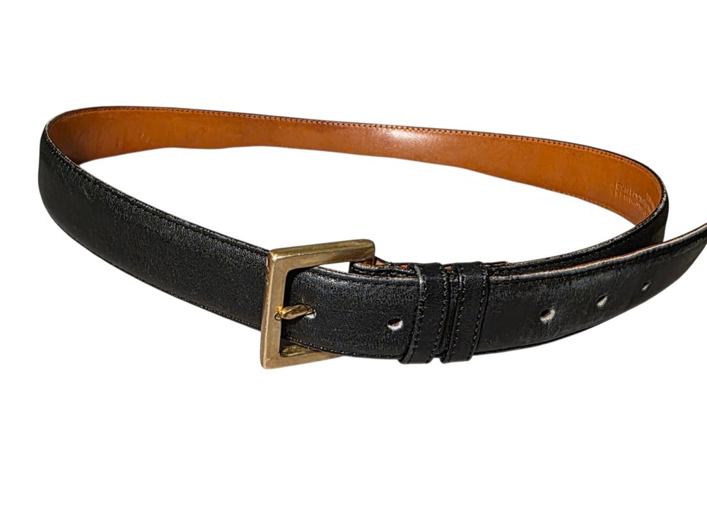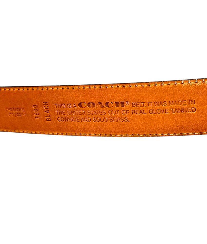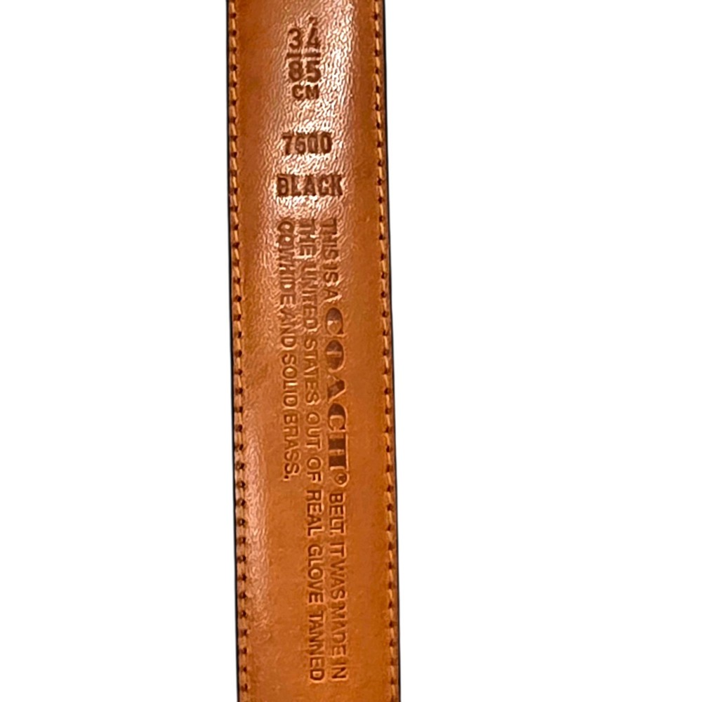The Coach 7600 Men's/Unisex Black Leather Belt is a vintage belt made with solid brass hardware and glove-tanned leather, this belt features a sleek black color and a sturdy brass buckle. With a size 34 and regular fit, this dress belt from Coach is perfect for adding a touch of sophistication to any outfit. This belt is a timeless piece that can be worn for years to come. Pre-owned Good. Belt has three indentations from where the Buckle pressed into the leather. The indentations do not go through to the other side of the Belt. See pictures.
