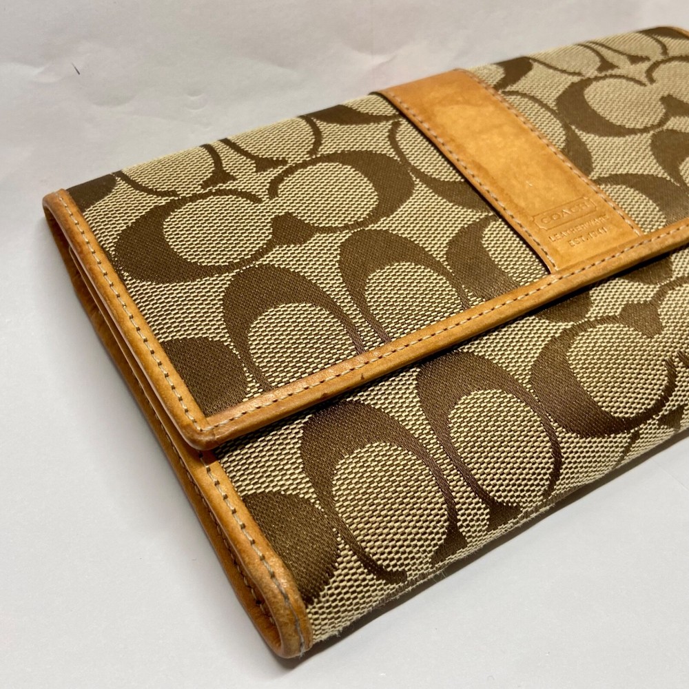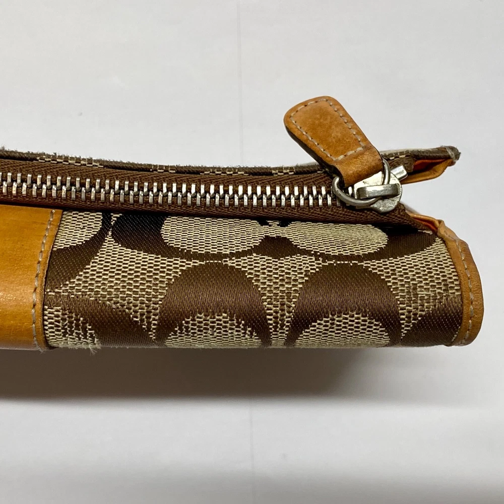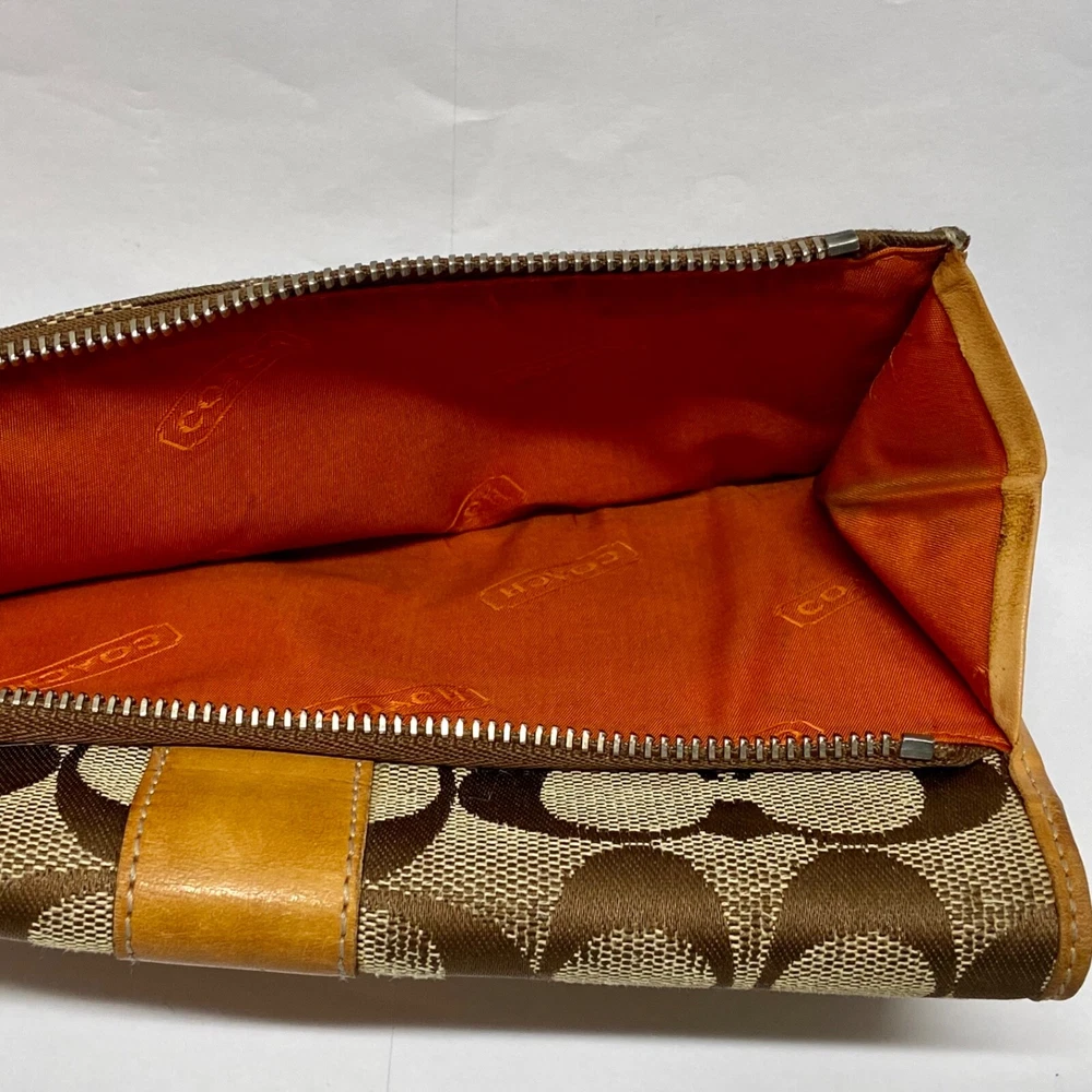 Coach Women's Signature Tri-fold Wallet Brown Khaki Jaquard Leather Trim Vintage This ladies snap front wallet is in good pre-owned condition with minimal signs of use. Please see all photos as this is the exact item you will receive. Please note there are some pen marks on the inside of wallet. Measurements are; 7.75" wide, 4.5" h and approximately 1" deep. Inside features 6 card slots, ID slot, and bill holder. Additional zip pocket on back of the wallet. Thanks for looking!