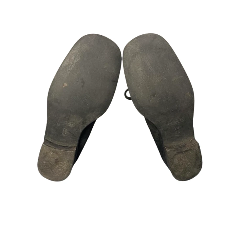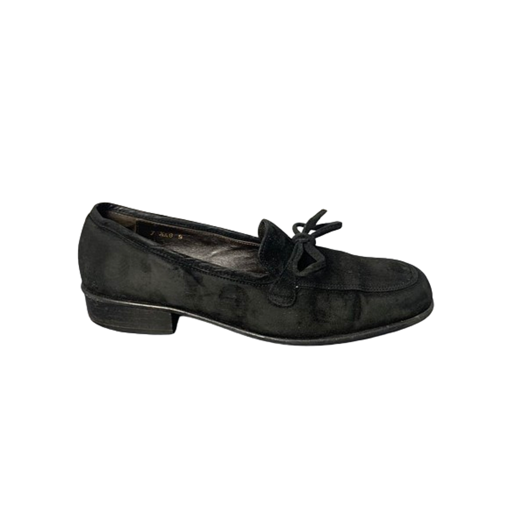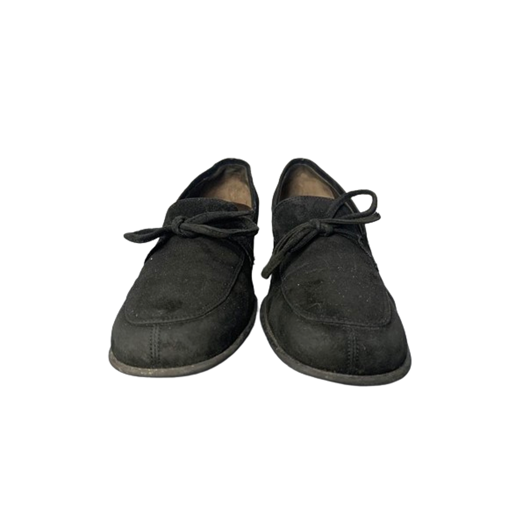 These Coach loafers, crafted from premium suede, offer a sophisticated and versatile addition to any wardrobe. The classic black design ensures they seamlessly complement various outfits, while the bow detail adds a touch of elegance. Ideal for both casual and formal settings, these shoes provide comfort and style. • Slip-on style with bow detail • Durable leather sole • Low 1-inch heel for added comfort • Round toe shape for a relaxed fit Signs of wear on soles and minor scuffs on suede.