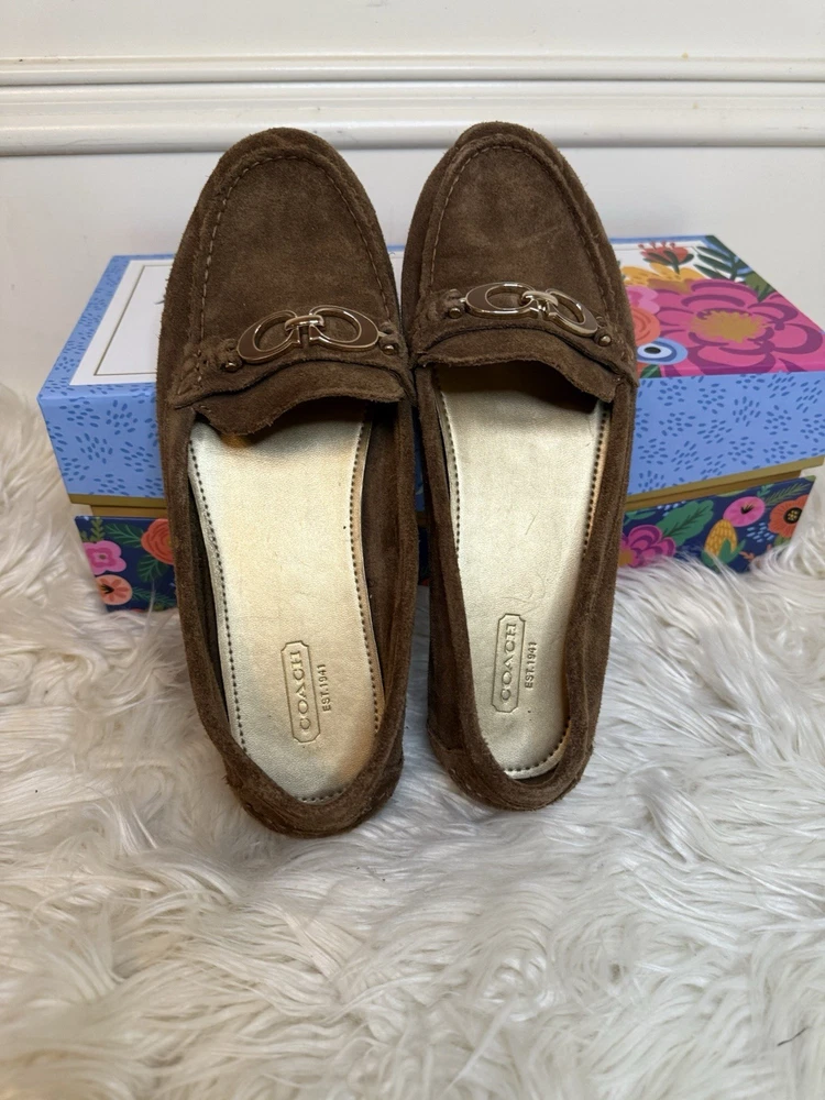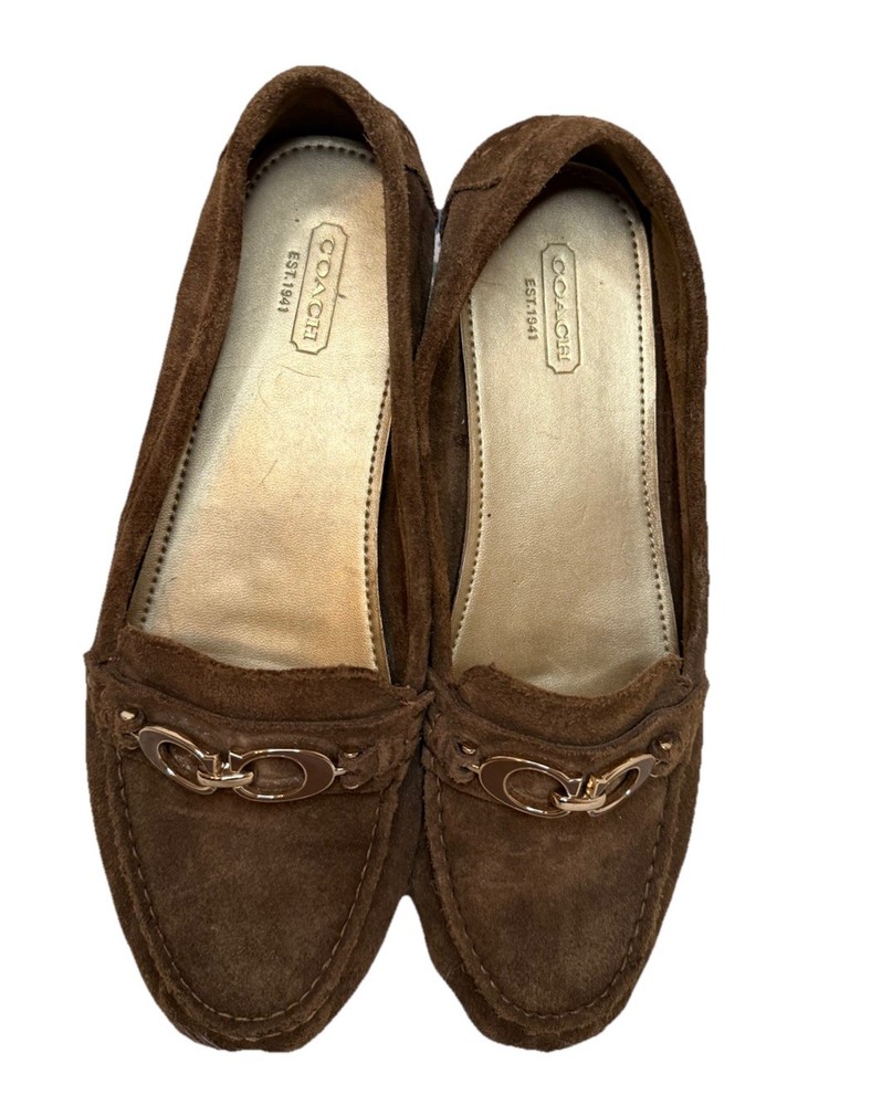 The Coach Women's Suede Fortunata Loafer in brown is a stylish and comfortable slip-on shoe for casual occasions. Featuring a solid pattern, round toe shape, and slip-on closure, these loafers are made of suede with a buckle detail for added flair. With a comfortable flat design and a B width, these shoes are perfect for women looking for a classic and versatile addition to their wardrobe. The Coach brand and timeless style make these loafers a must-have for any fashion-forward woman. Preloved and good condition, please look at all the pictures! Thank you!