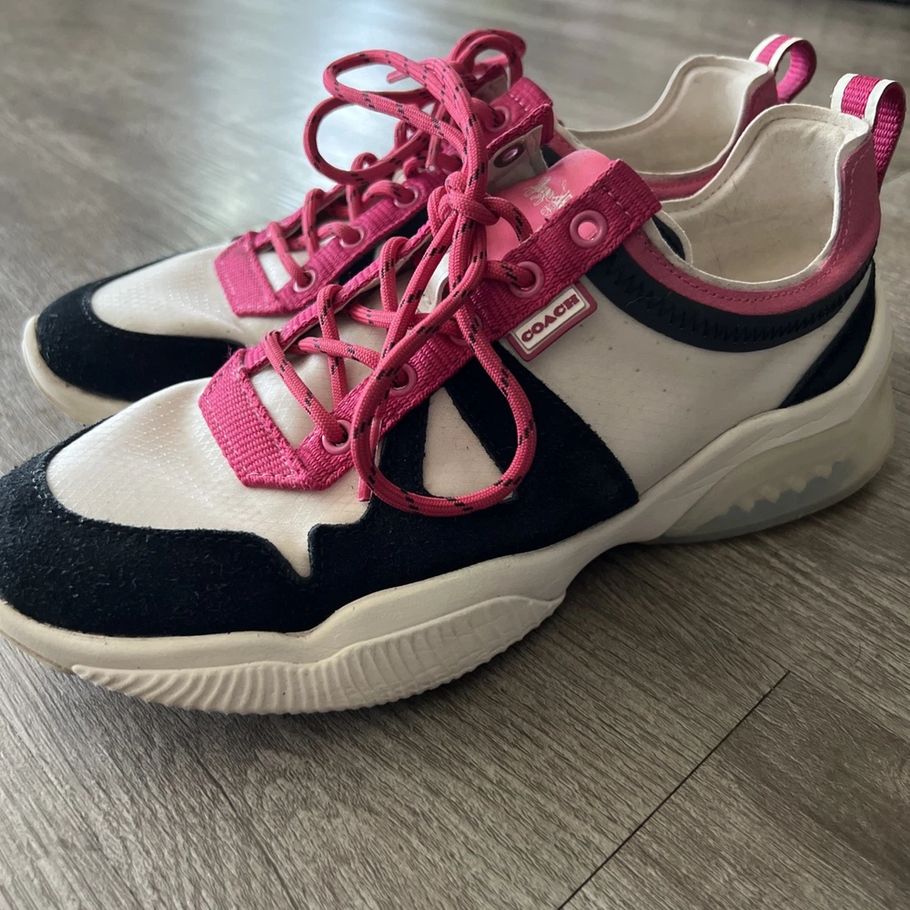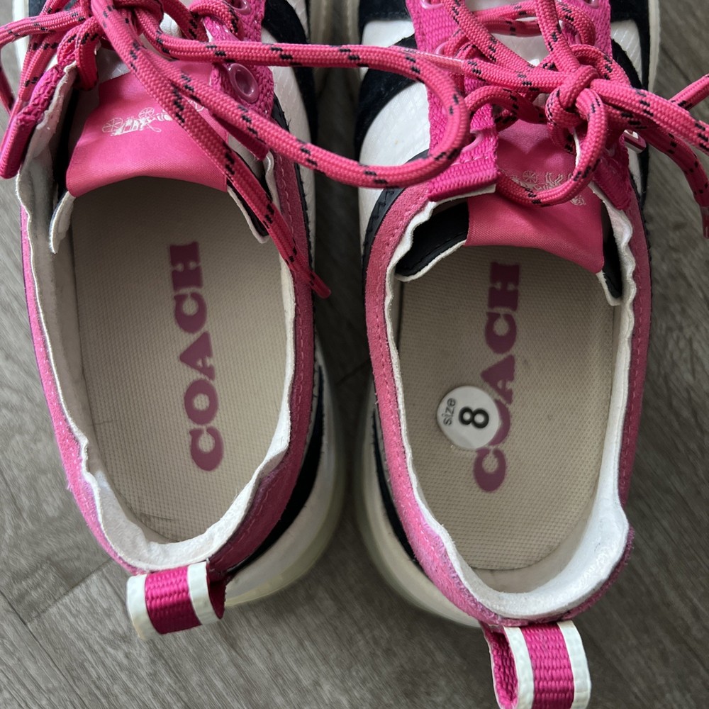 The Coach Women's Citysole Runner sneakers in black, milk, and deep pink are a stylish choice for active women. Featuring a lace-up closure and a lightweight, comfortable design, these sneakers are perfect for both casual wear and activewear. The geometric pattern with the Coach logo accents adds a fashionable touch, while the breathable suede lining and polyurethane outsole provide comfort and durability. Whether you're jogging or just running errands, these sneakers are a trendy option for the modern woman.