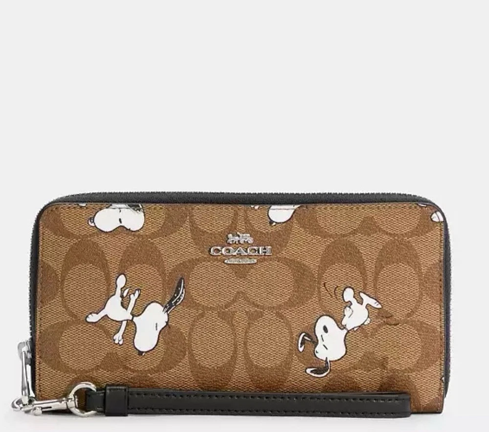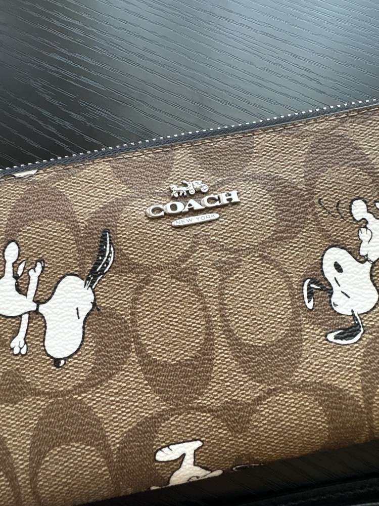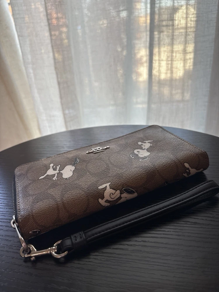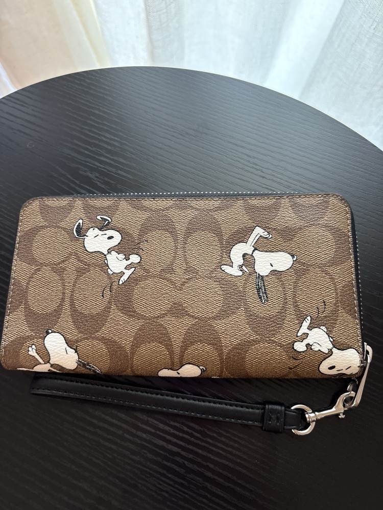 Authentic Coach wallet. Coach X Peanuts long zip around wallet in signature canvas with snoopy print. New without tags or original packaging. Signature coated canvas and smooth leather. Twelve credit card slots. Full-length bill compartments. Inside zip coin purse. Detachable wrist strap. 7.75 in x 4 in x 1 in. Beautiful must-have wallet!!