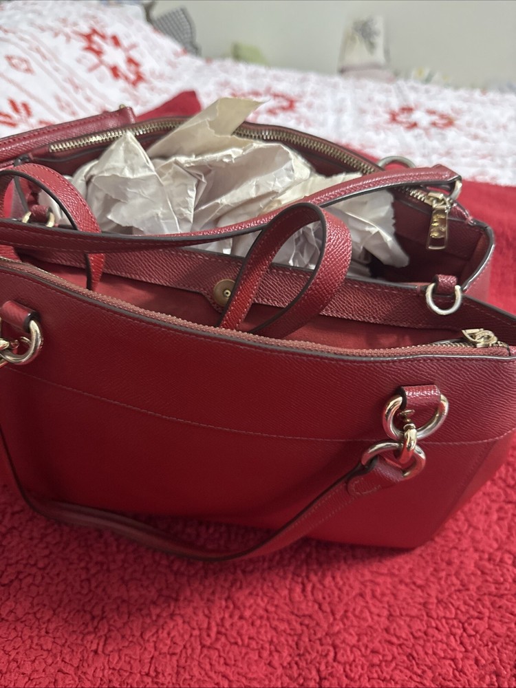 This is a large Coach crossbody bag in burgundy leather, accompanied by a matching wallet. The set is designed for women and offers a stylish and convenient way to carry essentials.