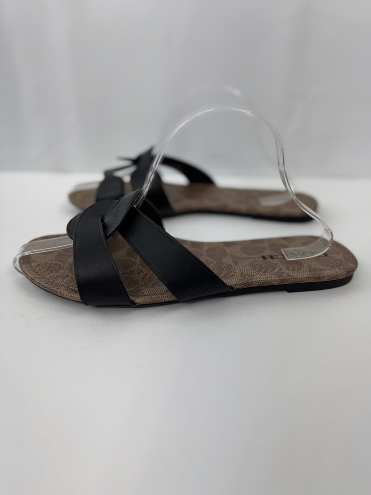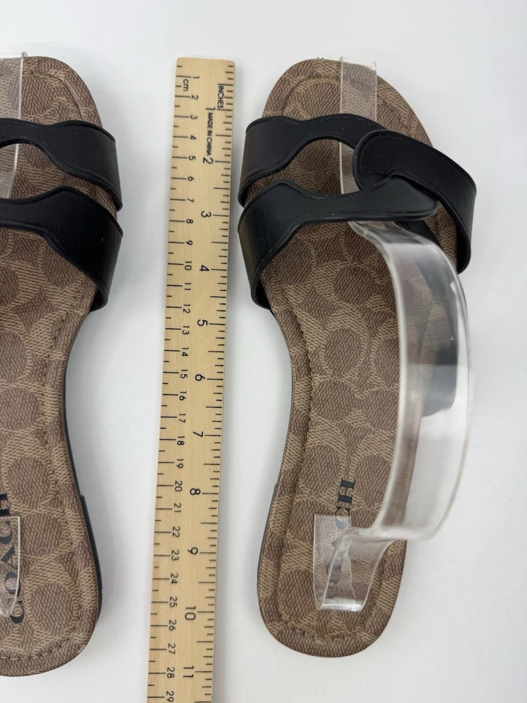Size 9B wide fit, so if you're prioritizing comfort instead of a tighter fit, consider these shoes... Please see photos for the condition of the shoes. A minor scratch in front of the shoes is shown in the photo. A summer wardrobe staple, these Coach sandals are perfect for beach getaways and city streets alike. This style features a strap made from interlocking leather bands, fashioned into the iconic C initial. They're finished with a signature canvas footbed and a rubber outsole for grip. Details & Care Upper Composition: Leather Lining Composition: Canvas Sole Composition: Rubber