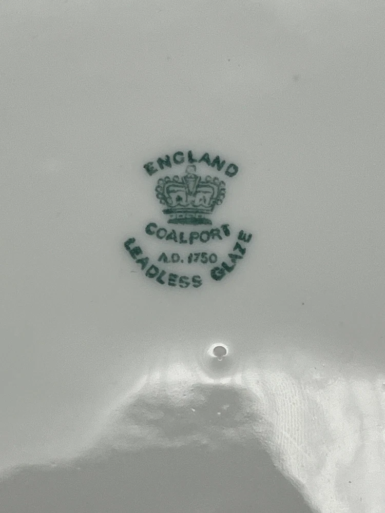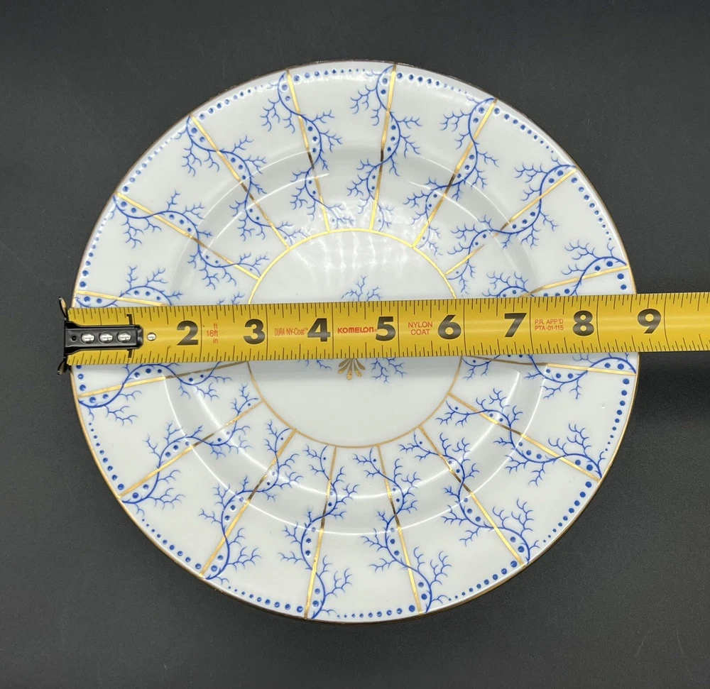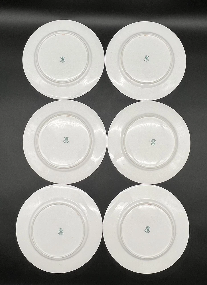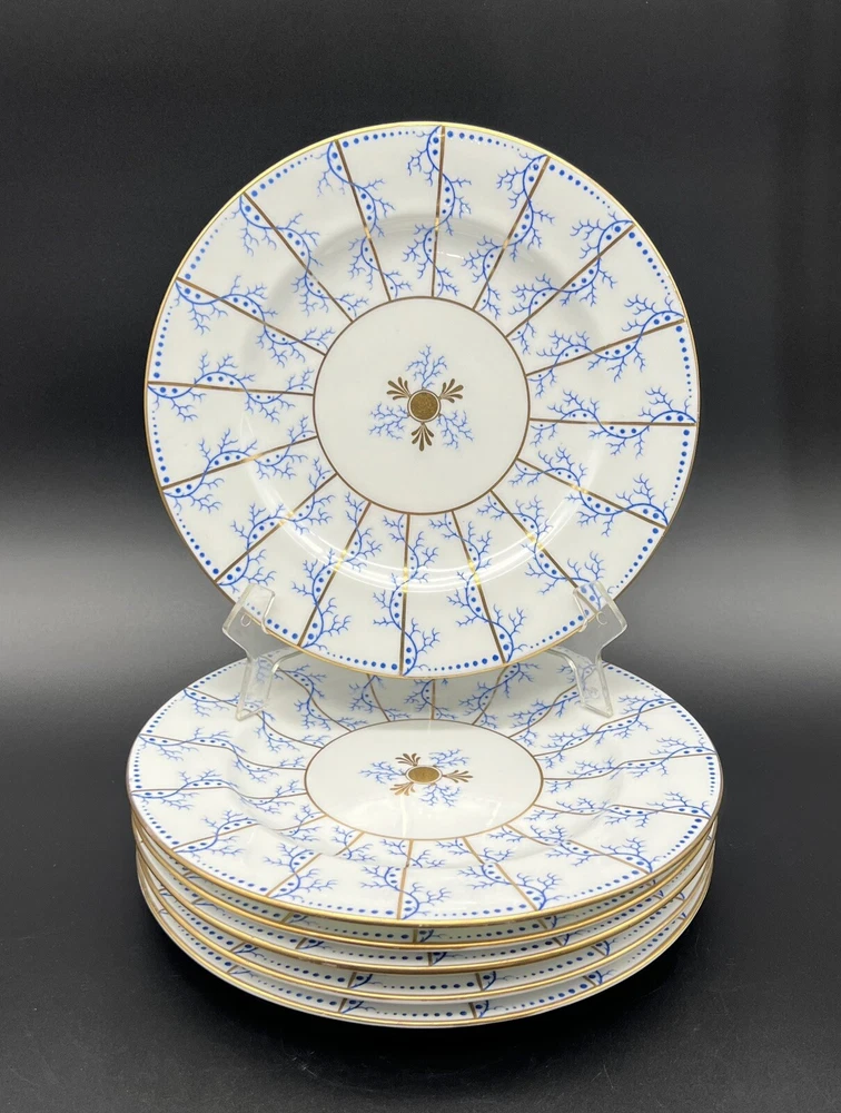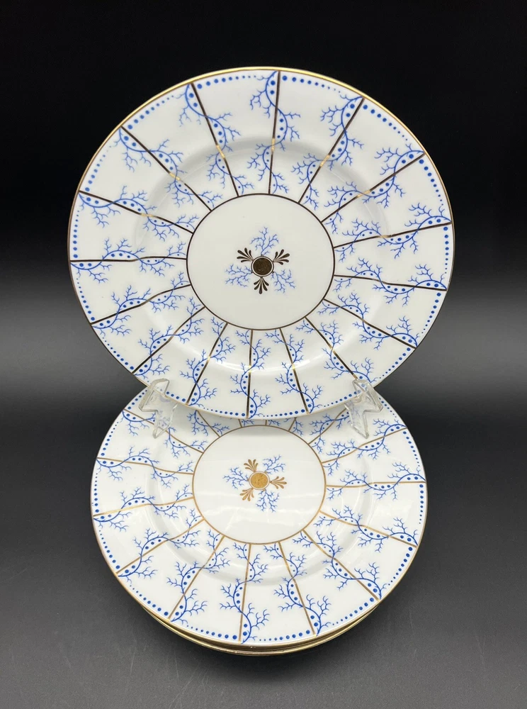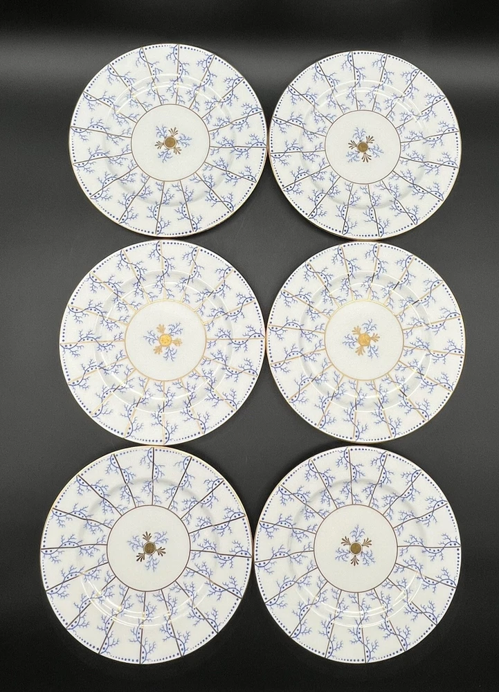 Add a touch of vintage elegance to your dining table with this stunning set of six Coalport salad plates. The round plates measure 8.5 inches in diameter and feature a beautiful blue and gold color scheme, perfect for all occasions. Made in England from high-quality porcelain, these plates bear the Coalport brand name and are stamped with a glossy finish. The set includes six plates, each with a unique backstamp, and is an original piece from the United Kingdom. These decorative plates are perfect for serving salads or any other dish and are sure to impress your guests. Add a touch of sophistication to your dining experience with this exquisite set of Coalport salad plates. Please check all photos carefully before purchasing, photos are part of the description, what you see is what you get. Coalport
