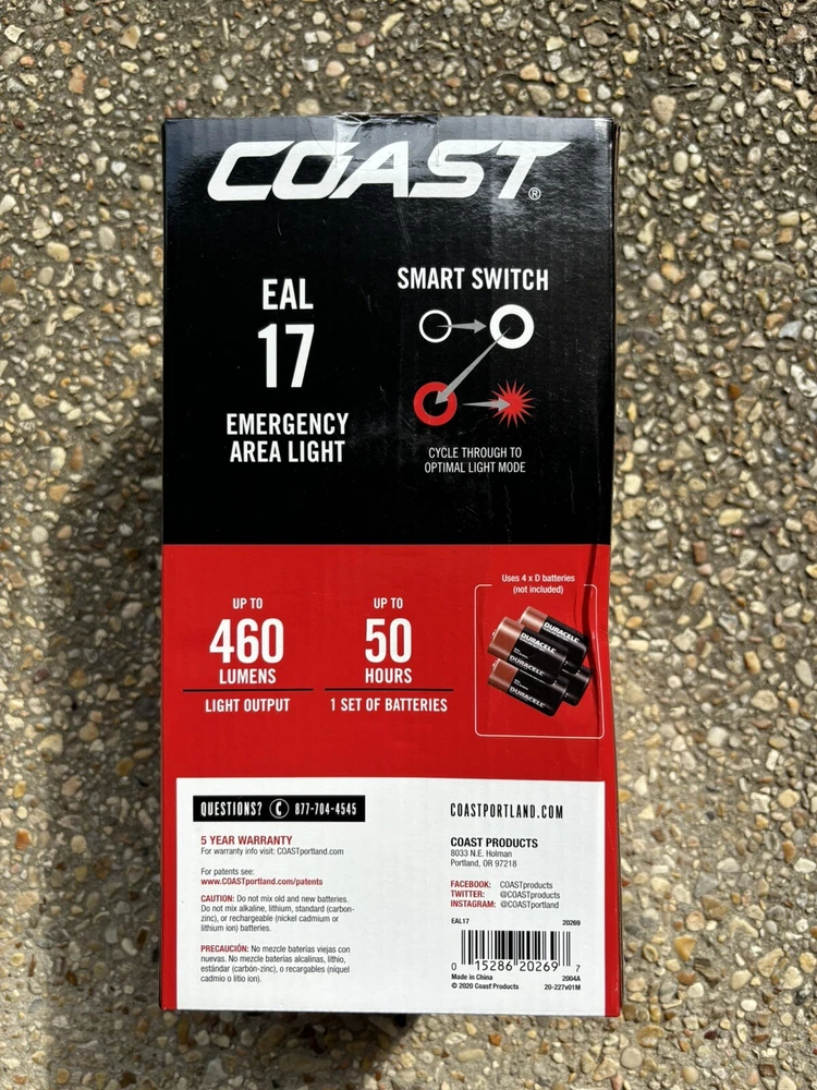 Be prepared for any emergency with the Coast Emergency Light. This high-quality lantern provides 460 lumens and can operate for up to 50 hours on just 4 D batteries (not included). It is perfect for camping, hiking, or to keep in your emergency kit. The Coast brand is known for their reliable and durable products, and this lantern is no exception. With a power source of batteries, this lantern is easy to use and replace. The compact design makes it easy to store and carry. Don't let the darkness stop you from being prepared - get the Coast Emergency Light today. Cycle option between high, low, red, or flashing red. Will need to ship ground since it has a battery, so may take a few days longer to arrive.