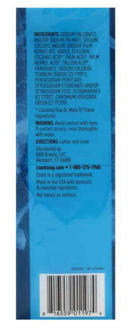 Product Line: Dose Not Apply Brand: Coast Shape: Rectangular Size: Regular Ingredients: Thick Rich Lather Type: Deodorant Soap Skin Type: Dry Skin Color: Blue Scent: Pacific Force Body Area: Body, Face, Hands Country/Region of Manufacture: United States Pattern: N/A Item Weight: 3.2 oz Features: Hydrating MPN: N/A gtin13: Dose Not Apply Personalization Instructions: Dose Not Apply UPC: Dose Not Apply Personalize: Yes California Prop 65 Warning: Dose Not Apply Department: Men, Teens, Women
