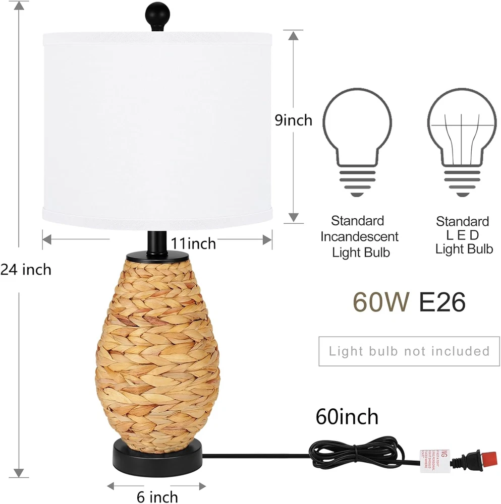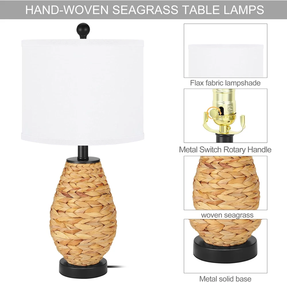 Room Type: Office, Living Room Style: Coastal Item model number: CHENHUI 210812 Connectivity Technology: USB Material: steel, Seagrass Brand: Does not apply gtin13: 313047959980 Light Source Type: LED Special Feature: Corded Is Waterproof: False Power Source: Corded Electric Indoor/Outdoor Usage: Indoor Voltage: 110 Volts Lamp Type: Table Lamp Item Weight: 7.84 pounds Batteries Required?: No Shade Material: Linen Special Features: Corded Shade Color: White Batteries Included?: No Control Method: Touch Is Cordless?: No Wattage: 60 watts Color: White Part Number: 2108122201 Lighting Method: LED Number of Items: 1 Maximum Compatible Wattage: 60 Watts Included Components: Bulb Product Dimensions: 11"D x 11"W x 24"H Base Material: Alloy Steel Mounting Type: Tabletop Switch Type: Push Button Shape: Bulb UPC: 313047959980 Number of Light Sources: 2 Number of Pieces: 2 Recommended Uses For Product: Decoration, Reading Type: Does not apply