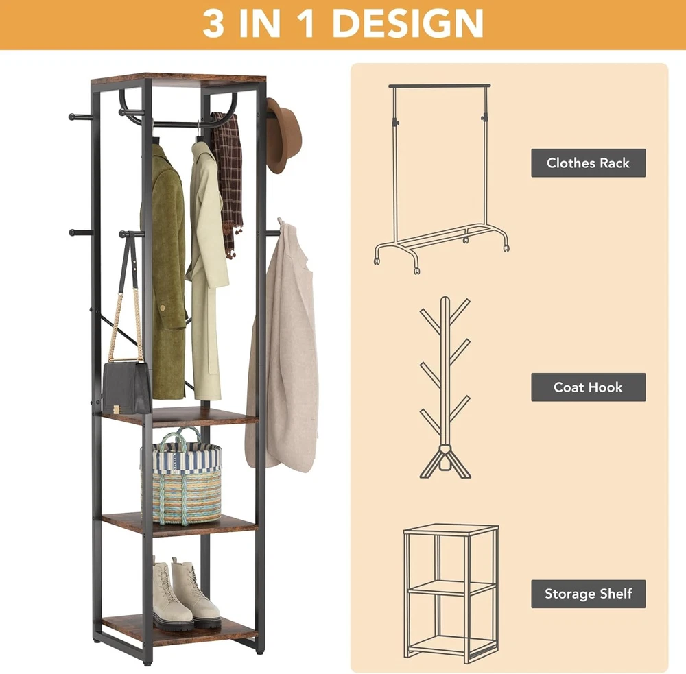 Product Description About this item 【3-in-1 Coat Rack】Crafted from sturdy and durable wood, this freestanding coat rack features 4 tier shelves perfect for shoes, bag and daily essentials, while up top, 8 ball-end hooks and a hanging rod provide an extra convenient place to hold your coats, hats, scarf or tote bags neatly. 【Space-saving Design】Thanks to the compact design, this industrial hall tree makes good use of any limited space or odd corner to provide additional storage space for clothes or daily essentials, perfect for small apartments and studio lofts. 【Sturdy Structure & X-shaped Brace】Made of particleboard and metal frame that ensures stability and durability, no wobble and collapse. X-shaped is designed in the middle to play the role of strengthening the structure. Each shelf can hold up to 45lbs of weight, while each hook bears up to 10lbs. 【Rustic Style】Clean design meets rustic industrial style, our wood standing coat rack stand lends a touch of industrial-chic look and classic beauty to your room, fits perfectly with almost all other furnishing items. 【Easy assembly & Customer Service】Comes with all installation components and clear installation guides included. If you have any problems about the product, please feel free to contact us. We will help you solve it and give you a satisfactory solution. High Quality Particle Board Made of high grade 0.59"particle board, which is strong corrosion resistance, waterproof, anti -scratch and easy to clean. Heavy-duty Metal Frame Crafted from durable steel frame that contributes to its outstanding bearing force, no wobble, and no collapse. X-shape Brace Reinforced by the rear x-shaped brace to ensure the stability, this coat hanger stand is of high quality, durability and can last for years. Adjustable Foot Pads Equipped with 4 adjustable feet for added stability and keep it balance, preventing the floor from being scratched. More Choices for You On Aug 6, 2025 at 19:36:32 PDT, seller added the following information: