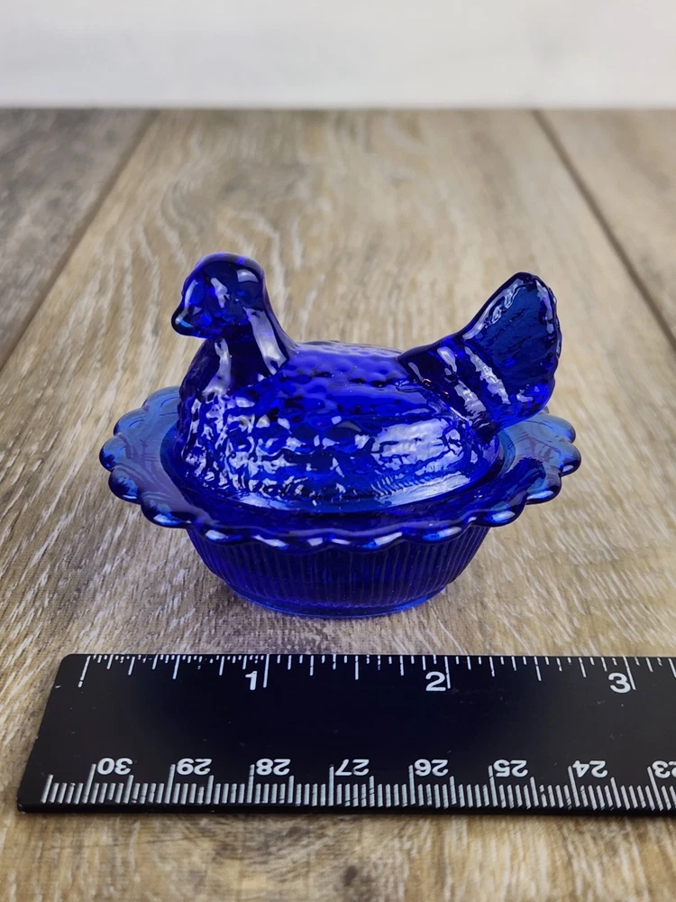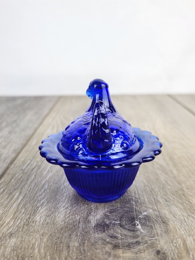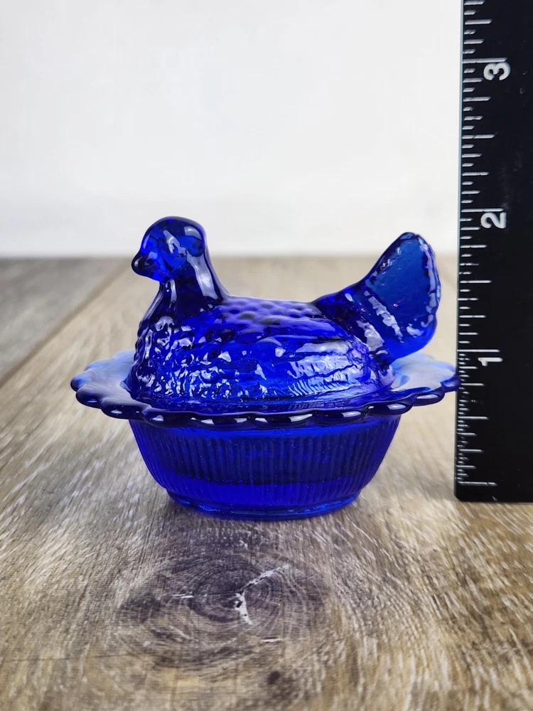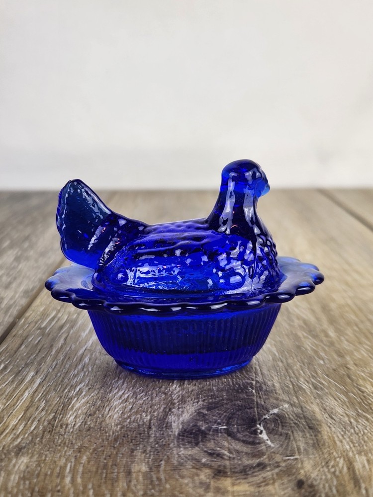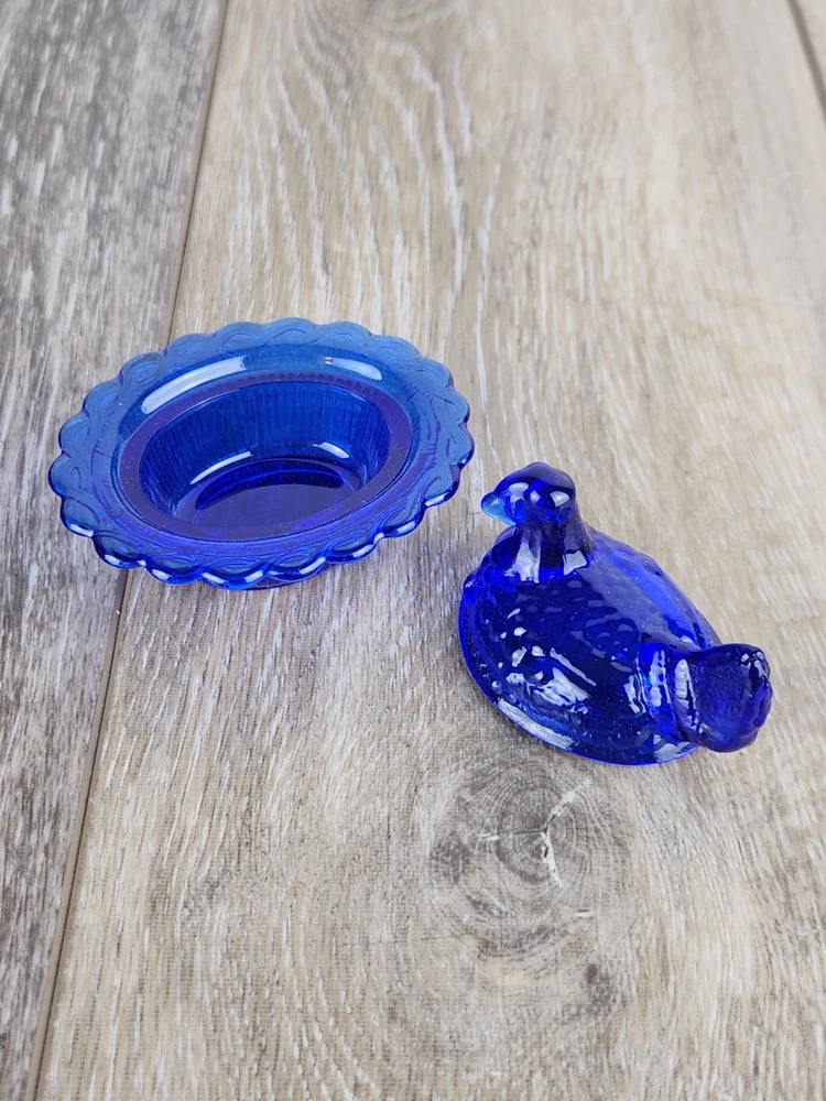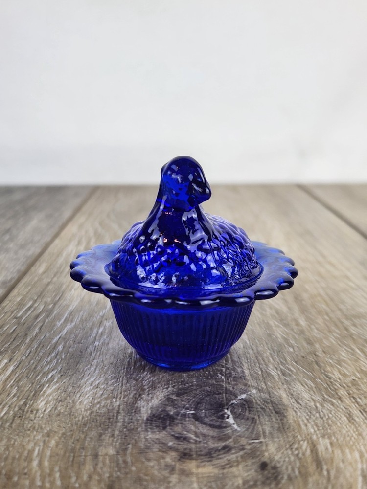 This Cobalt Blue Glass Hen on Nest salt cellar is a stunning example of cobalt blue glassware, featuring a ruffled edge base and a beautifully detailed hen lid. Ideal for use as a salt cellar, trinket box, or decorative accent, this piece combines both functionality and beauty. The vibrant cobalt blue hue shimmers in the light, making it a striking addition to any glass collection or farmhouse kitchen decor. Whether displayed as a centerpiece or used to store salt, spices, or small keepsakes, this glass hen on nest will be a cherished addition to your collection. *There may be imperfections from the creation process.