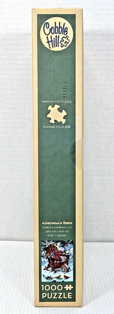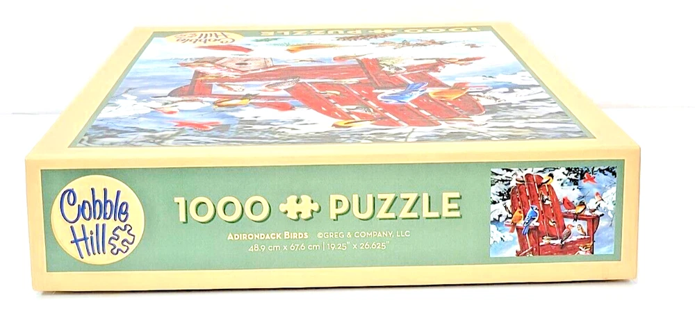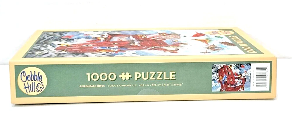 A little bit about the puzzle: Serial number: P14219 1000 piece jigsaw puzzle Dimensions measure 19.25 x 26.625 inches Features colorful artwork of birds found in the Adirondack region Depicts 22 birds and an adventurous ground squirrel Birds include cardinals, red-crowned woodpecker, bluejays, and more Made of premium quality thick cardboard pieces Part of Cobble Hill's "Birds of North America" collection Provides engaging puzzles for birdwatchers and nature lovers Durable for repeated use - can be taken apart and reassembled Finished puzzle looks great framed and displayed An entertaining puzzle that also educates about regional birds We did not work the puzzle, nor did we count the pieces, so we cannot guarantee all pieces are present. Each item is carefully packaged to prevent any damage and is shipped immediately with tracking.