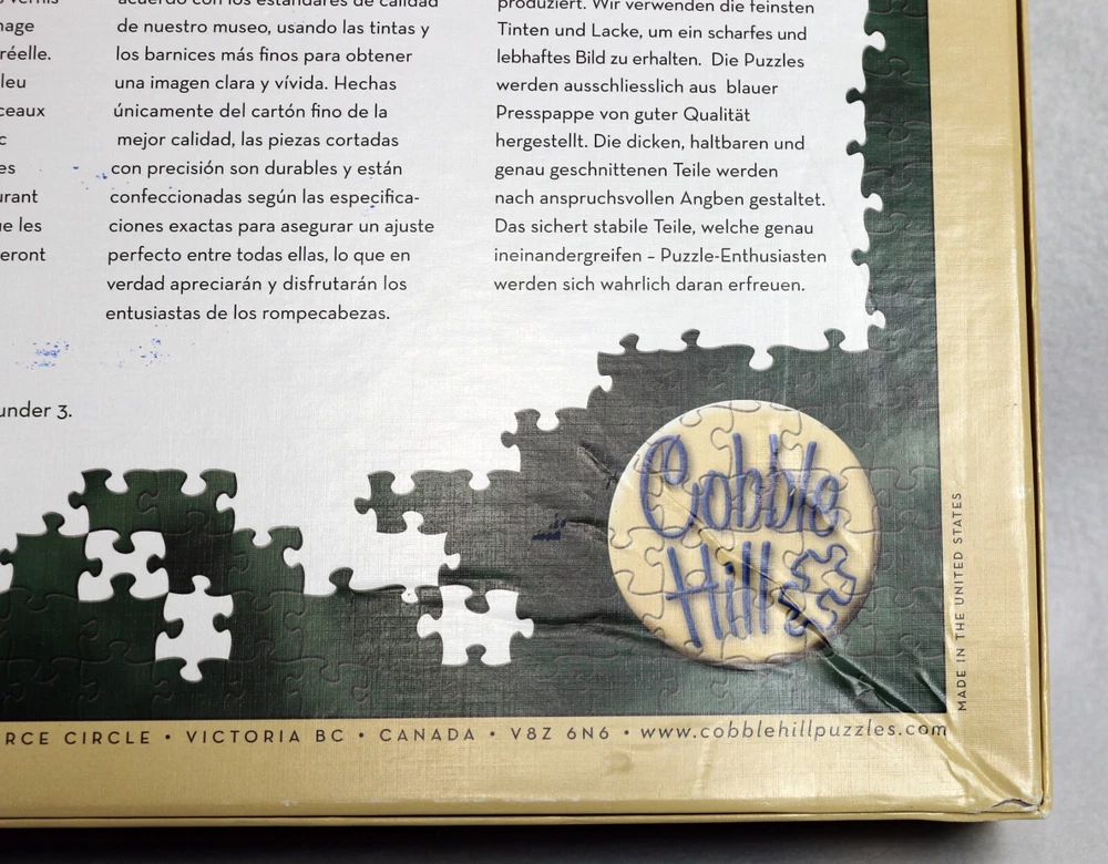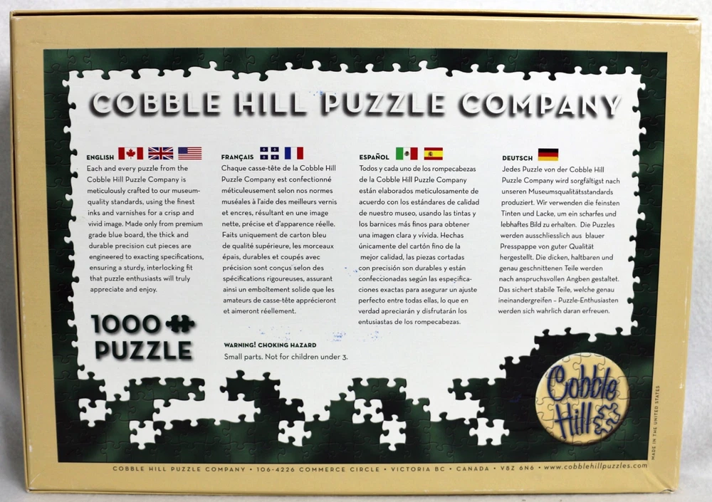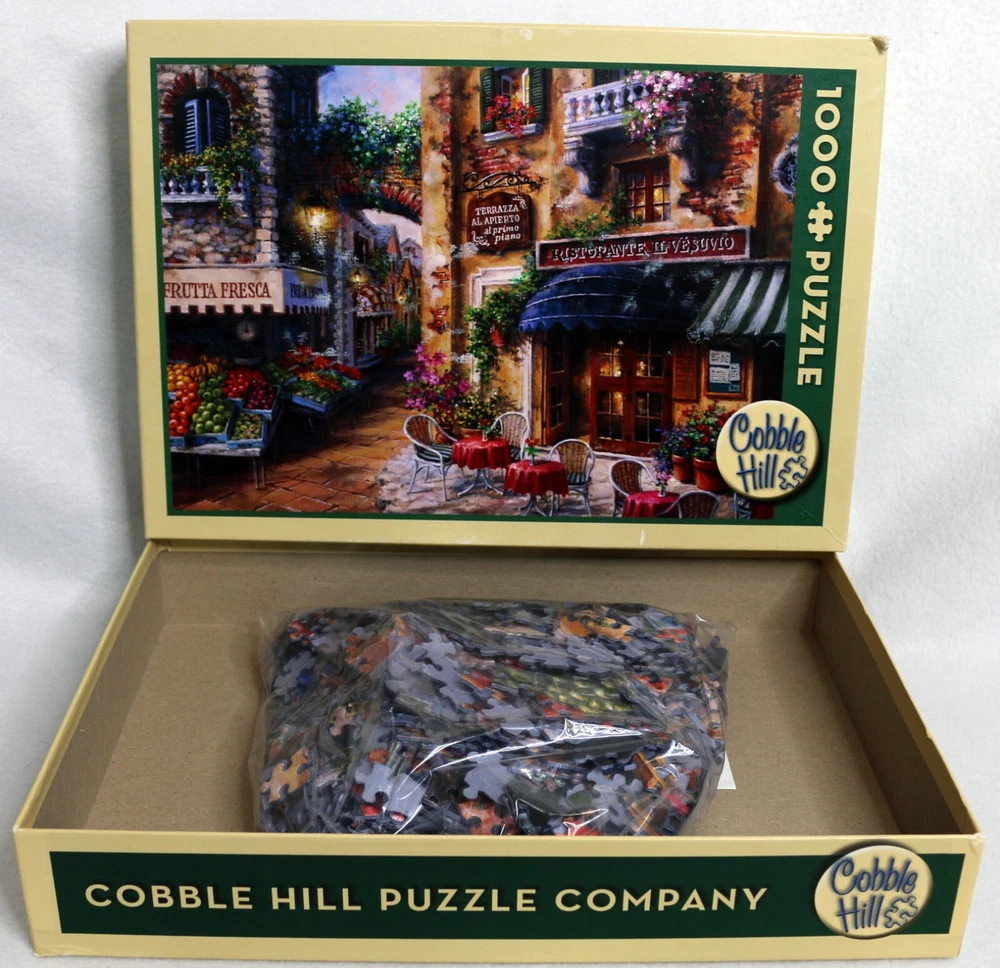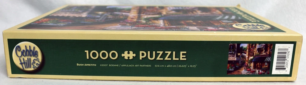 Indulge in the world of Italian cafes with the Cobble Hill Buon Appetito jigsaw puzzle. This 1000-piece puzzle features a colorful and intricate design that will transport you to the streets of Italy. Made of high-quality cardboard material, this puzzle is interlocking, coming from a smoke-free home, making it perfect for households. The puzzle is complete and measures 26 5/8" x 19 1/4" once assembled. It is suitable for ages 12 and up, and is a great addition to any puzzle collection. Enjoy the challenge and satisfaction of putting together this puzzle on your own, or bond with family and friends over a fun and engaging activity. Enjoy your meal. :-) Doing puzzles has some hidden benefits Excellent qualities : Cultivate concentration, patience, and temper your will Movement development : Train hand-eye coordination and precise small movements Spatial intelligence : Improve visual discrimination of colors and shapes Critical thinking ability : Understand the relationship between parts and the whole, and draw inferences from one example to explore the future Relaxes your mind : Relieve work pressure and release yourself Brain development : Enhance memory and may help prevent or slow brain degeneration * We did not work the puzzle or count the pieces, but we verify the number count at your request . Puzzle pieces are all bagged. Each item we ship is carefully packaged to prevent any damage and is shipped immediately with tracking. Anticipated Benefits of Puzzles for Children Overcoming attention deficit Strengthening visual memory Improving problem solving skills Strengthening hand-eye coordination Improve fine motor skills Improve gross motor skills Shape recognition ability Gain the ability of setting goals Learning patience
