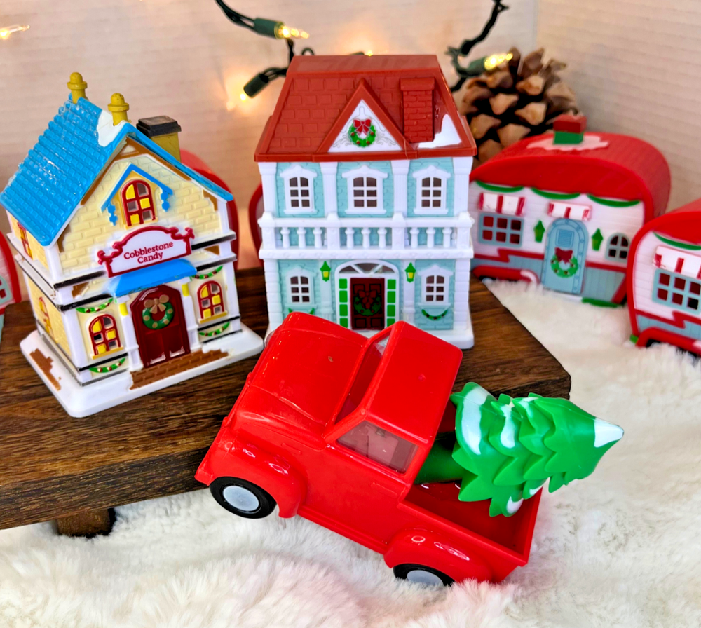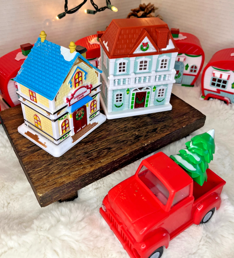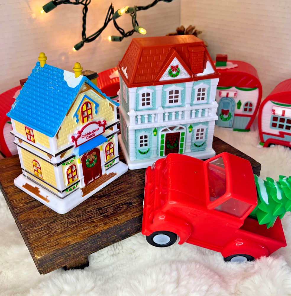 Cobblestone Corners Village Lot 10pc Light-up/Houses/Trailers/Truck Bring instant glow to your holiday display with this Cobblestone Corners village lot. What’s included (10 pcs total): • 2 houses approx. 7" tall • 7 trailers approx. 4" x 2.5" each • 1 red pickup truck with tree, approx. 5" Lighting: All lighted pieces use battery-pack LEDs . Every pack tested and working ; fresh batteries installed right before listing. Condition: Display-ready and very clean. Typical manufacturer paint anomalies in spots (from production). Tailers, 2x houses are in excellent with no breaks or repairs. Truck is missing one headlight cover and has a faint scratch/hairline crack on one window. Selling as a set. Why people love these: Cobblestone Corners is the customizable, kid-friendly village line. Perfect for tiered trays, mantle scenes, and DIY repaint glow-ups. Translation: festive, durable, and not precious. Shipping: Packed with ridiculous care in clean, upcycled materials so your tiny town arrives ready for zoning disputes.