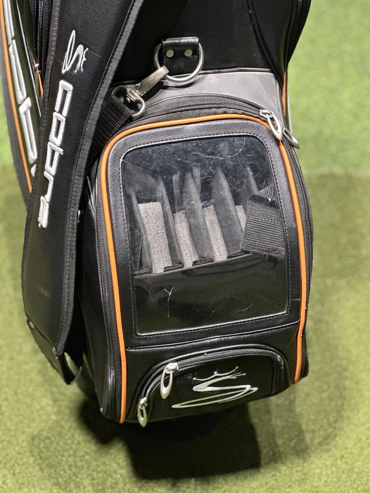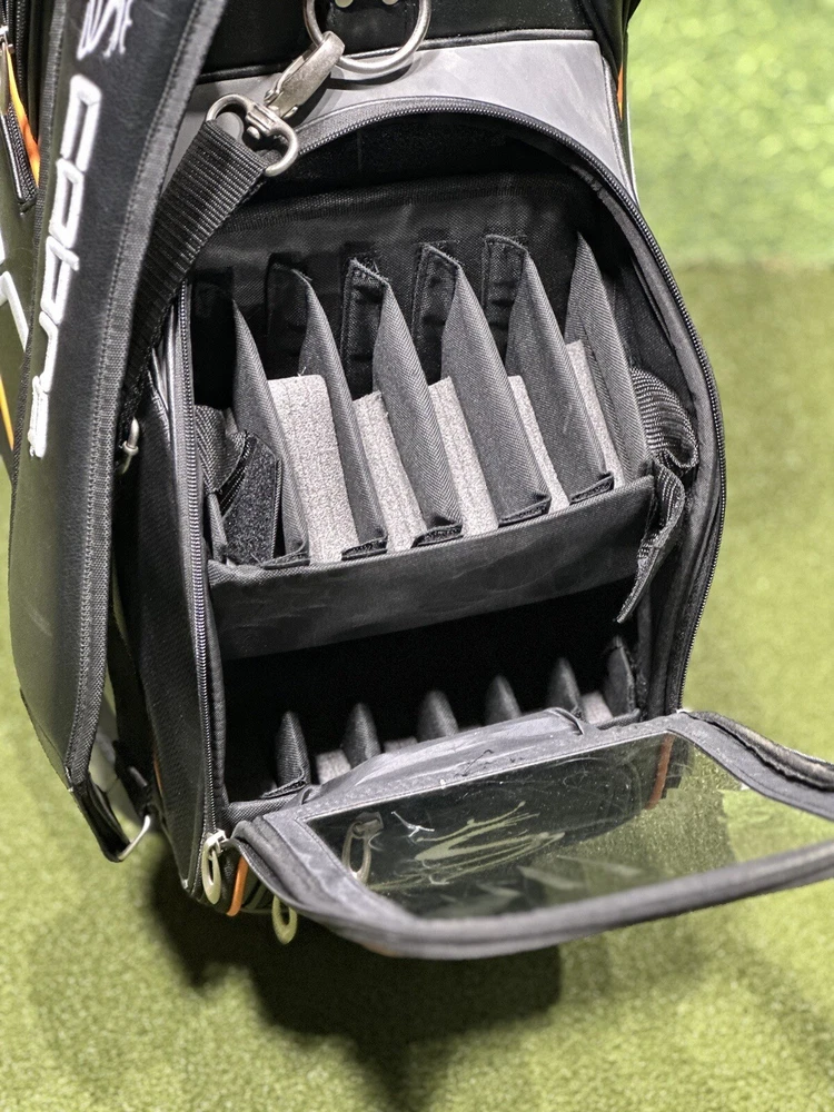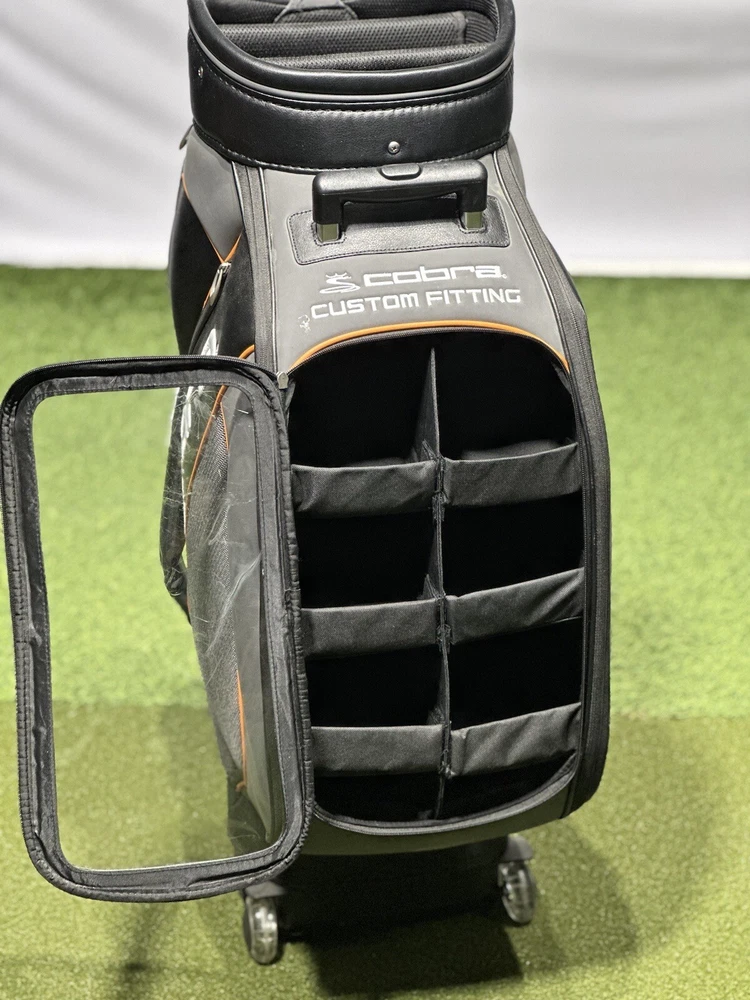 We are a reputable golf company that has been in business in St. Louis, Missouri since 1975. We have been doing this for 40 years because we do things right the first time. WE HAVE THE FASTEST SHIPPING ON EBAY! Don't believe us? Check out our Feedback. If you have questions, please feel free to ask. As always, thank you for looking. Cobra Custom Fitting Wheeled Golf Bag COLOR: Black/White/Orange/Gray STYLE: Wheeled Staff Bag DIVIDERS: 5-Way Divider CONDITION: Near-MINT - Never used on course (9.0/10) This RARE custom fitting bag can hold iron heads on one side and driver, fairway wood, and hybrid heads on the other. The top of the bag is 10" x 12" If you have questions, please let us know!