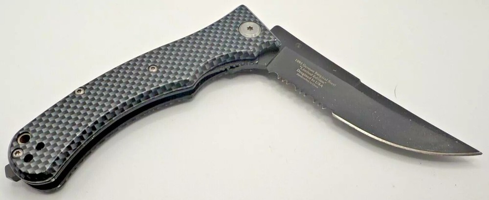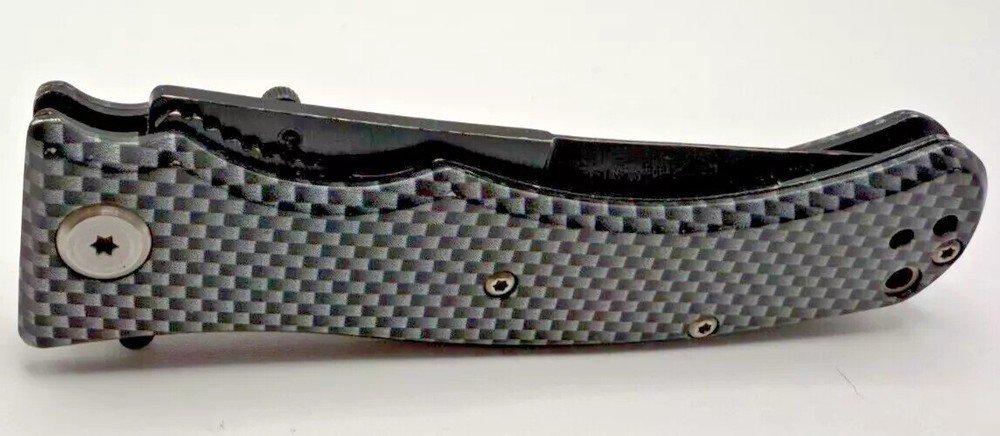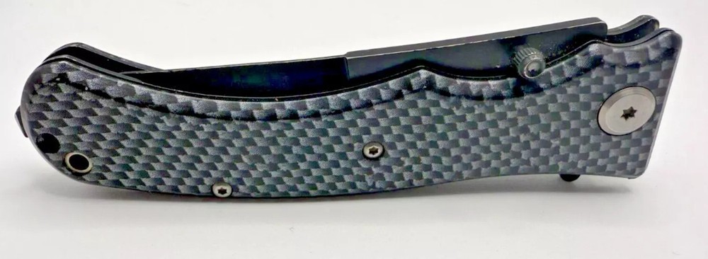 This folding knife offers a durable serrated blade for versatile cutting needs, combined with a lightweight carbon fiber handle for a firm grip. • Folding design for portability • Serrated blade for adaptable use • Sturdy carbon fiber handle • Secure locking mechanism • Compact and lightweight Minor blade wear with small surface scratches. Closed length = 4.5 inches. Blade length = 3.5 inches.