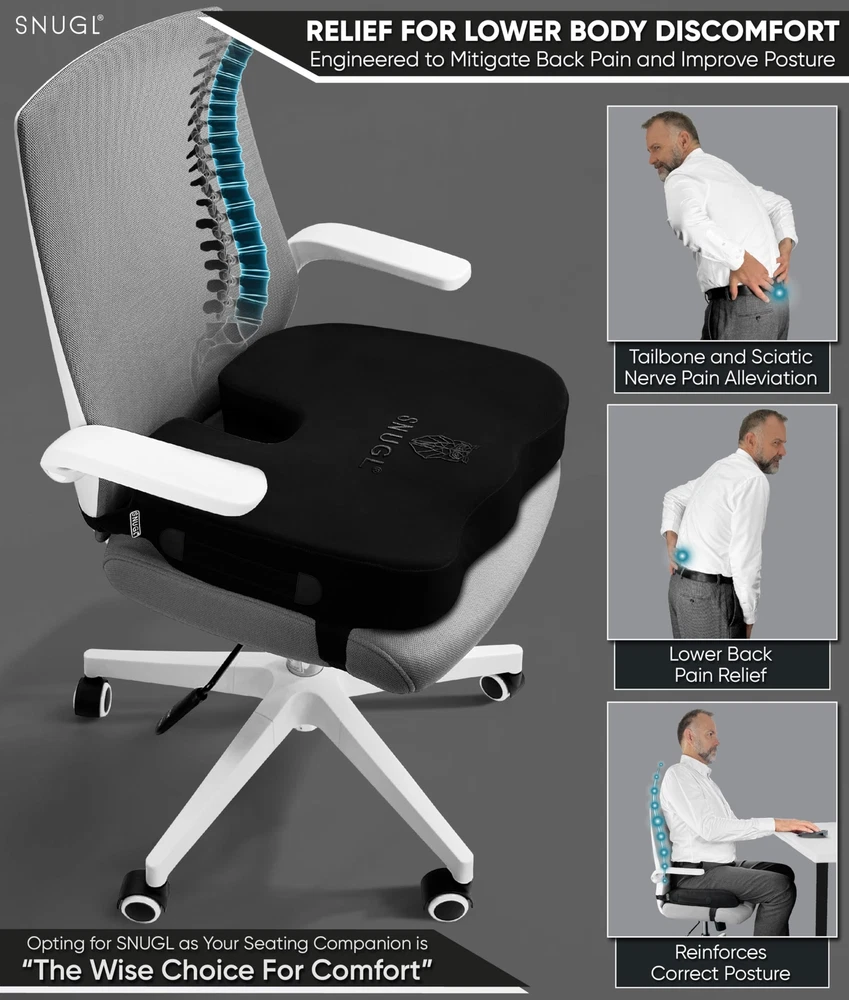 THE WISE CHOICE FOR COMFORT - At , we prioritize lasting comfort, support, and pain relief. Transform any chair into a luxury seat with our ergonomic coccyx cushion, ideal for long sitting at home, in the office, or while driving. Perfect as a lumbar support pillow for office chairs, car seats, or gaming chairs. THICKER MEMORY FOAM FOR SUPERIOR SUPPORT - Our cushion is 20% thicker than standard seat cushions, featuring premium Visco-Elastic memory foam for enhanced comfort and pressure relief. Enjoy cloud-like softness that supports your lower back, hips, and tailbone, making it perfect for sciatica and coccyx pain relief. ERGONOMIC U-SHAPE DESIGN - Designed to promote healthy posture and improve circulation, our orthopedic cushion alleviates pain from sciatica, lower back pain, and post-surgery recovery. Itβs the perfect chair pad for office workers, truck drivers, wheelchair users, and anyone needing added comfort during long hours of sitting. DURABLE, NON-SLIP, & PORTABLE - Built to last, our cushion maintains its shape with daily use, thanks to high-quality, slow-rebounding memory foam. The non-slip silicone base and dual adjustable straps ensure it stays in place on any chair or seat. Includes a side handle for easy portability, making it great for travel. HYPOALLERGENIC & EASY TO CLEAN - The soft velour cover is hypoallergenic, breathable, and machine washable, with a hidden zipper for easy removal. Available in multiple colors, it fits seamlessly into any decor, whether youβre using it at home, in the office, or on the road. Ideal for those seeking comfort and pain relief with style.