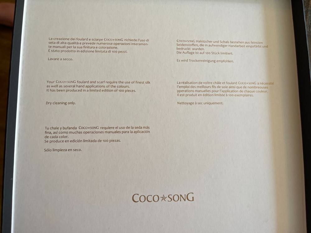 Authentic 100% silk scarf/wrap. Limited edition of 100. Coco Song Measures 90" square. Check out my other listings. I sell a variety of new and vintage items. Browse by see other items , or at my store Songbird’s treasure. Add me as a favorite seller or store. I list new items daily. Smoke free, pet free home! BUY WITH CONFIDENCE! Same user I.D. since 2003. I strive to provide quality items and excellent customer service. Thanks for looking and come back again!