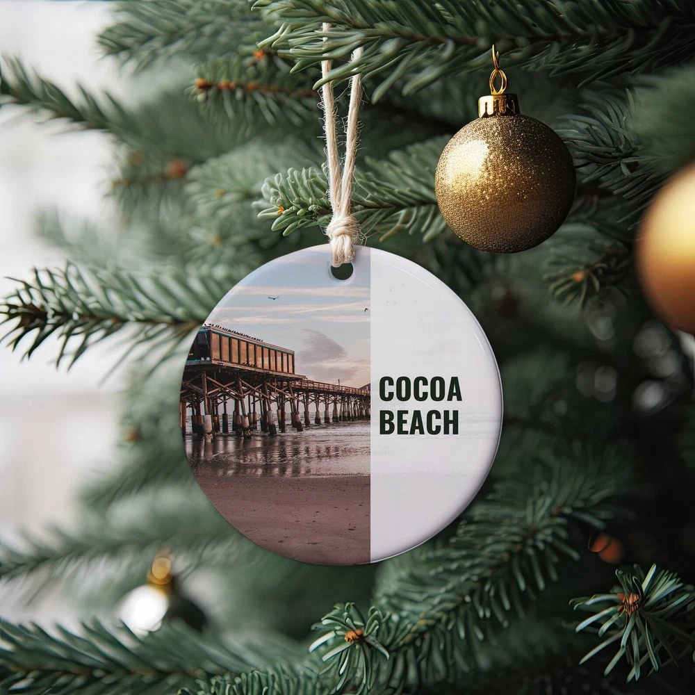 Cocoa Beach Christmas Ornament Christmas Gift Cocoa Beach Gift Cocoa Beach Travel Christmas Decor Cocoa Beach Souvenir Travel Gift Material: Ceramic Color: White Shapes: Circle, star, heart and oval Can be printed on both sides Imprint full-color artwork, photos, or logos Hole for hanging string and hanging string included Printed in the USA