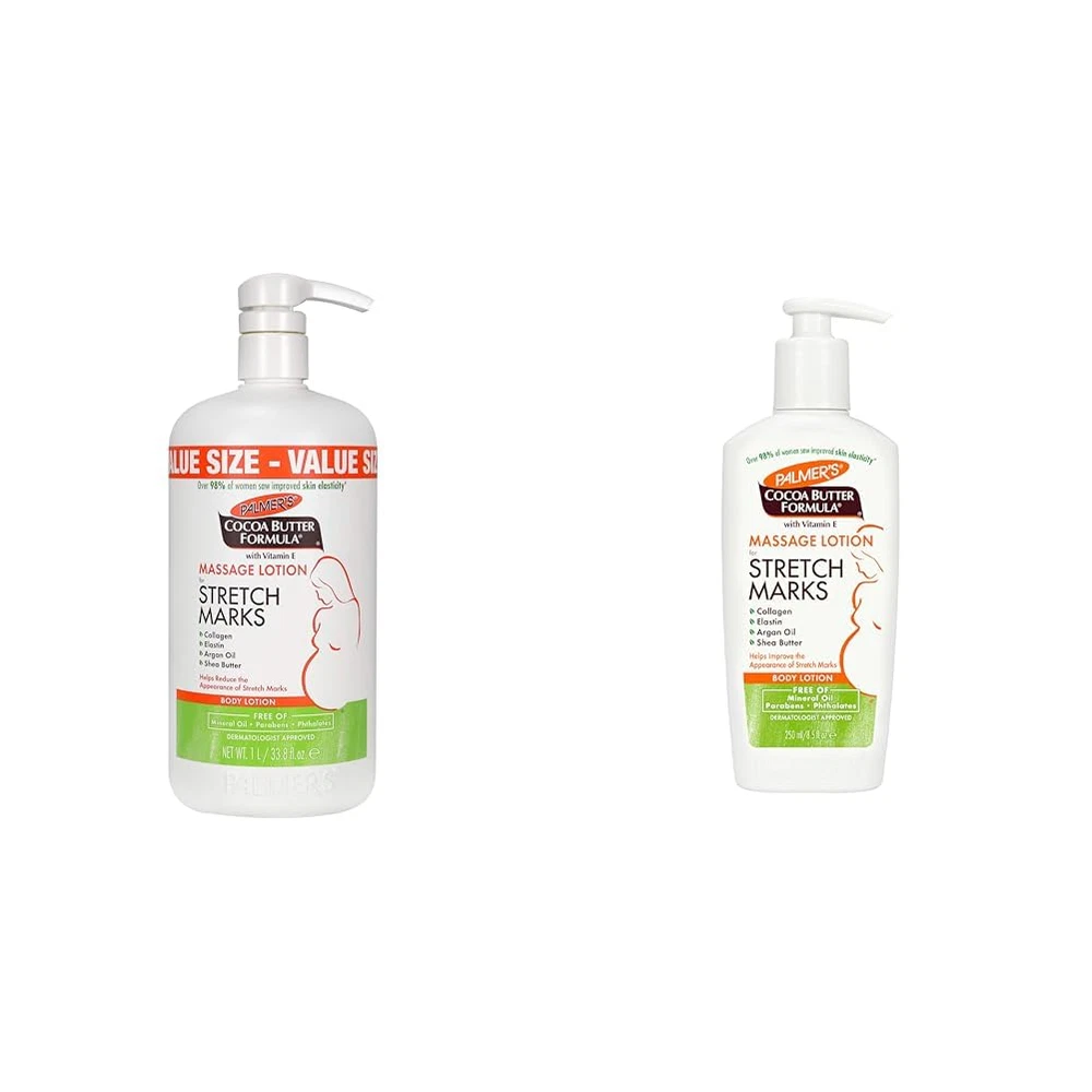 Stretch Mark Lotion: This non-greasy deep moisturizing body lotion is ideal for all-over body use to improve skin elasticity texture and tone and is widely recommended for stretch marks during and after pregnancy or weight fluctuation Natural Factors: This hydrating and hypoallergenic body lotion formula blends Pure Cocoa Butter and Shea Butter Argan Oil Collagen Elastin and Lutein to keep skin supple and moisturized for 48 hours allowing skin to stretch more easily; a pregnancy must-have! Finest Ingredients: We use only the finest natural, raw ingredients for soft, hydrated and beautiful hair & skin. We support sustainable production of Shea & Cocoa Butter and Coconut Oil. You can feel good about what you put on your hair and skin Choose What's Real: Our nourishing skin care and hair care products feature real, high-quality, plant-based ingredients. Our product line for whole body care includes body butter, creams, balms, lotions, oils, soaps, pregnancy and stretch mark care Why Palmers? For over 180 years, Palmer's has crafted treatment-oriented beauty products using Cocoa Butter, Coconut Oil, Shea Butter, Olive Oil & Vitamin E to soothe, hydrate, soften, replenish and revitalize skin and hair Nine out of ten pregnant women develop stretch marks at some point in their pregnancy. And aside from the belly, thighs, hips, breasts, and buttocks can all show signs of stretching. The cause? The collagen and elastin fibers that keep your skin firm and tight stretch and tear due to the pregnancy hormones and the pressure on your body from the rapid weight gain. While you can’t prevent stretch marks, you can help reduce their appearance with the support from Palmer's. Whatever product you choose - whether it's a stretch mark cream, a stretch mark oil, or a stretch mark lotion, natural cocoa butter is safe to use on your body while pregnant and helps reduce stretch marks as you and your baby grow. Palmer's Cocoa Butter Formula Massage Lotion helps visibly improve skin elasticity and reduce the appearance of stretch marks. Pure Cocoa Butter, Shea Butter, Natural Oils, Collagen, Elastin, and Lutein keep skin moisturized and supple for 48 hours. A pregnancy must have, this everyday body lotion is widely recommended for stretch marks during and after pregnancy. This non-greasy lotion is ideal for all over body use, in place of your regular skin moisturizer. Proudly made in U.S.A.