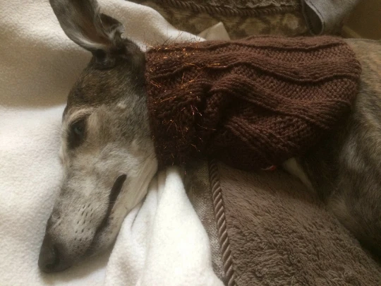 Cocoa Color with Copper Fringe Greyhound Dog Snood **100% donation to GREYlong to find a cure for canine cancer** T his is a simply fun snood, hand knitted in a cocoa colored acrylic yarn with a wispy copper fringe. The first picture is the most accurate copy of the cocoa color, but the 2/3 pictures show what it would look like on your dog. It is used to cover your pups ears from weather or food. It slides over your dog's head to cover those ears when they are walking in frigid weather. Our greyhounds use their knitted snood with their coats. Our poodle, beagle, and basset friends wear them when they eat. Keeps those ears out of the dog dish. Details for the snood that you are bidding on as shown above: hand knitted in a single ply yarn ; length: approx. 11 inches; neck opens 13 - 16 inches; body stretches to 15 - 22 inches; 100% washable, cool temp - air dry; measurements are provided so that you can determine if this will fit your dog. Can be "turtle necked" as shown in the last picture If you have any questions, please contact me. GREYlong We established a not for profit group called GREYlong to find a cure for canine cancer. All money from this sale is donated to GREYlong. Federal tax id is 03-0609843. I can only do it with your help! May you and yours GREYlong! GreyhoundJazzy donates to adoption programs and animal health studies. Ordering Information Paypal is accepted. If you will be out of town, let me know, as I am happy to hold your order. Payment within 3 days of invoice is requested!