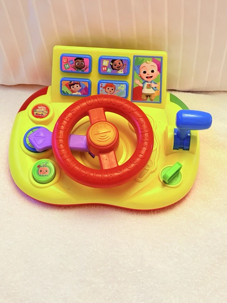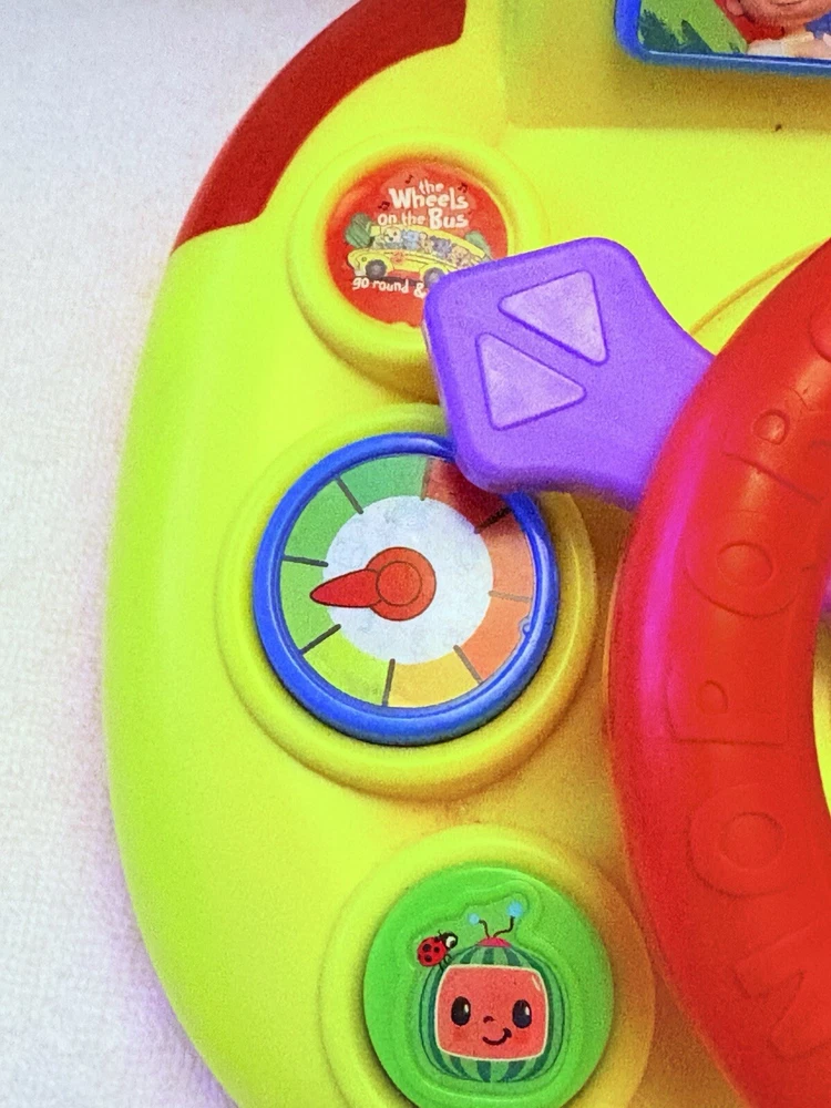 The Cocomelon Wheels On The Bus Learning Steering Wheel Interactive Toy by Just Play is a yellow interactive toy designed to help babies develop hand-eye coordination, language skills, and motor skills. With 60 phrases, this unisex toy provides an engaging learning experience. Made in China.