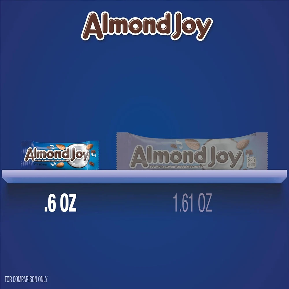 Contains twenty-five (25) 0.6-ounce ALMOND JOY Coconut and Almond Chocolate Snack Size Candy Bars in a 15-ounce pantry pack Keep your favorite chocolate candy and almond duo neat and organized with a ALMOND JOY candy box that you can store in the pantry or fridge Includes 25 individually wrapped kosher and gluten free ALMOND JOY coconut candies in a re-closeable and stackable box to protect your snack size candy treats Use an ALMOND JOY pantry pack during relaxing moments alone, movie nights or for snacking at your desk anytime you need a sweet chocolate candy snack Chill and enjoy these coconut sweets as back-to-school snacks, family sharing moments and midday treats whenever the moment strikes Island time is all the time when you take a bite of a snack size ALMOND JOY chocolate candy bar. When you need a break from the weekday craze, escape into a paradise of bliss when you bite into a delicious fusion of creamy chocolate, sweet coconut and whole almonds. It's the perfect treat to eat wherever life takes you. No doubt, it's an ALMOND JOY candy bar! Indulging in this sweet combination is the perfect way to relax during the workplace craze or throughout an eventful weekend.