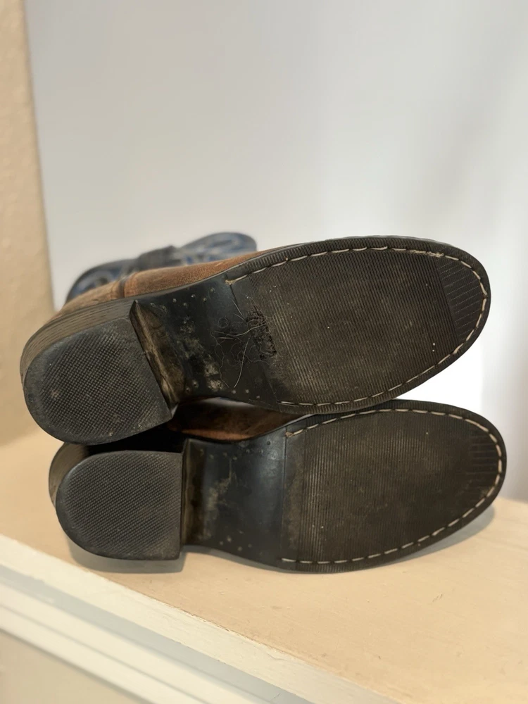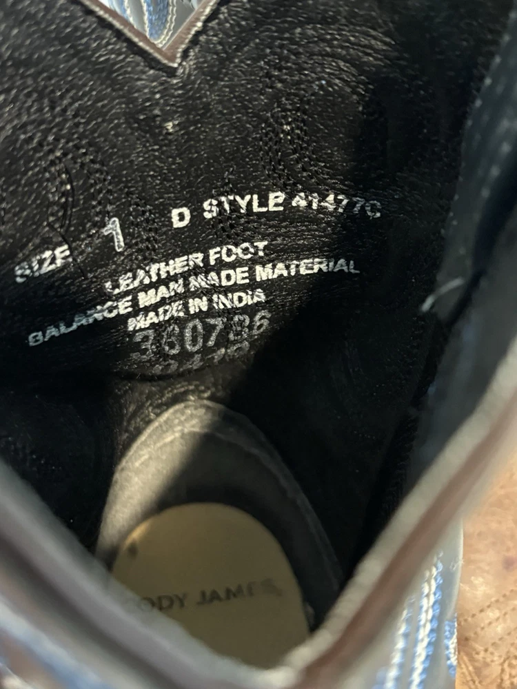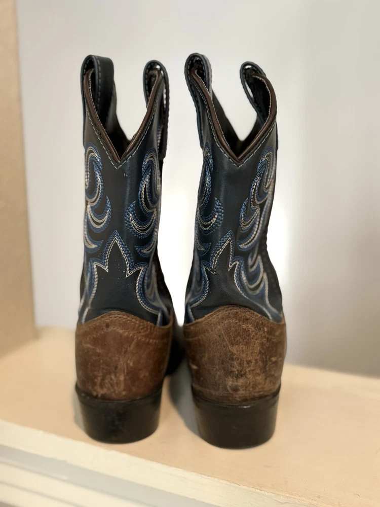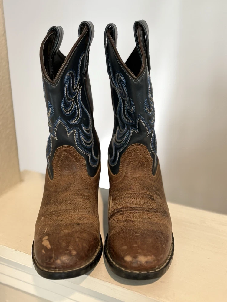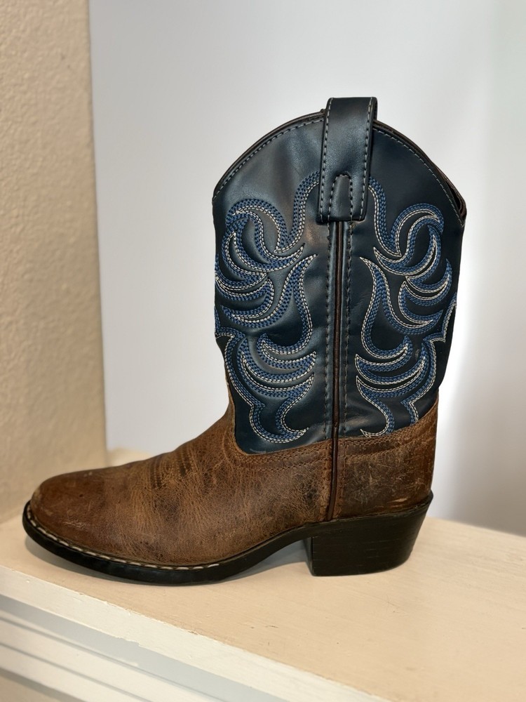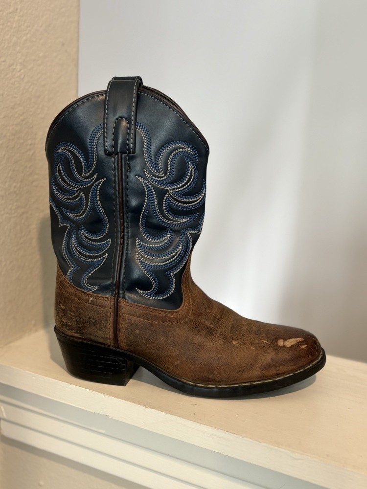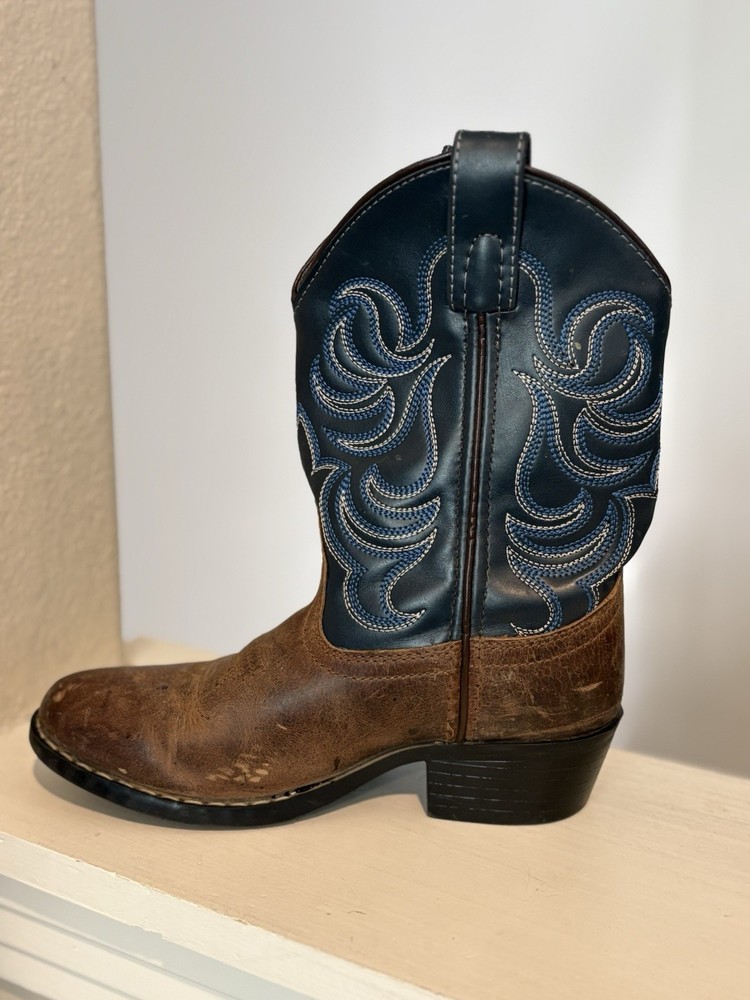 The Cody James Brown Blue Leather Cowboy Boots in youth size 1Y are perfect for any young cowboy or cowgirl. Featuring a round toe shape, pull-on closure, and low heel height, these boots offer comfort and style for casual or travel occasions. The embroidered accents and Western theme add a touch of character to the blue leather boots. Made with a durable rubber outsole and leather lining, these mid-calf boots are both practical and fashionable for any season.