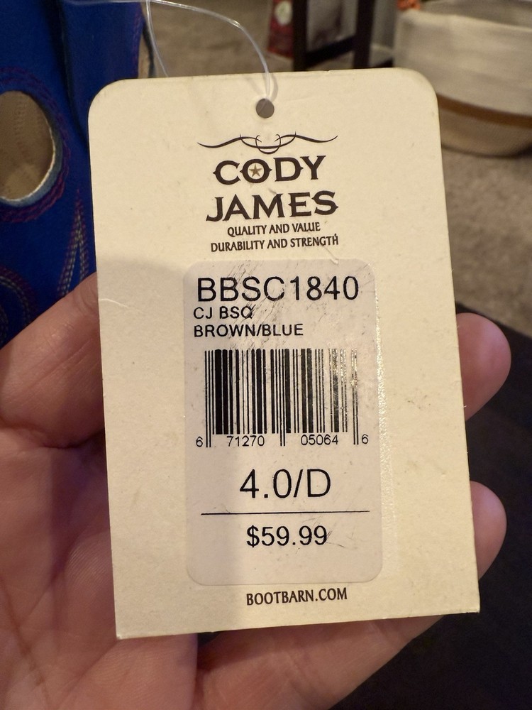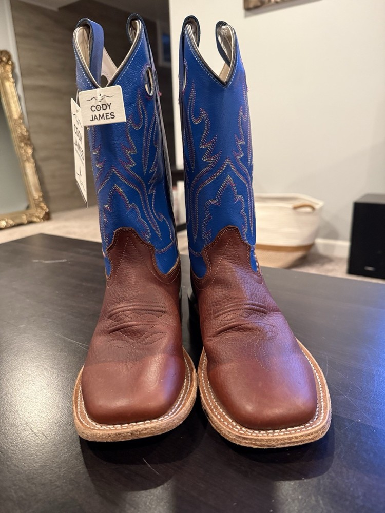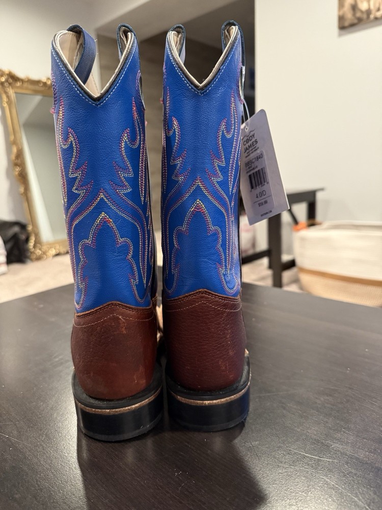 The Cody James Brown & Blue Square Toe Western Boots BBSC1840 are stylish and durable cowboy boots for kids in size 4 and could also fit women’s 5.5-6. These boots feature a unique square toe design and a classic western style, perfect for any young rancher or adventurer. The brown and blue color combination adds a fun and vibrant touch to the traditional western theme, making them a great choice for any young cowboy or cowgirl. With the trusted brand of Cody James, you can be sure these boots are both quality-made and stylish for any young western enthusiast.